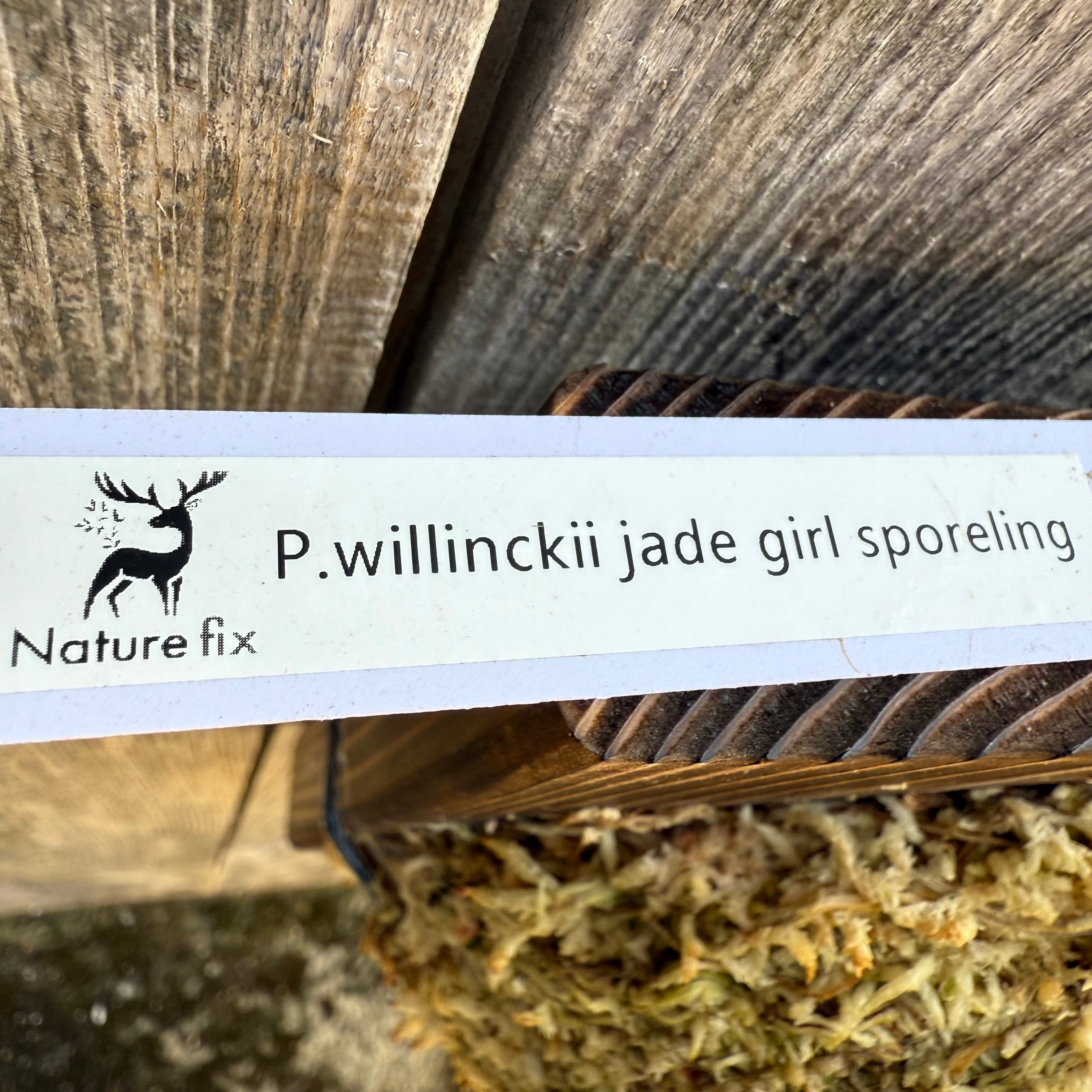 人気のドワーフ品種ウィリンキージェイドガールの胞子培養株になります。既に分岐の多い白い胞子葉が出てきており、安心して育成できるサイズとなっております。今後のさらなる成長が楽しみな一株です。