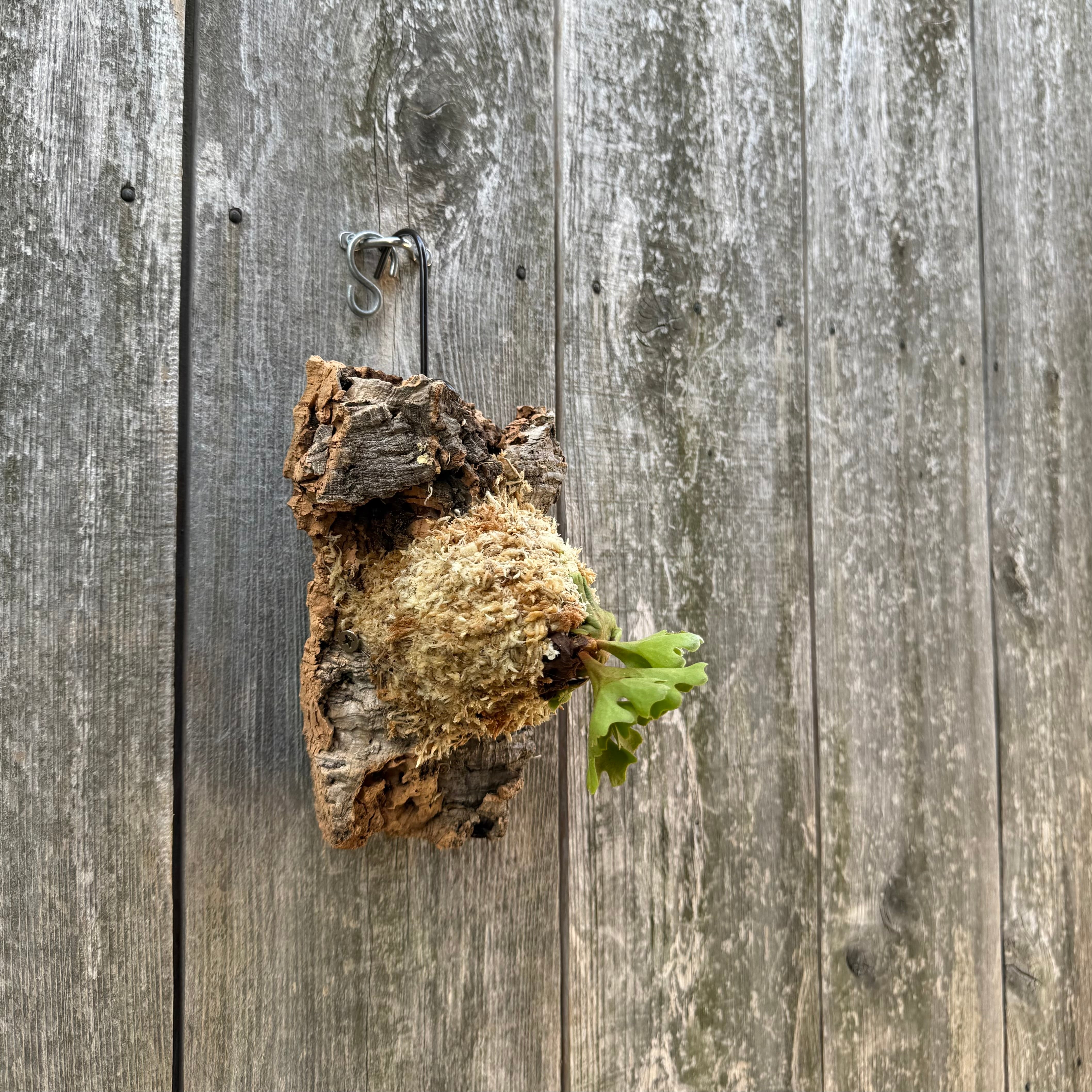 コンパクトながら立ち上がる胞子葉は見事です。コンパクトなコルクに取り付けて仕立ててております。今後の成長が楽しみな一株です。