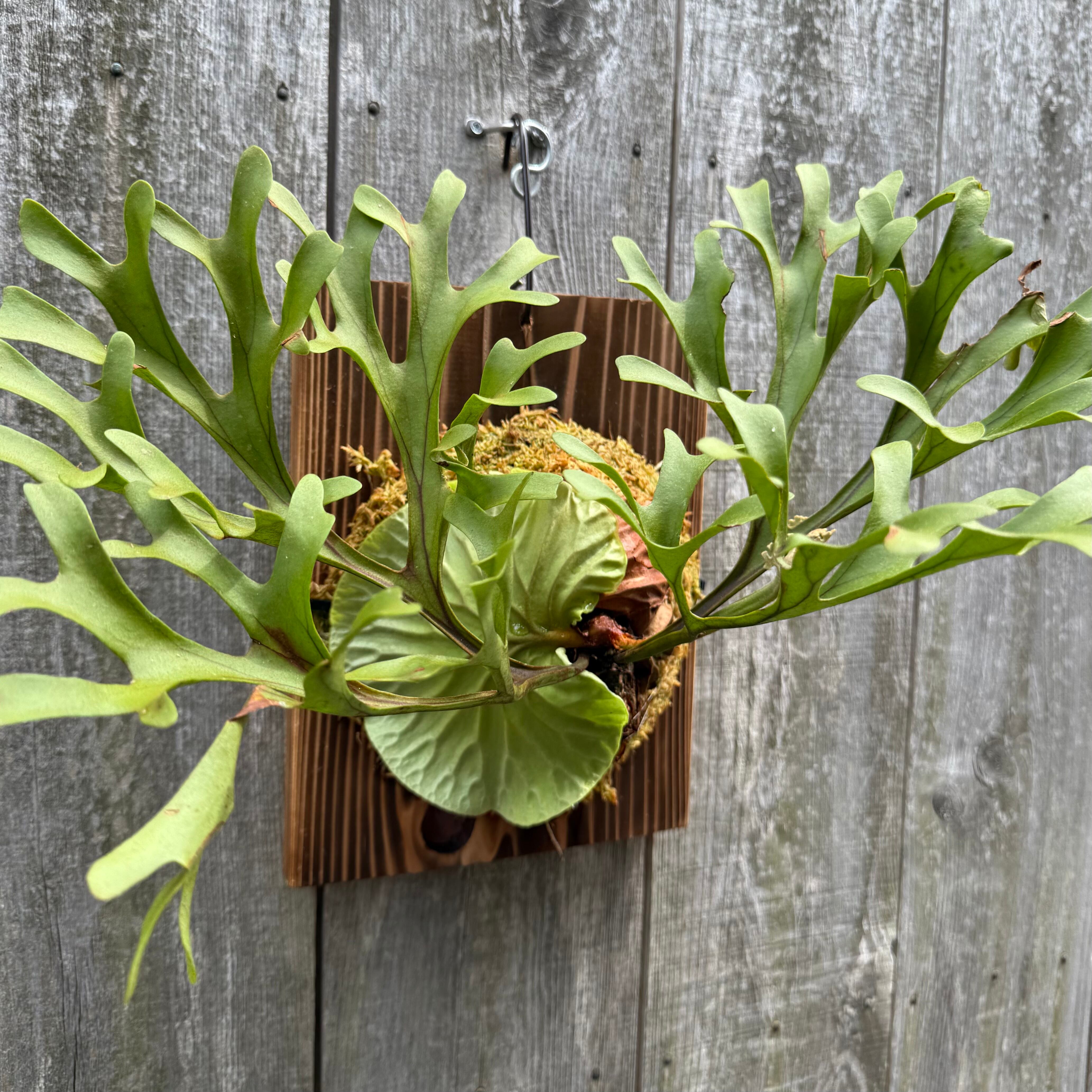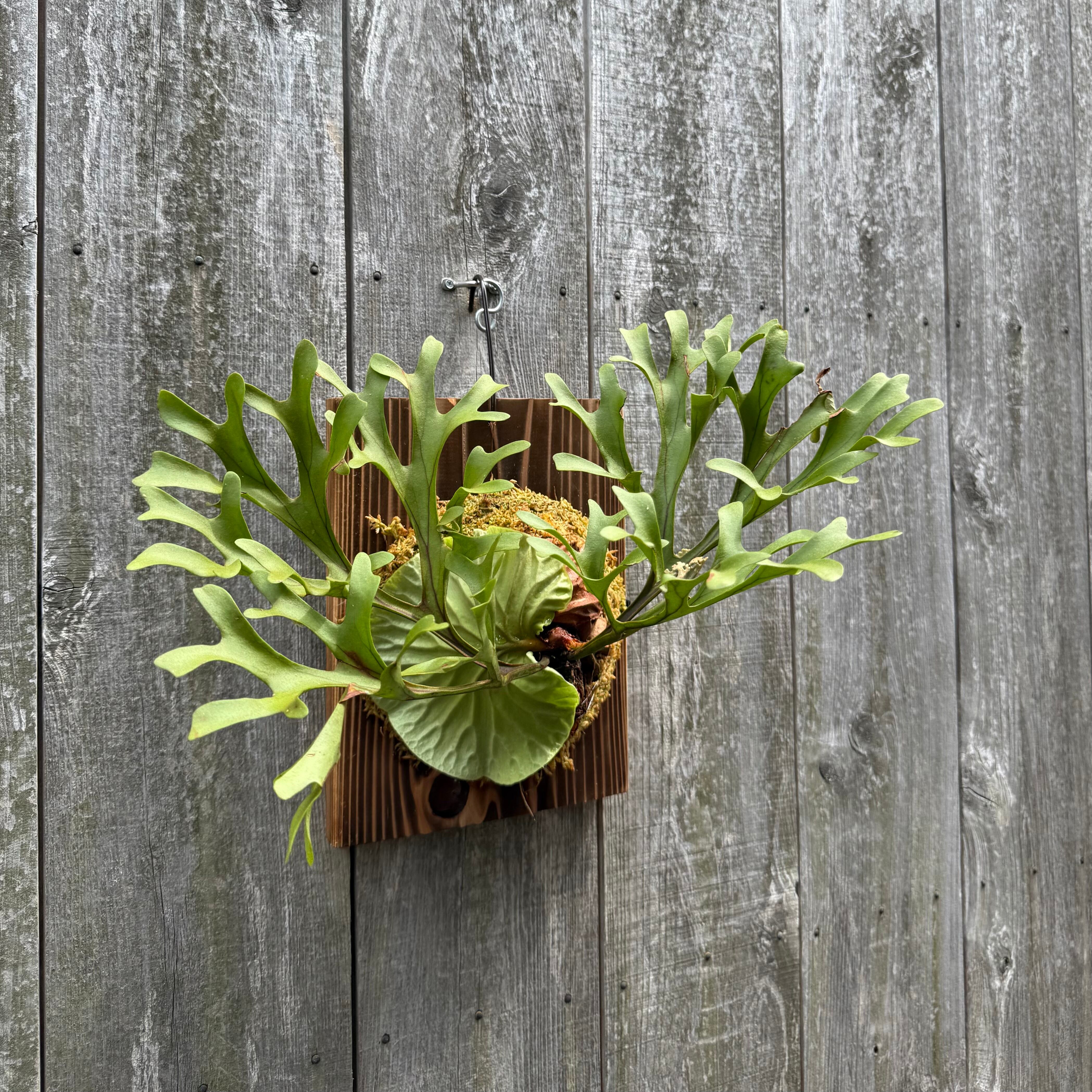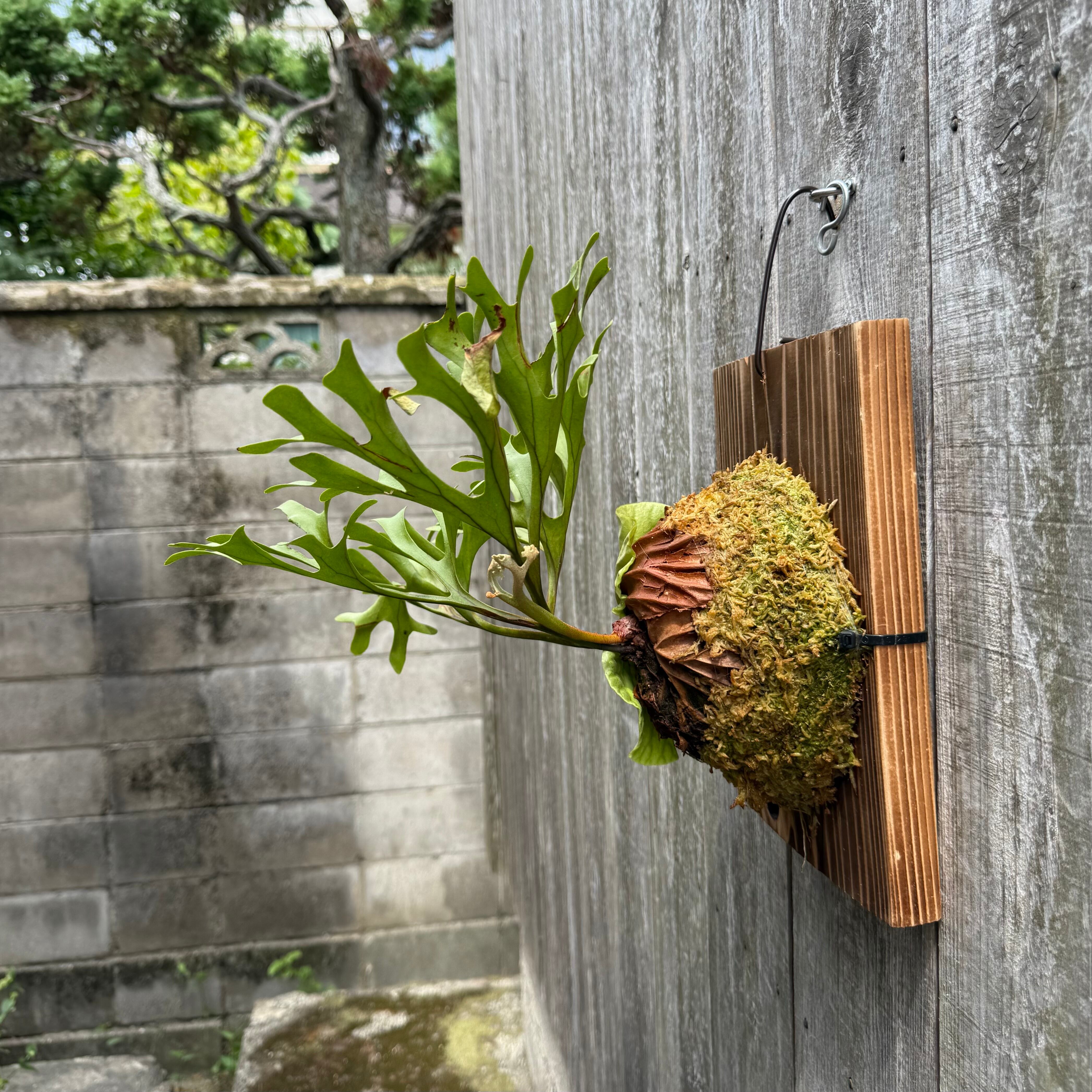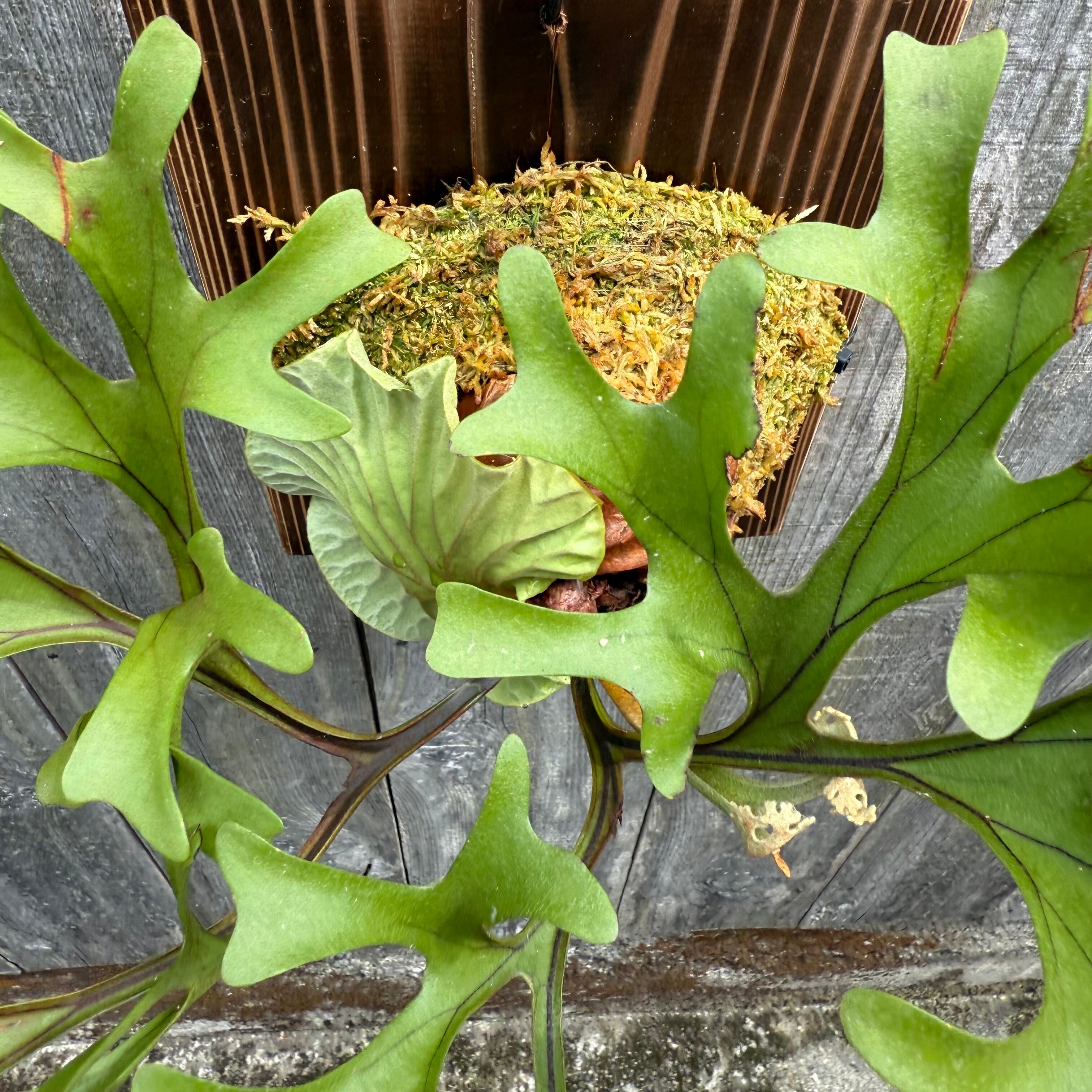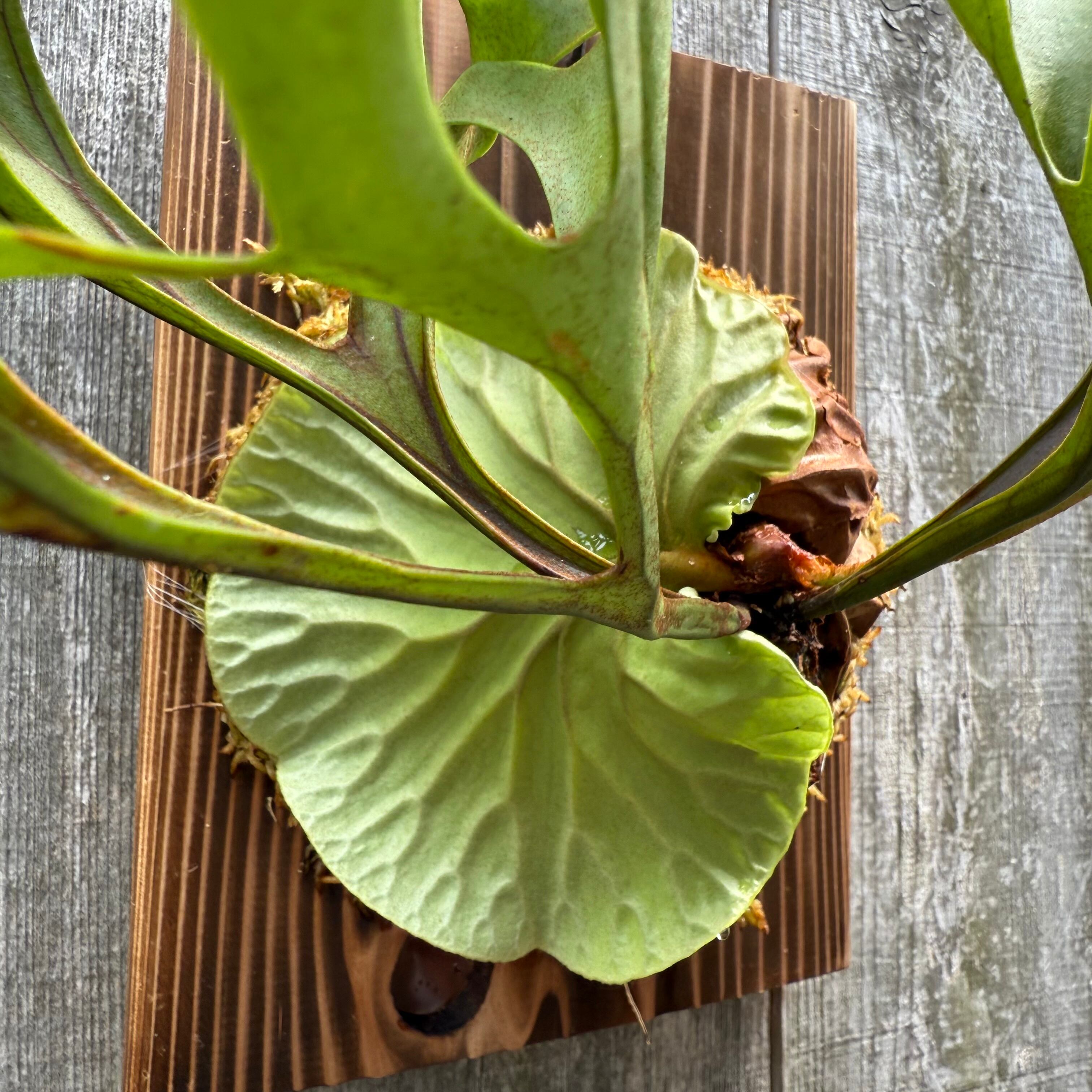 ワイルド株ならではの胞子葉、貯水葉には痛みや傷はありますが、胞子栽培よりも強靭で味があります。成長点からは新しい葉の成長もしっかりとあります。管理しやすい焼板につけております。お部屋のインテリアにいかがでしょうか。