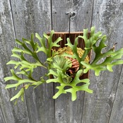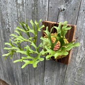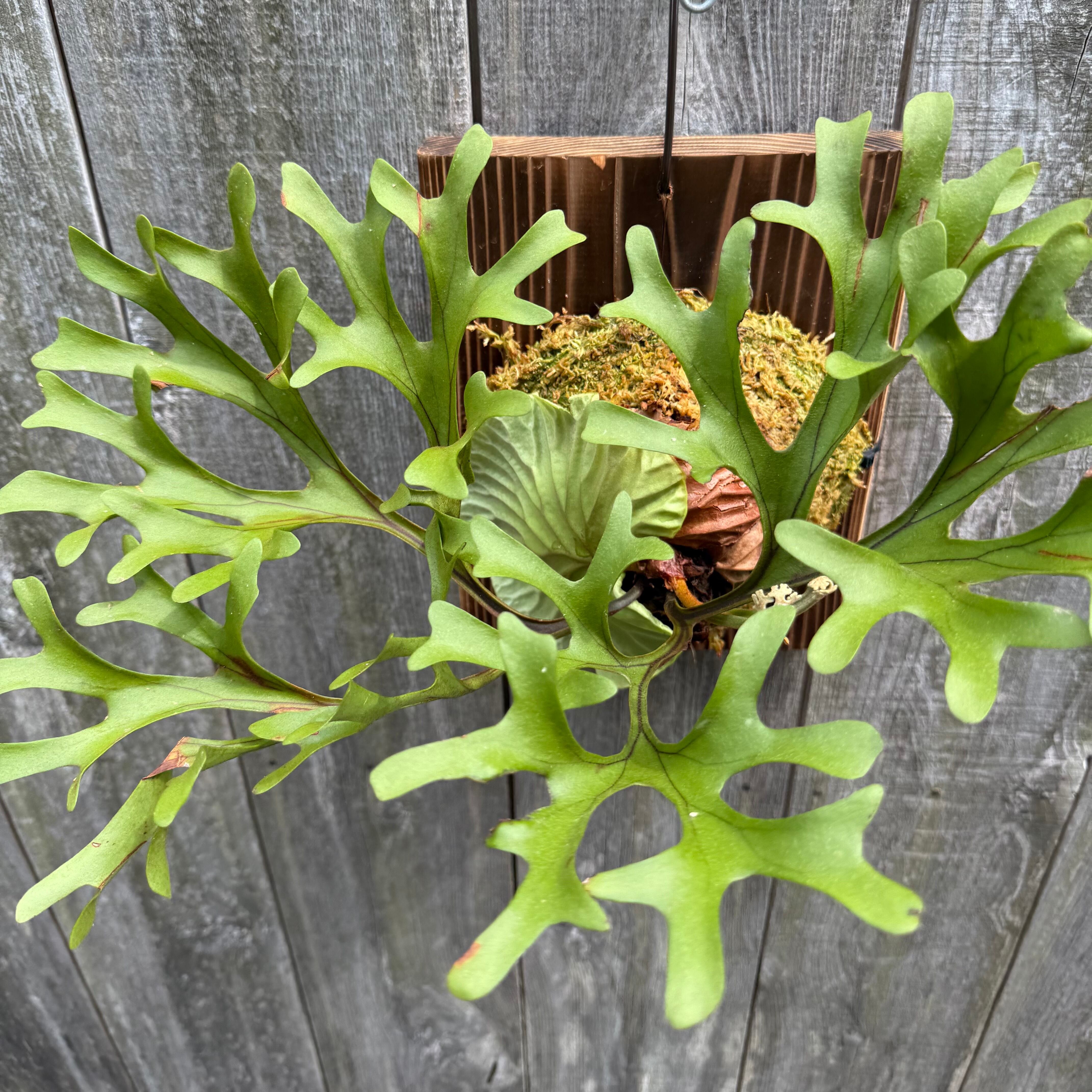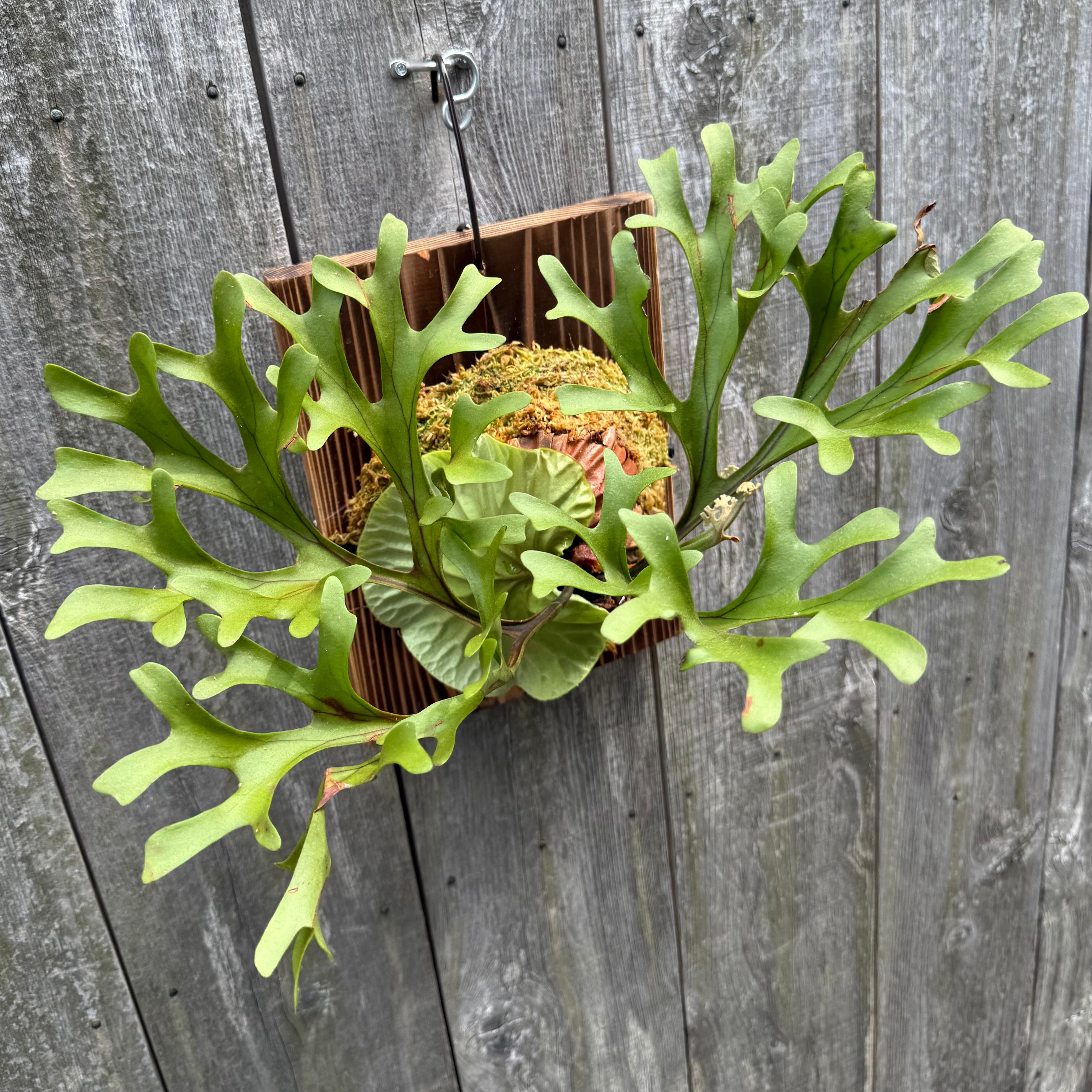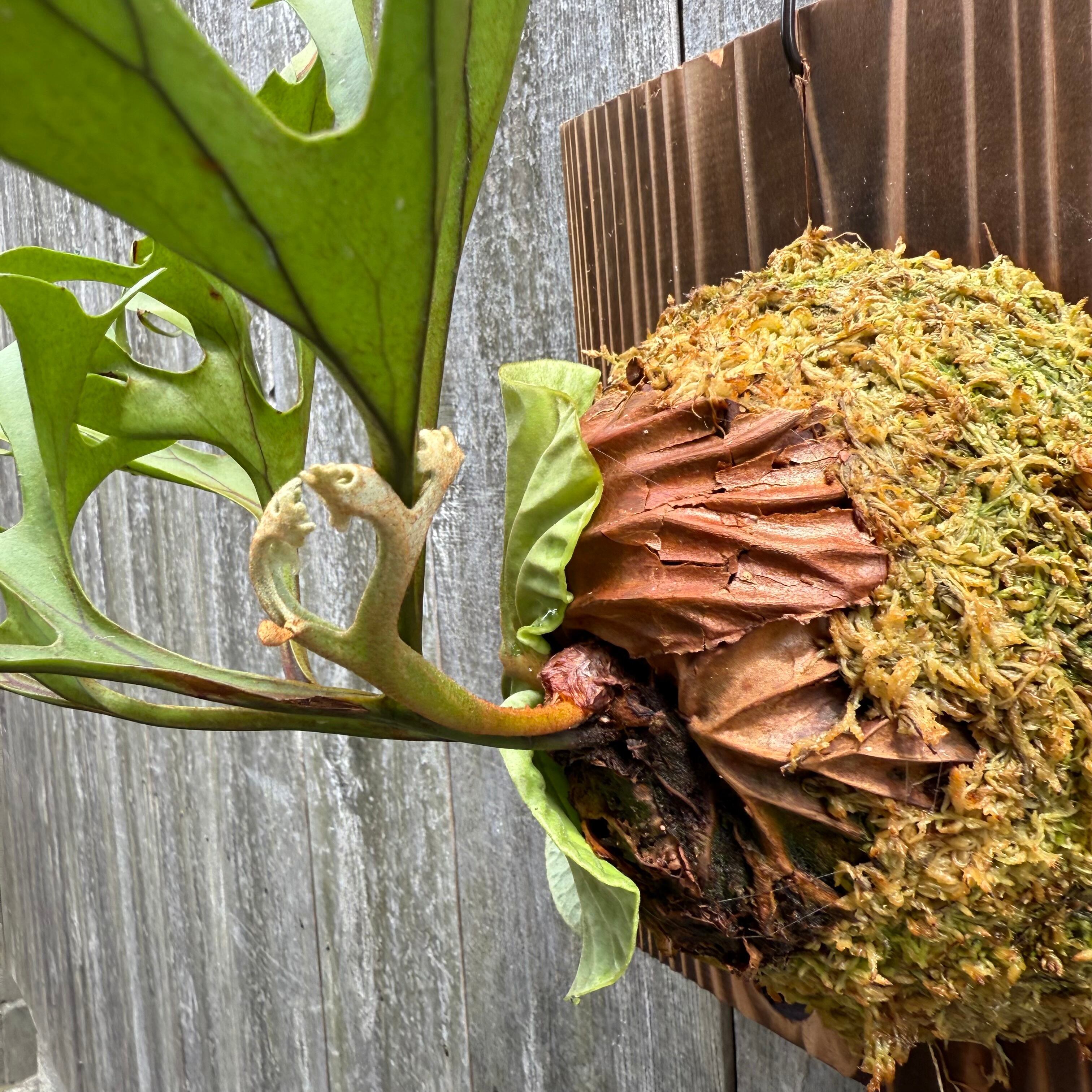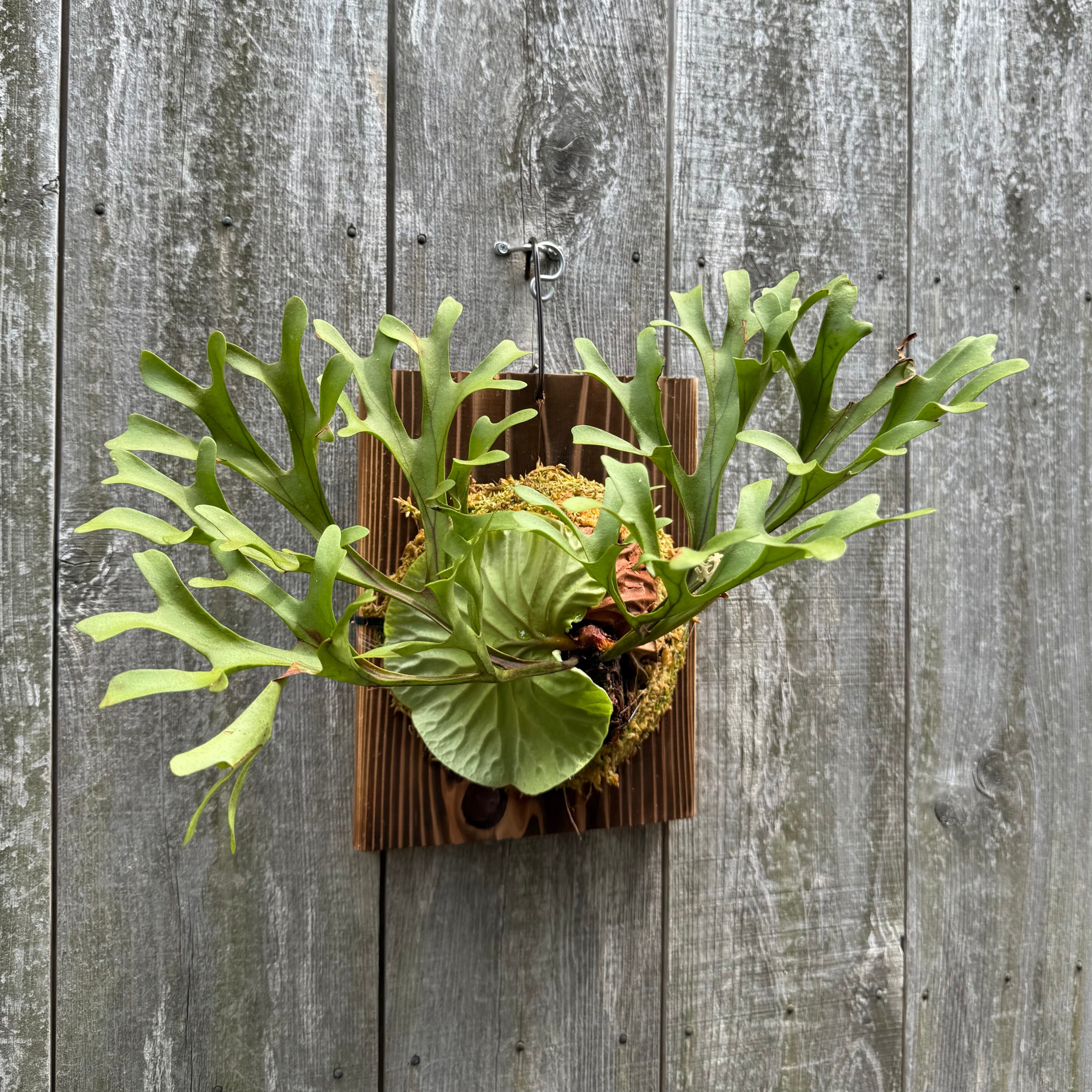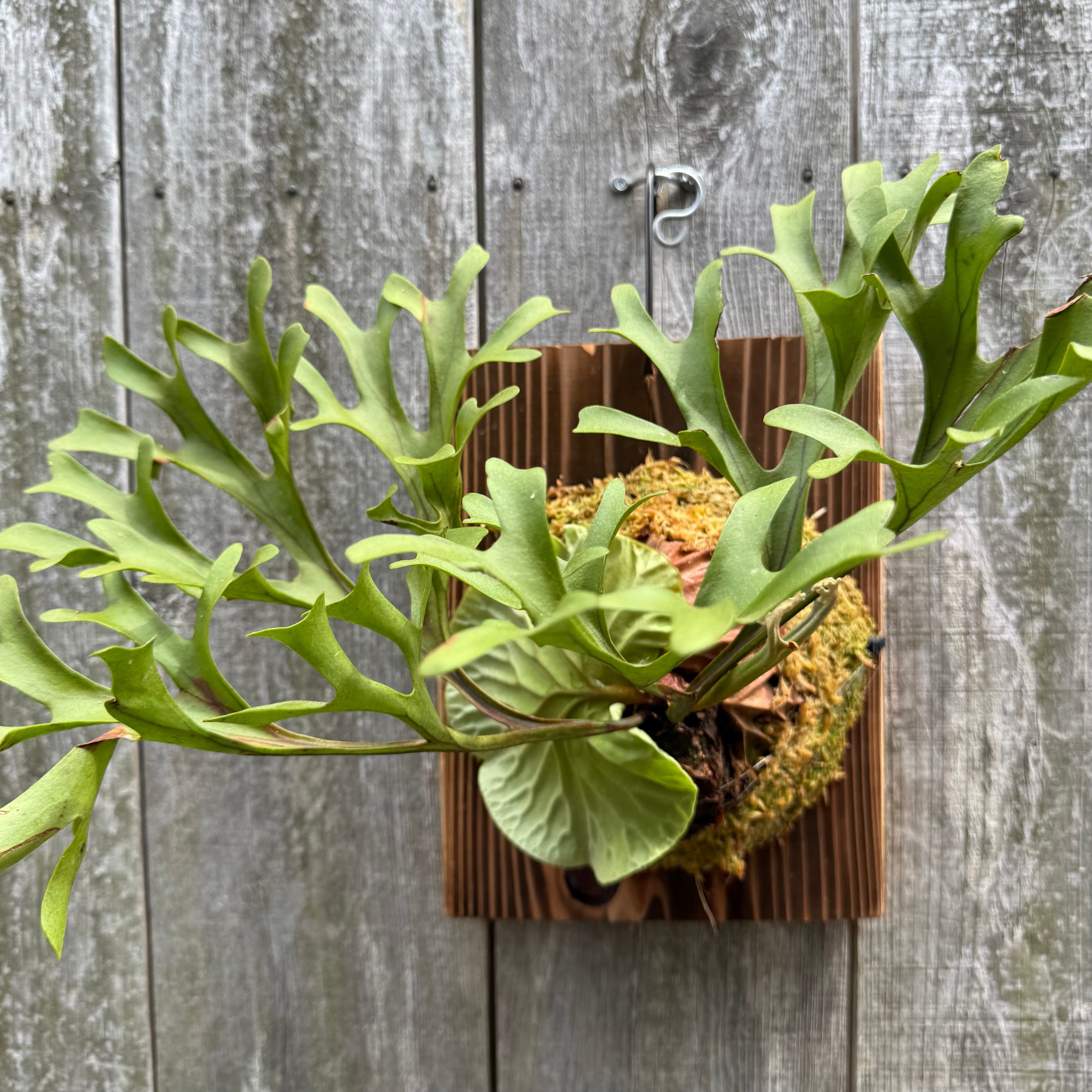 ワイルド株ならではの胞子葉、貯水葉には痛みや傷はありますが、胞子栽培よりも強靭で味があります。成長点からは新しい葉の成長もしっかりとあります。管理しやすい焼板につけております。お部屋のインテリアにいかがでしょうか。