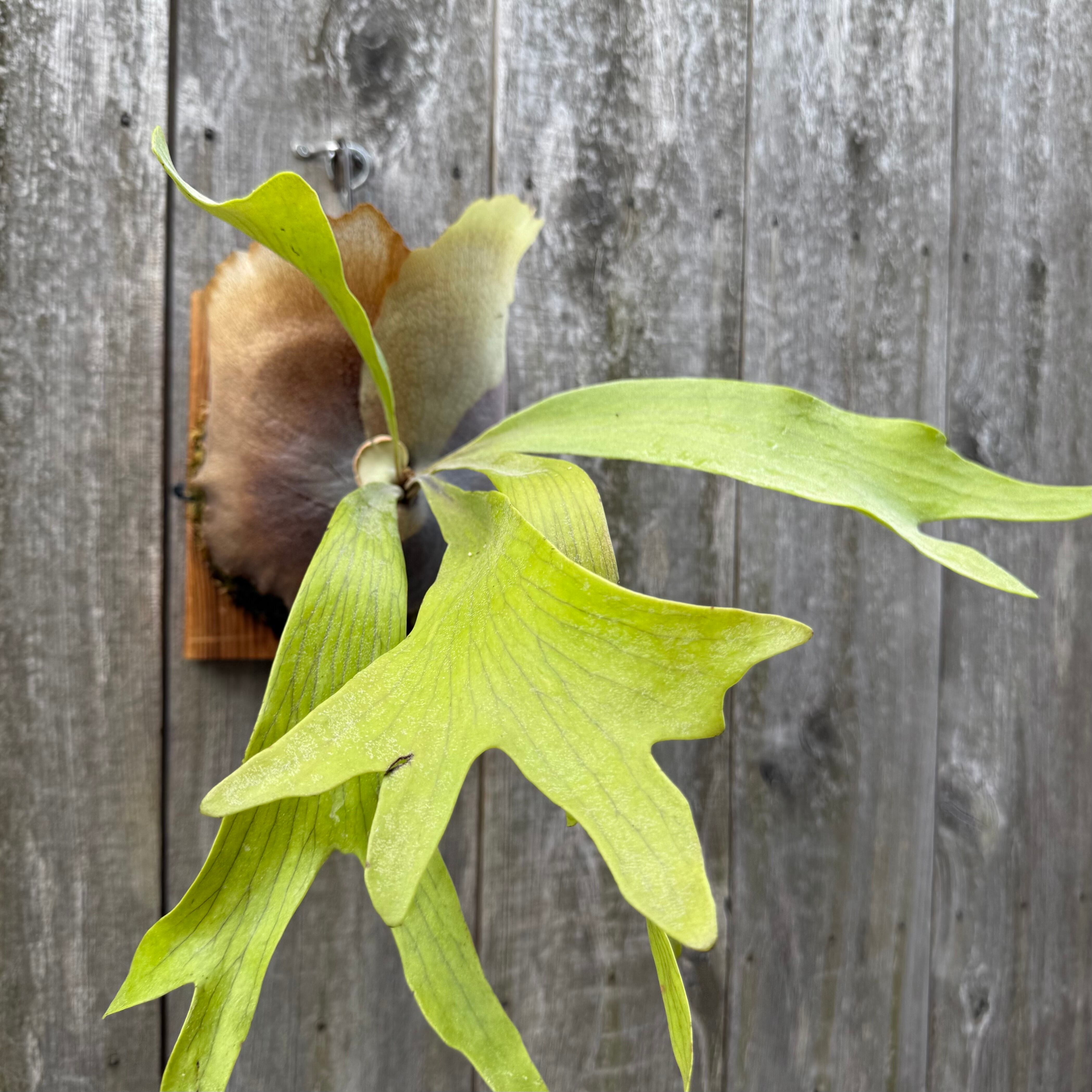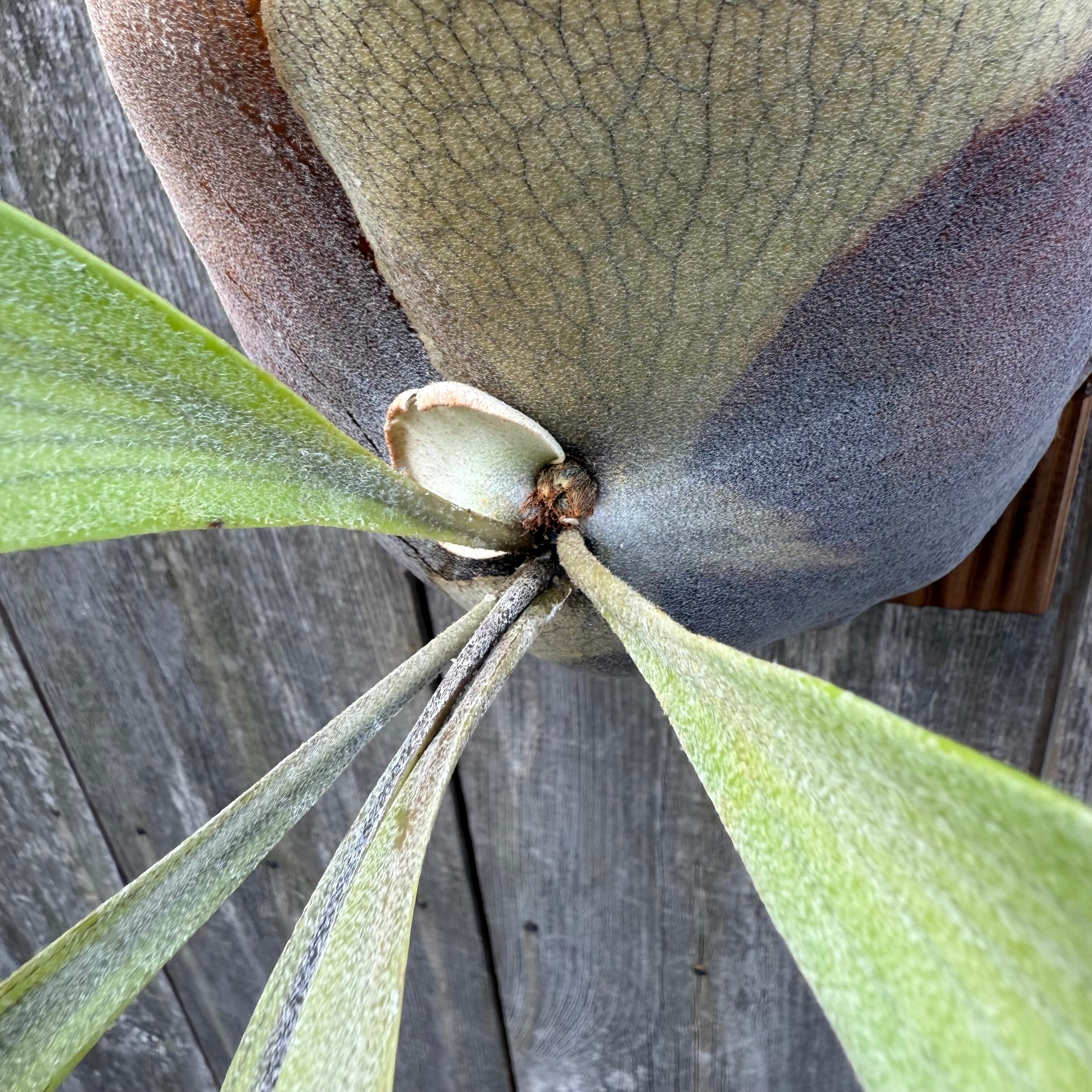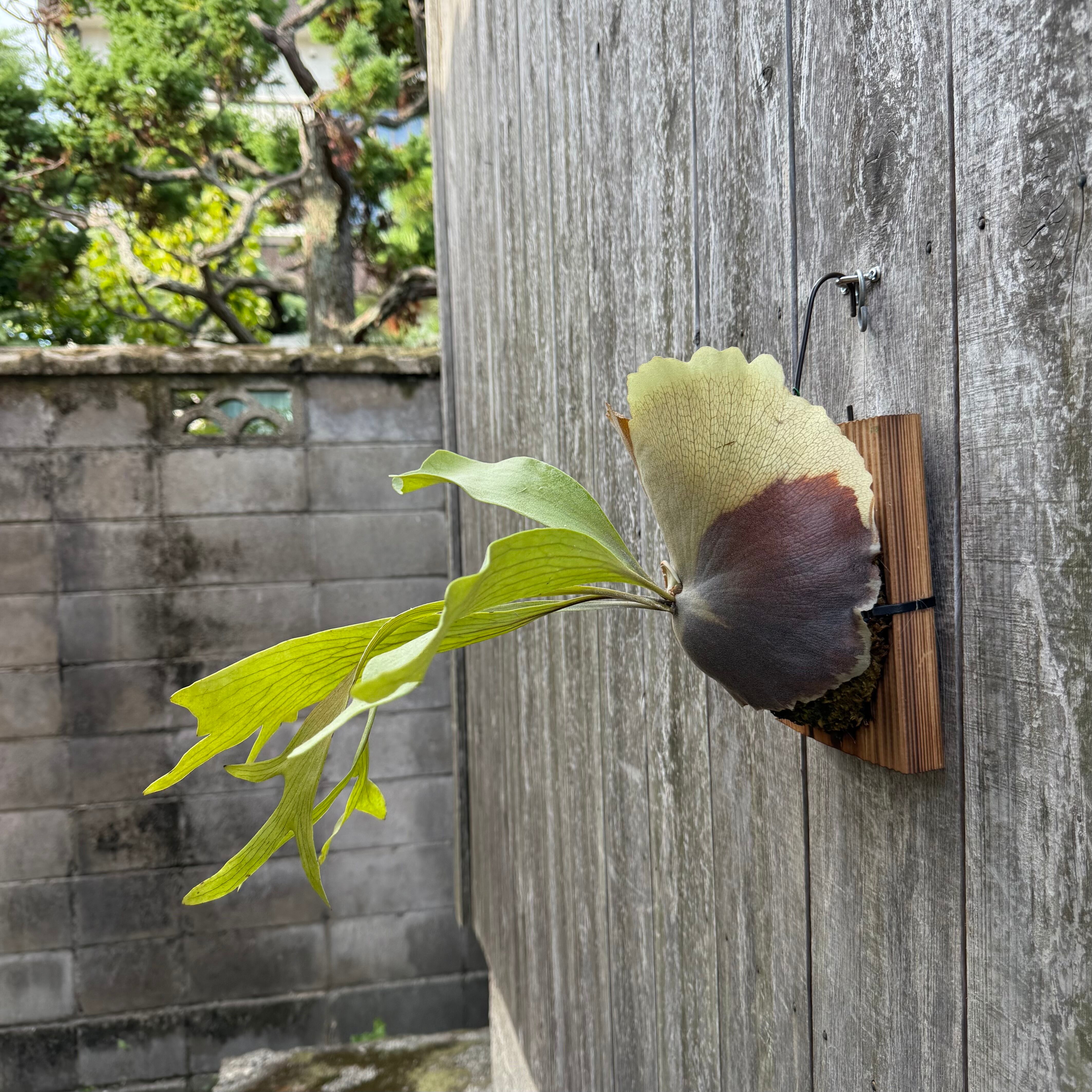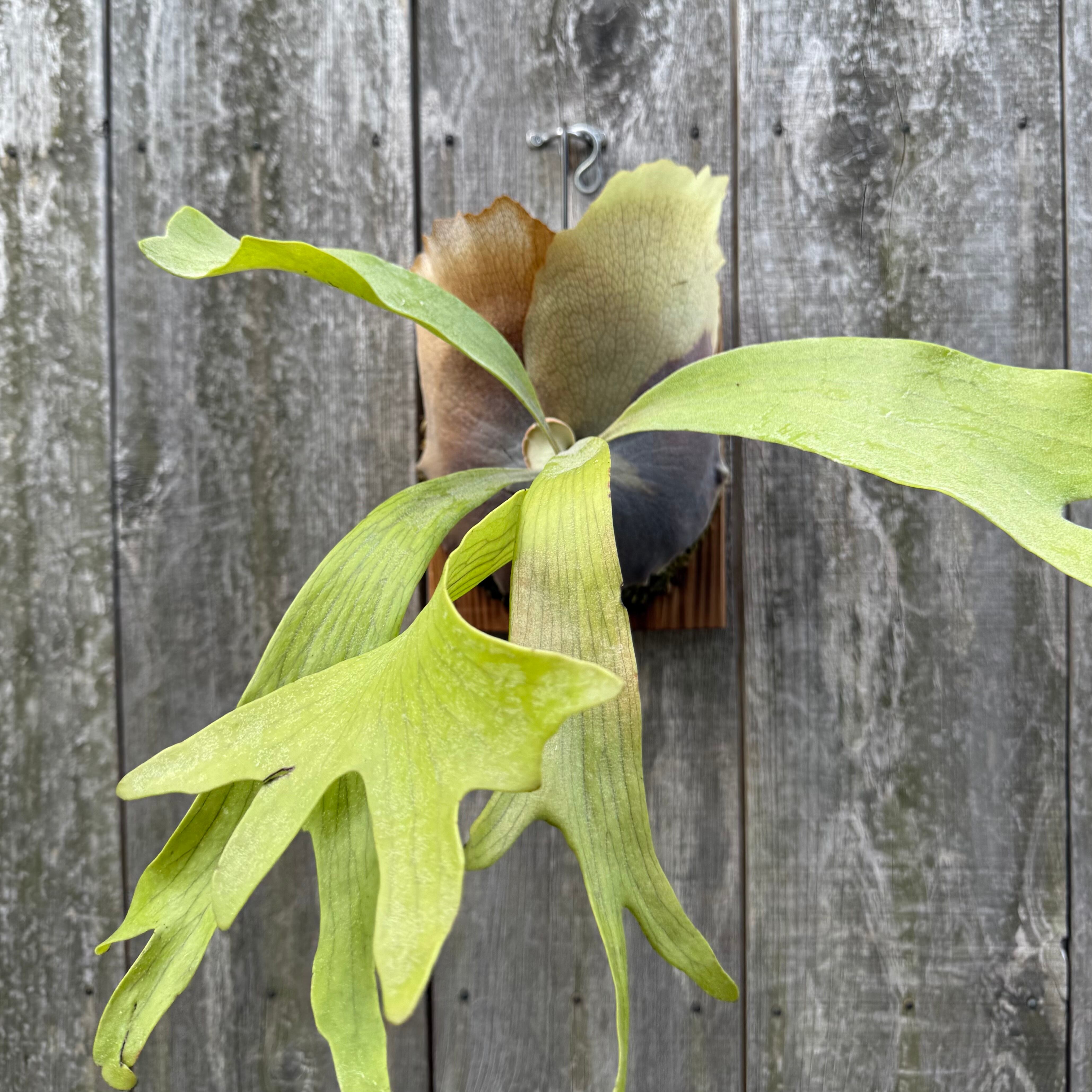 上向きに伸びてから垂れる胞子葉が特徴的なビカクシダ