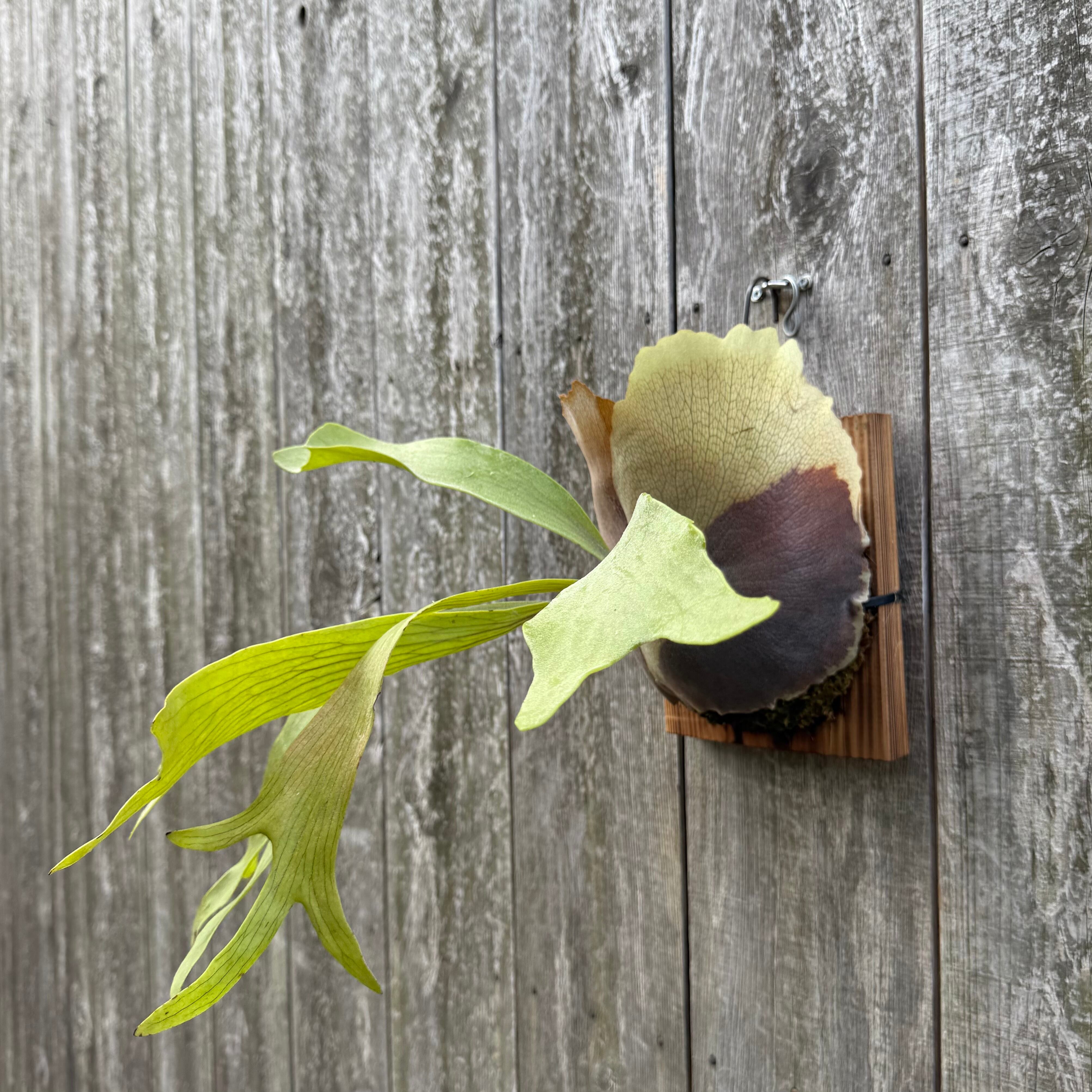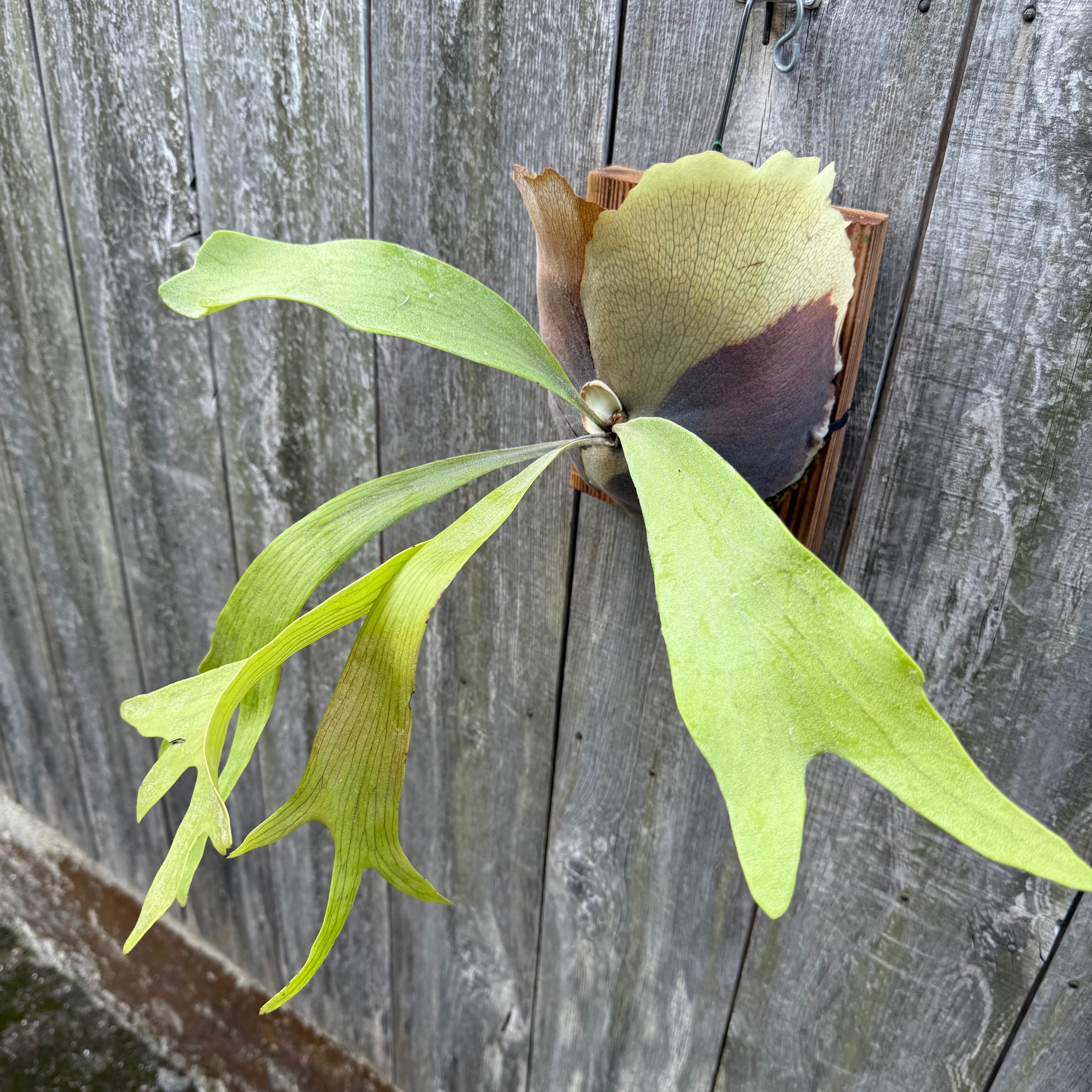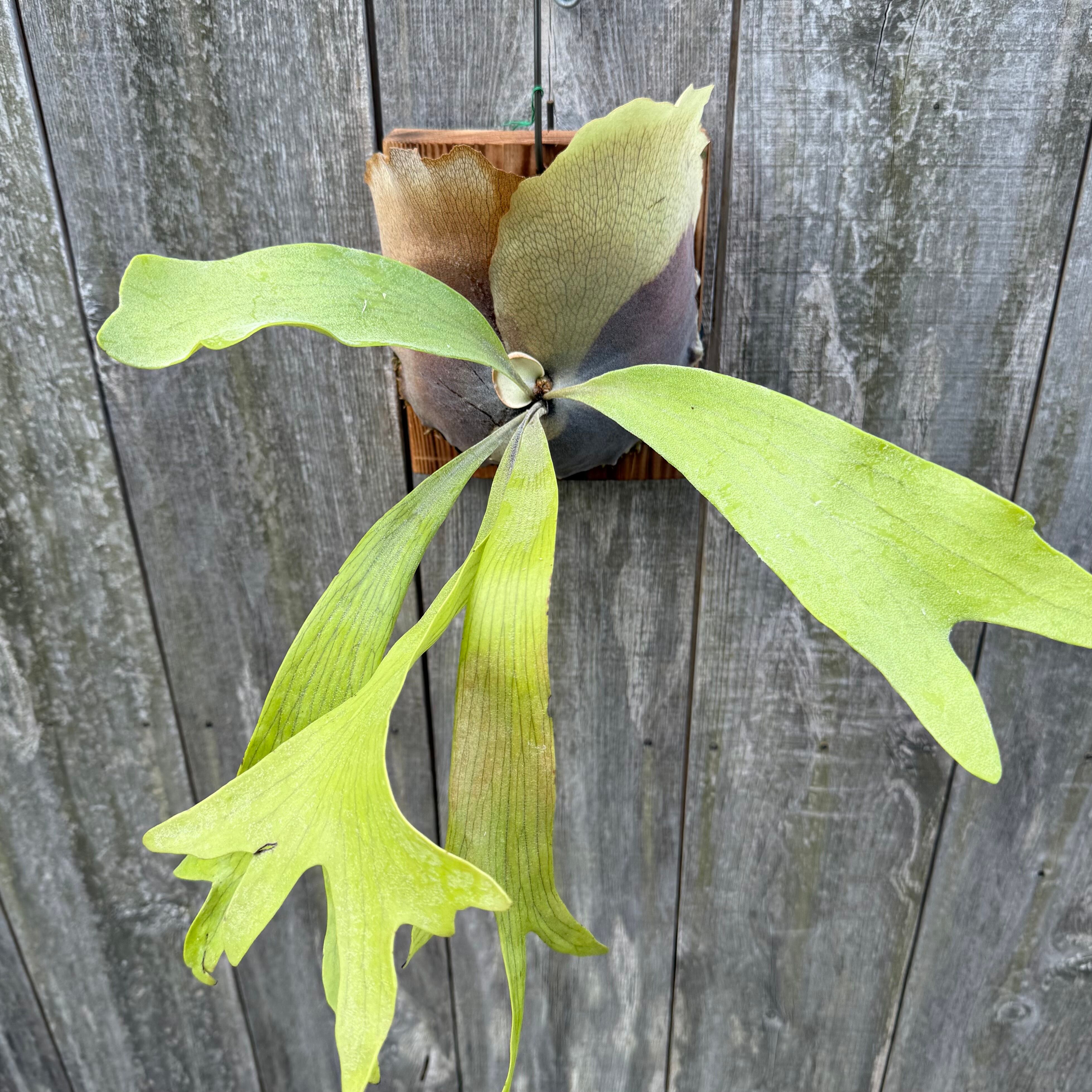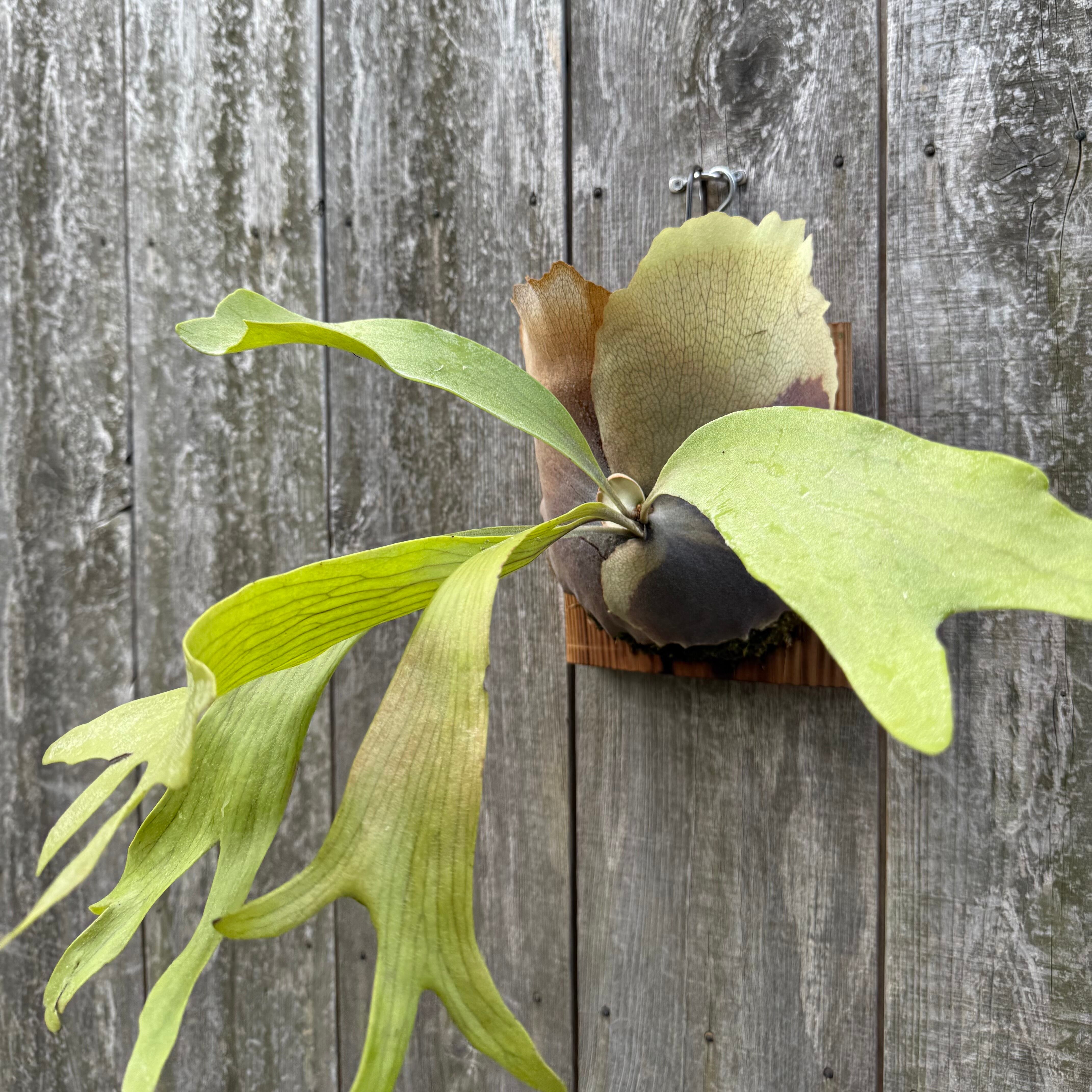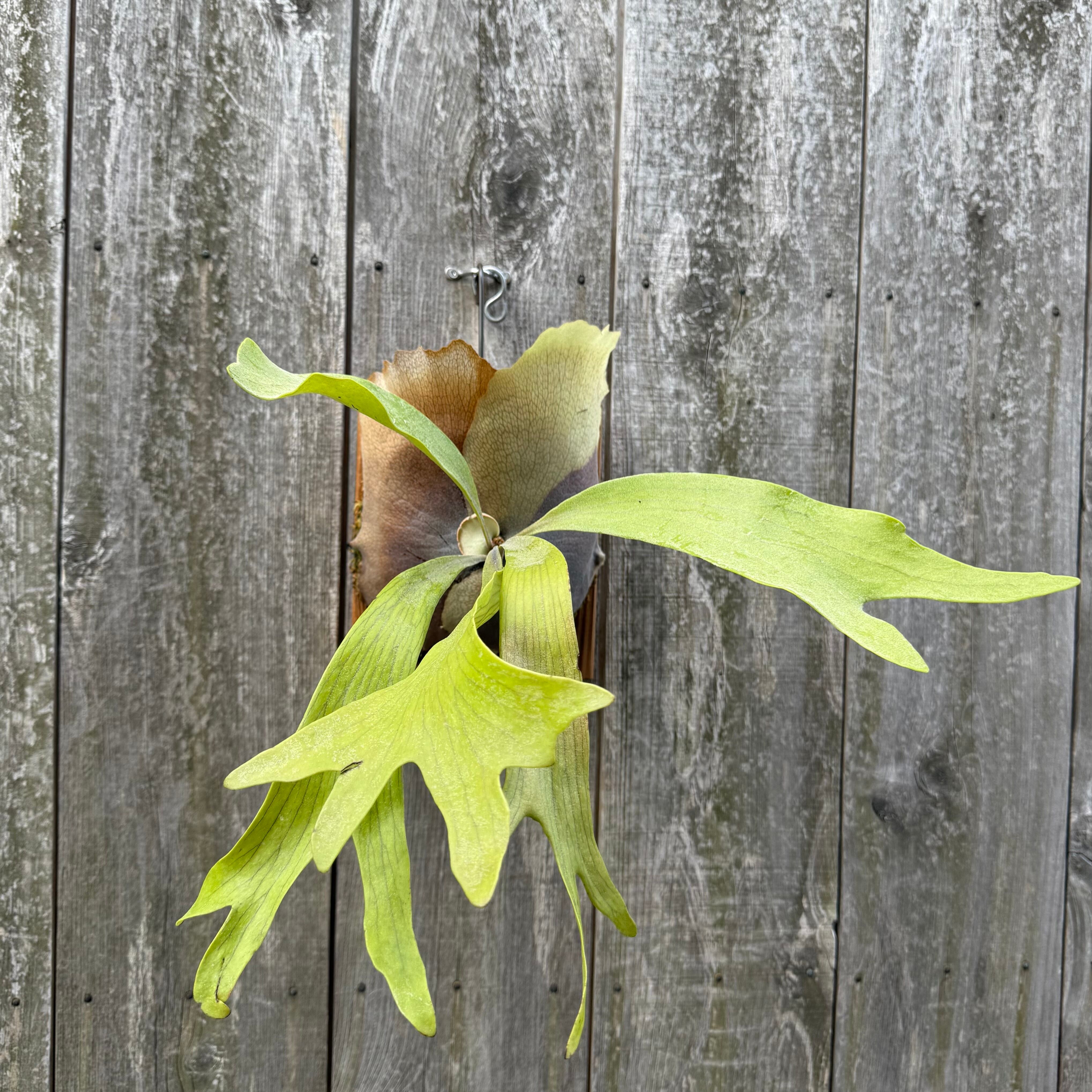 上向きに伸びてから垂れる胞子葉が特徴的なビカクシダ