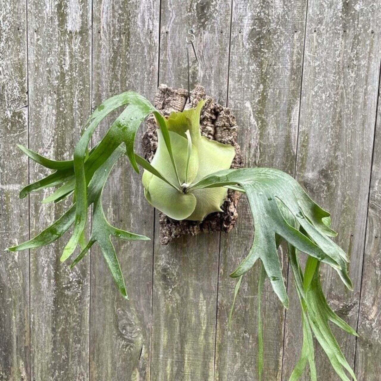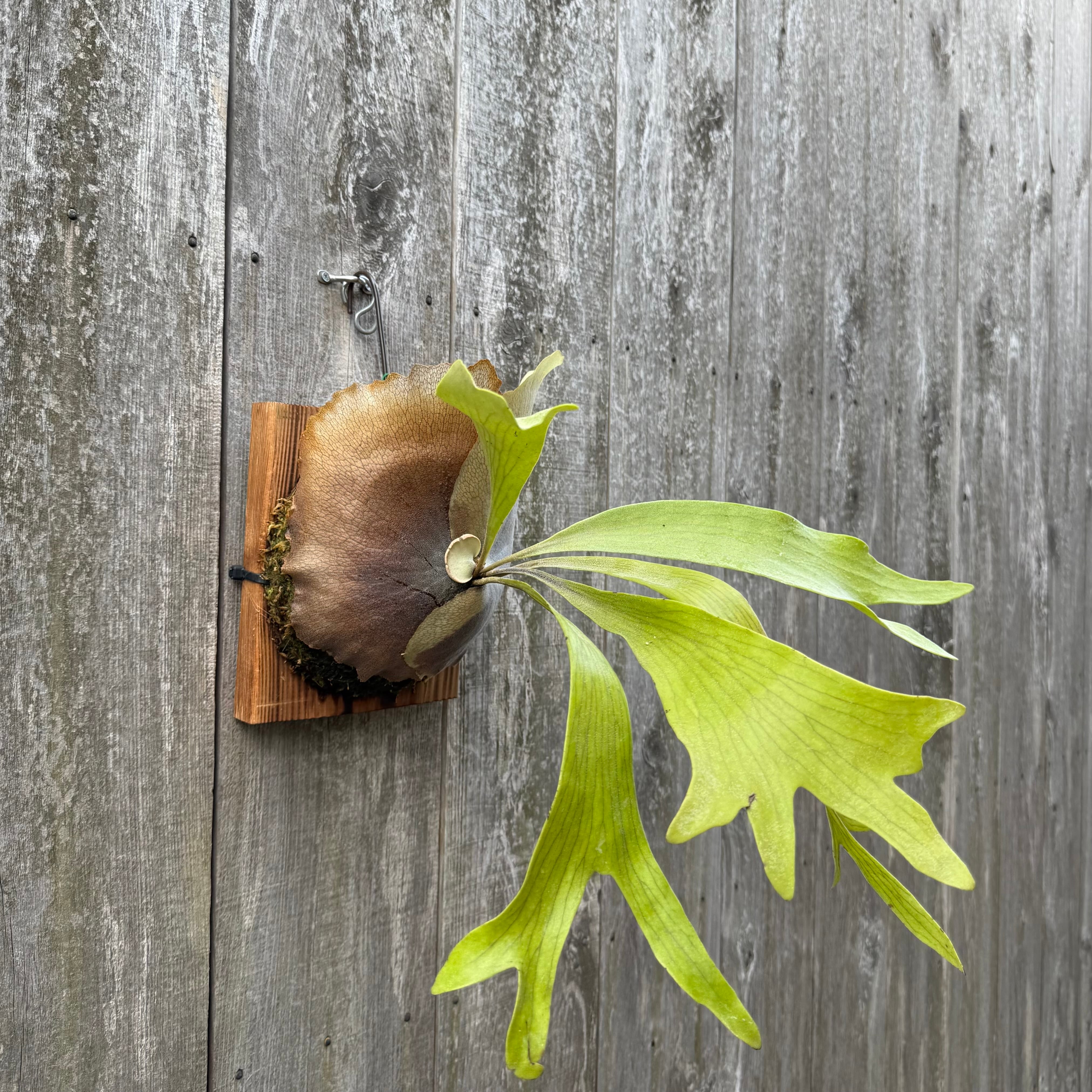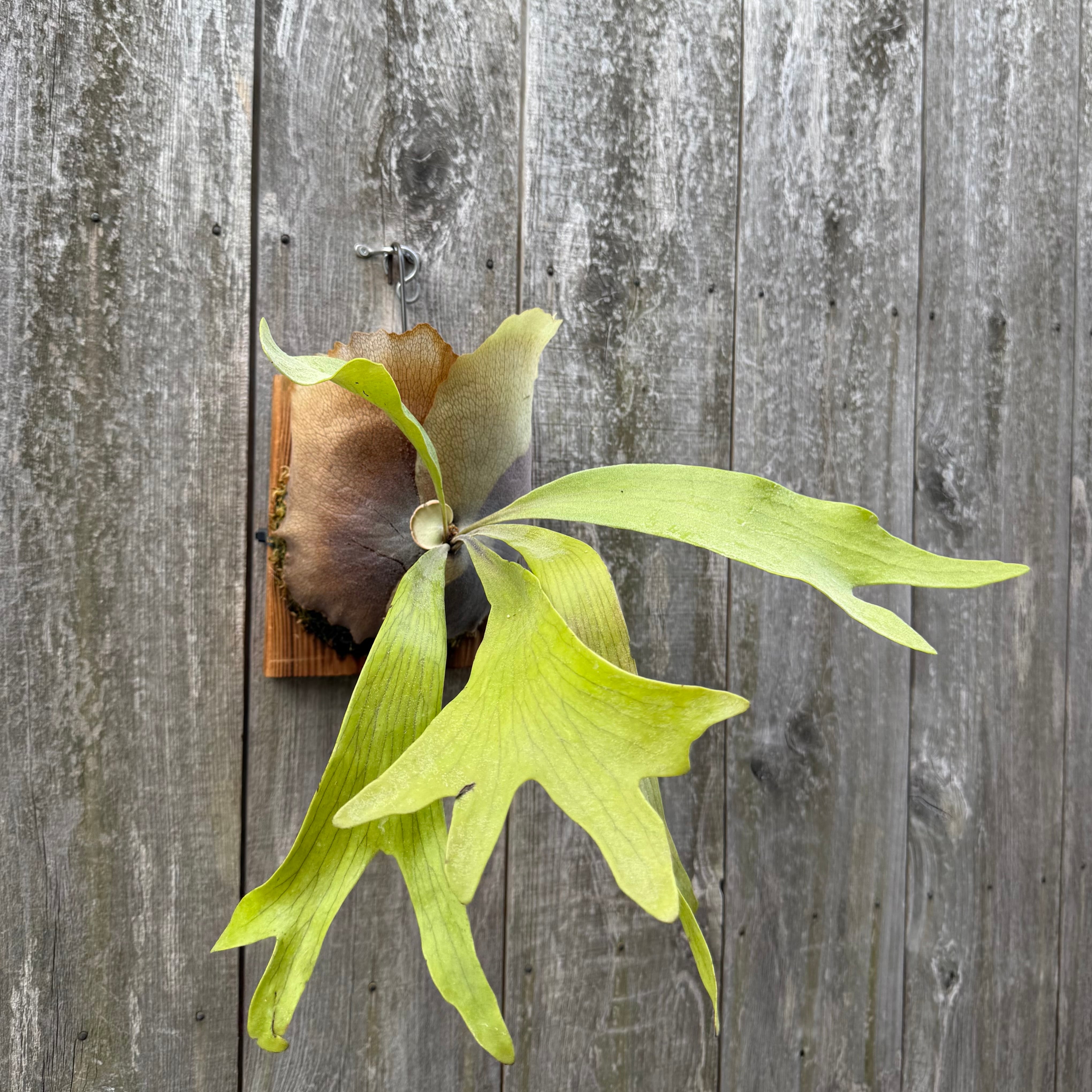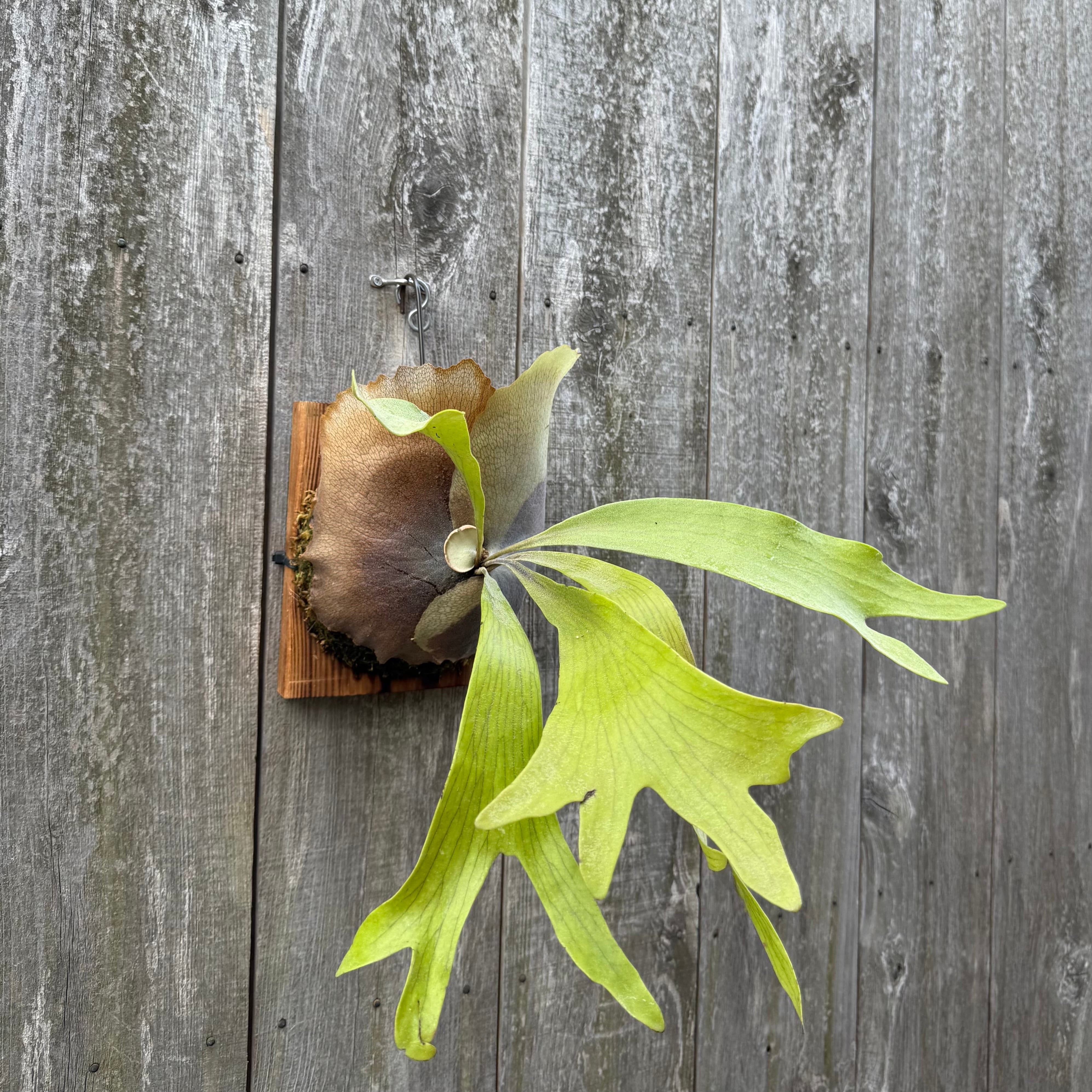 上向きに伸びてから垂れる胞子葉が特徴的なビカクシダ