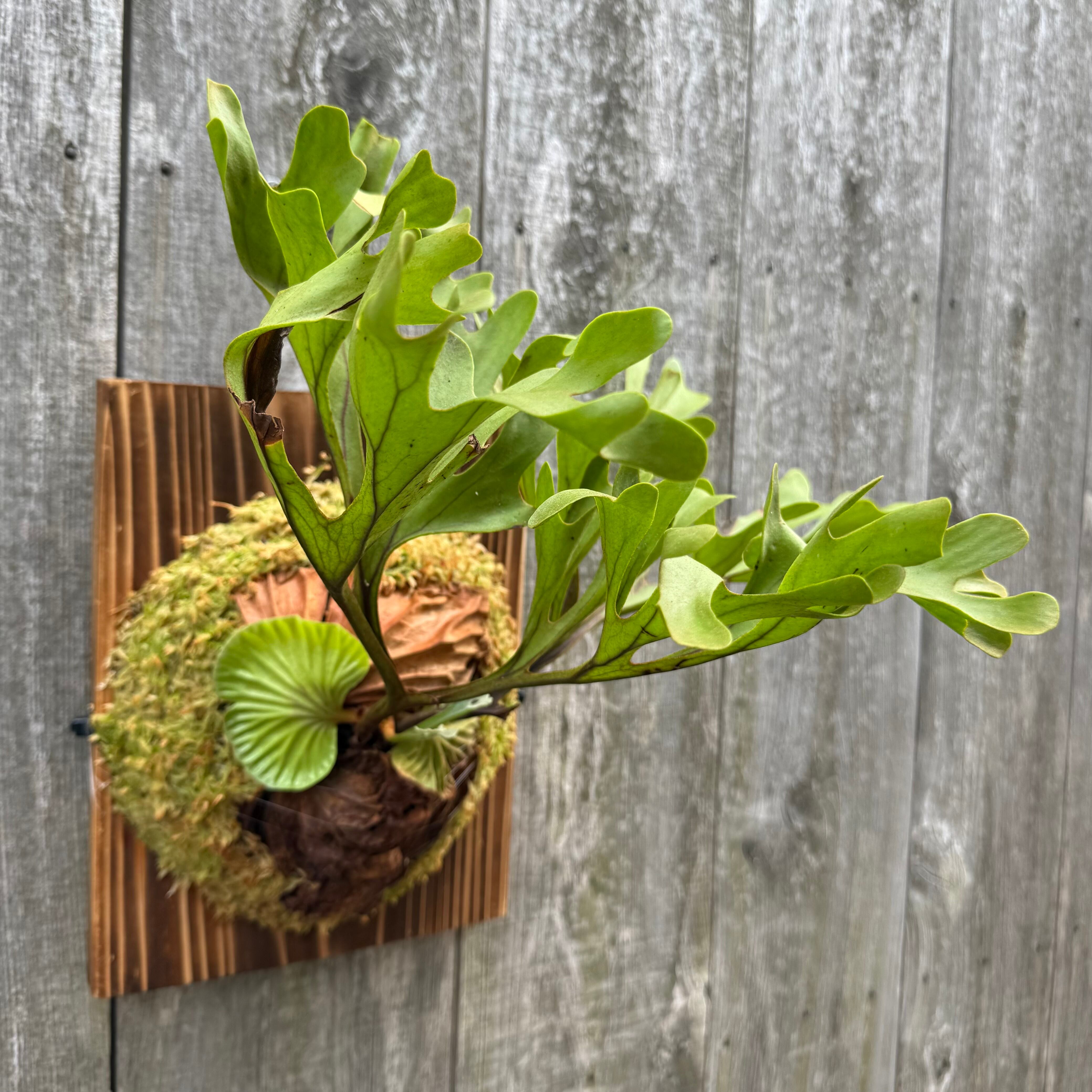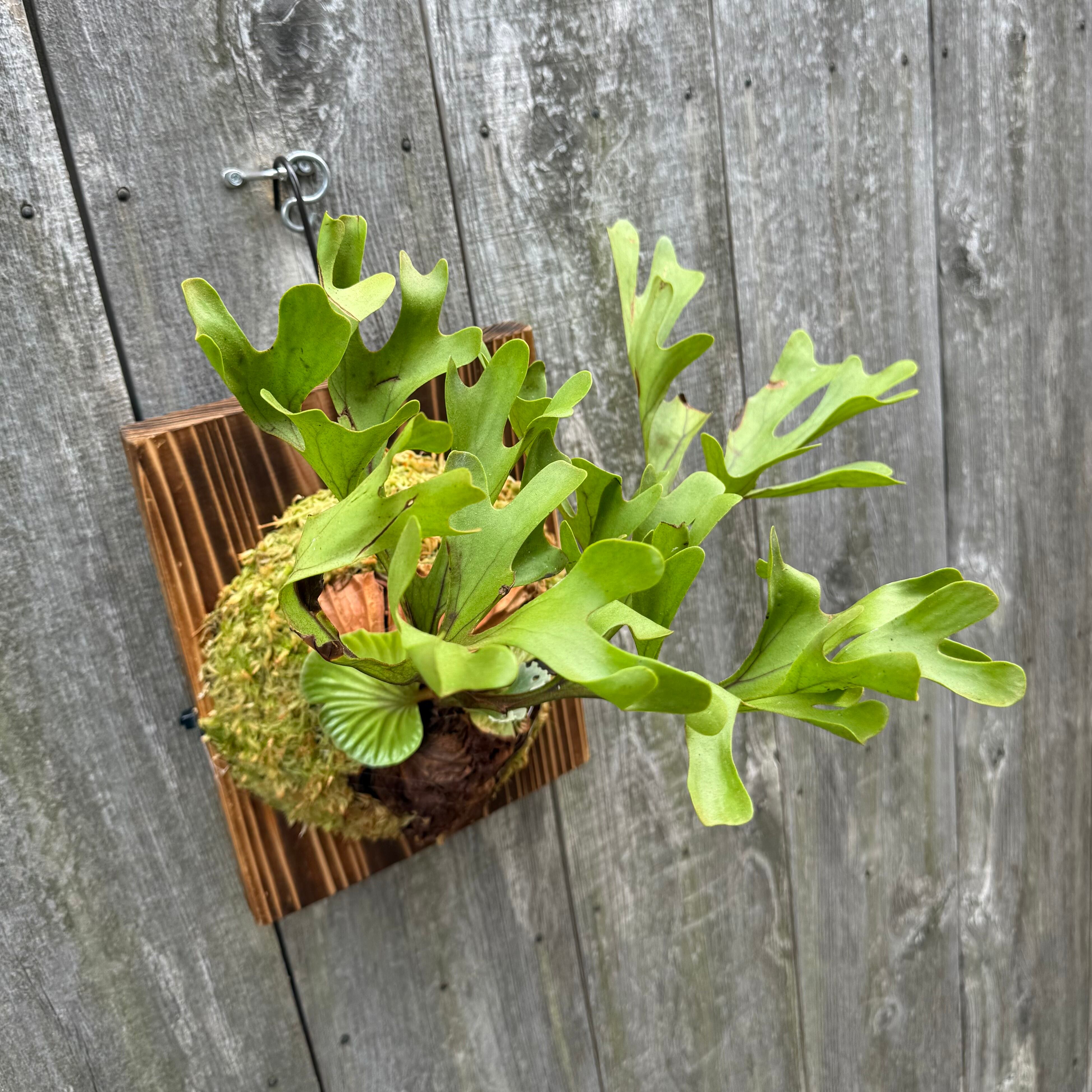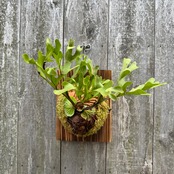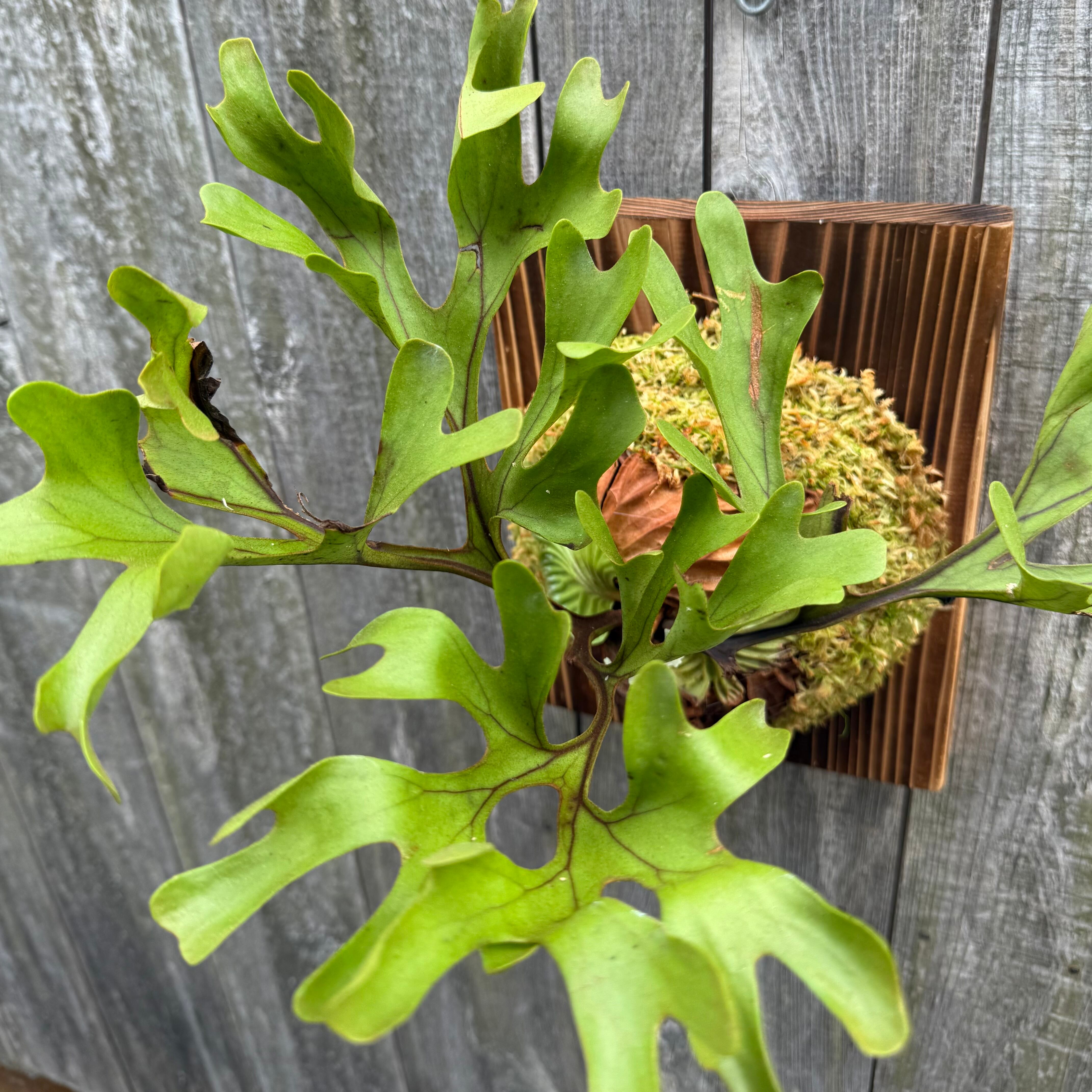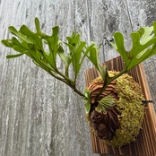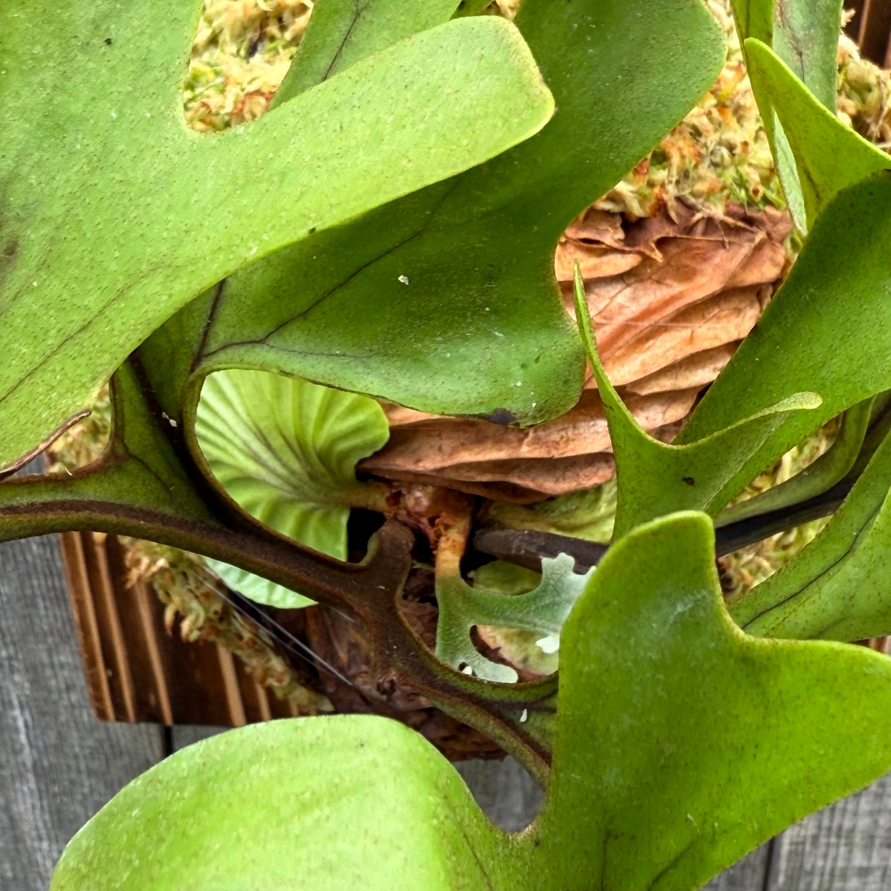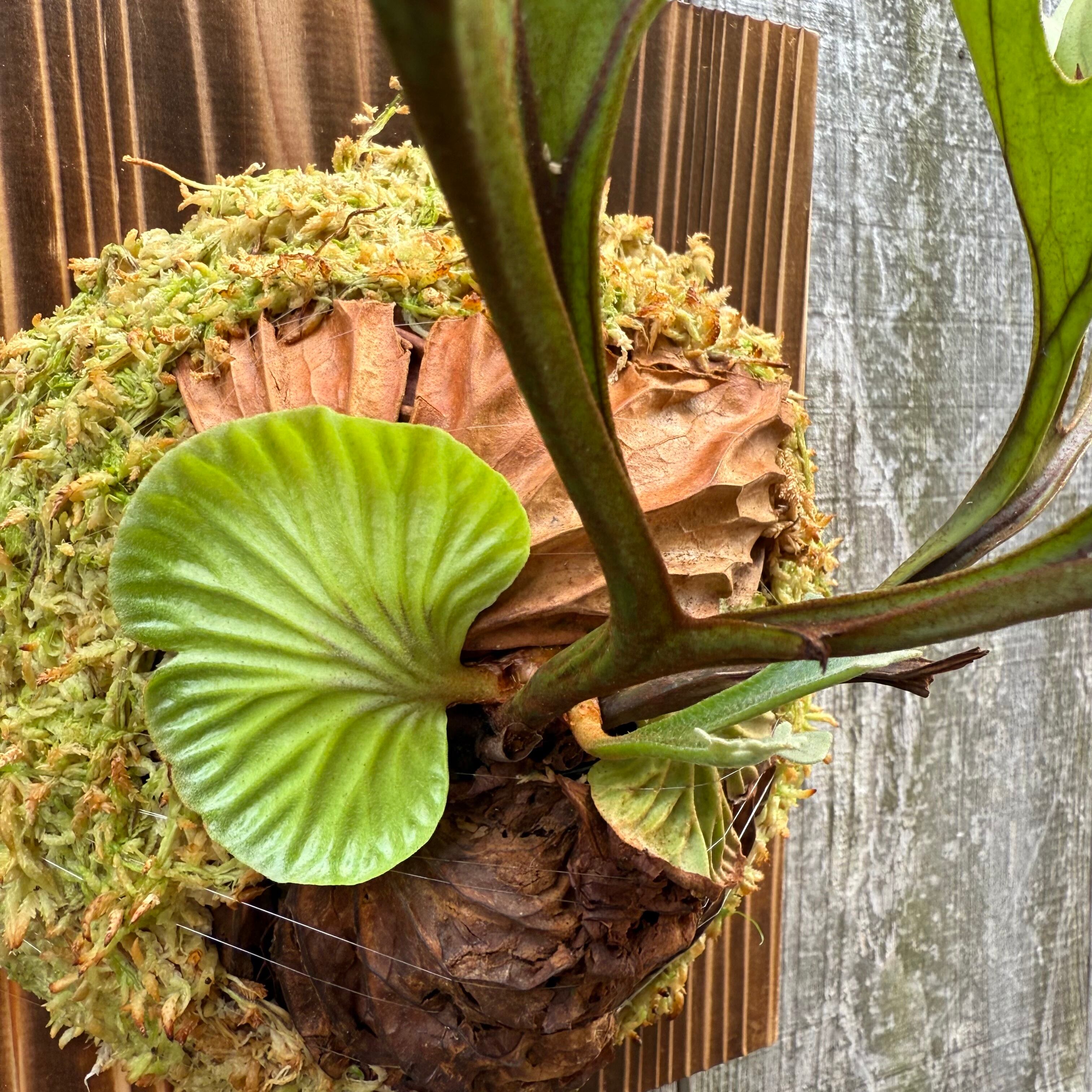 ワイルド株ならではの胞子葉、貯水葉には痛みや傷はありますが、胞子栽培よりも強靭で味があります。成長点からは新しい葉の成長もしっかりとあります。管理しやすい焼板につけております。お部屋のインテリアにいかがでしょうか。