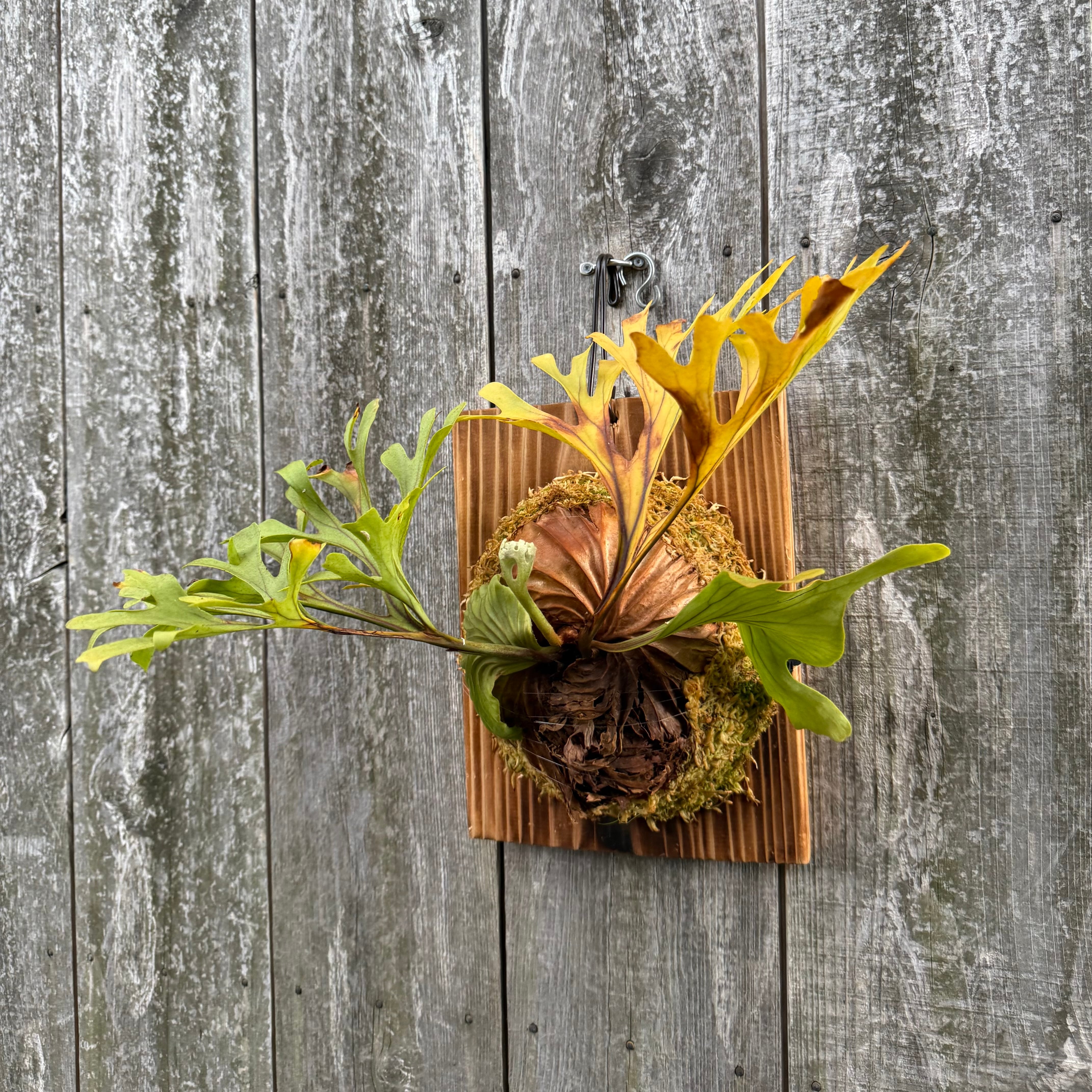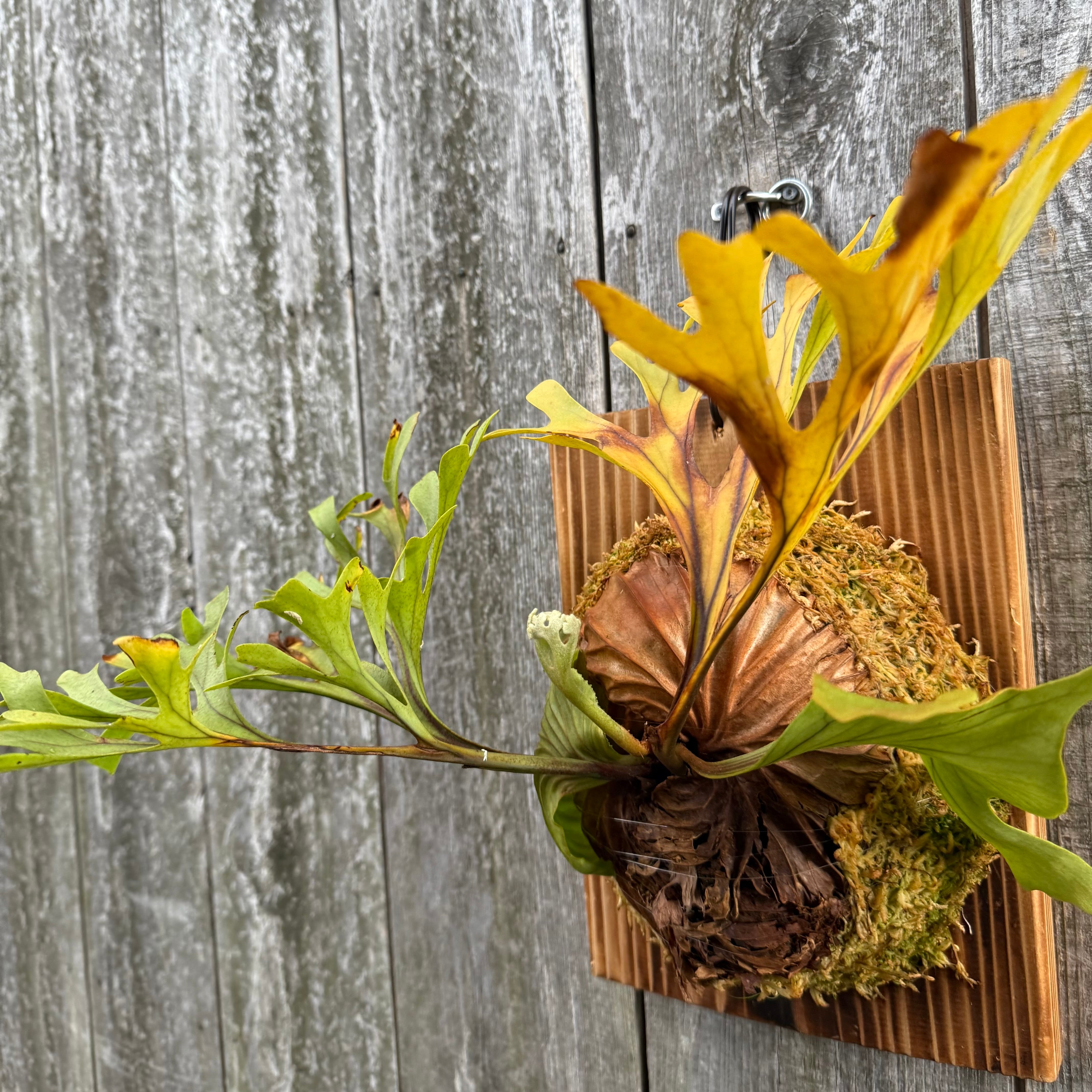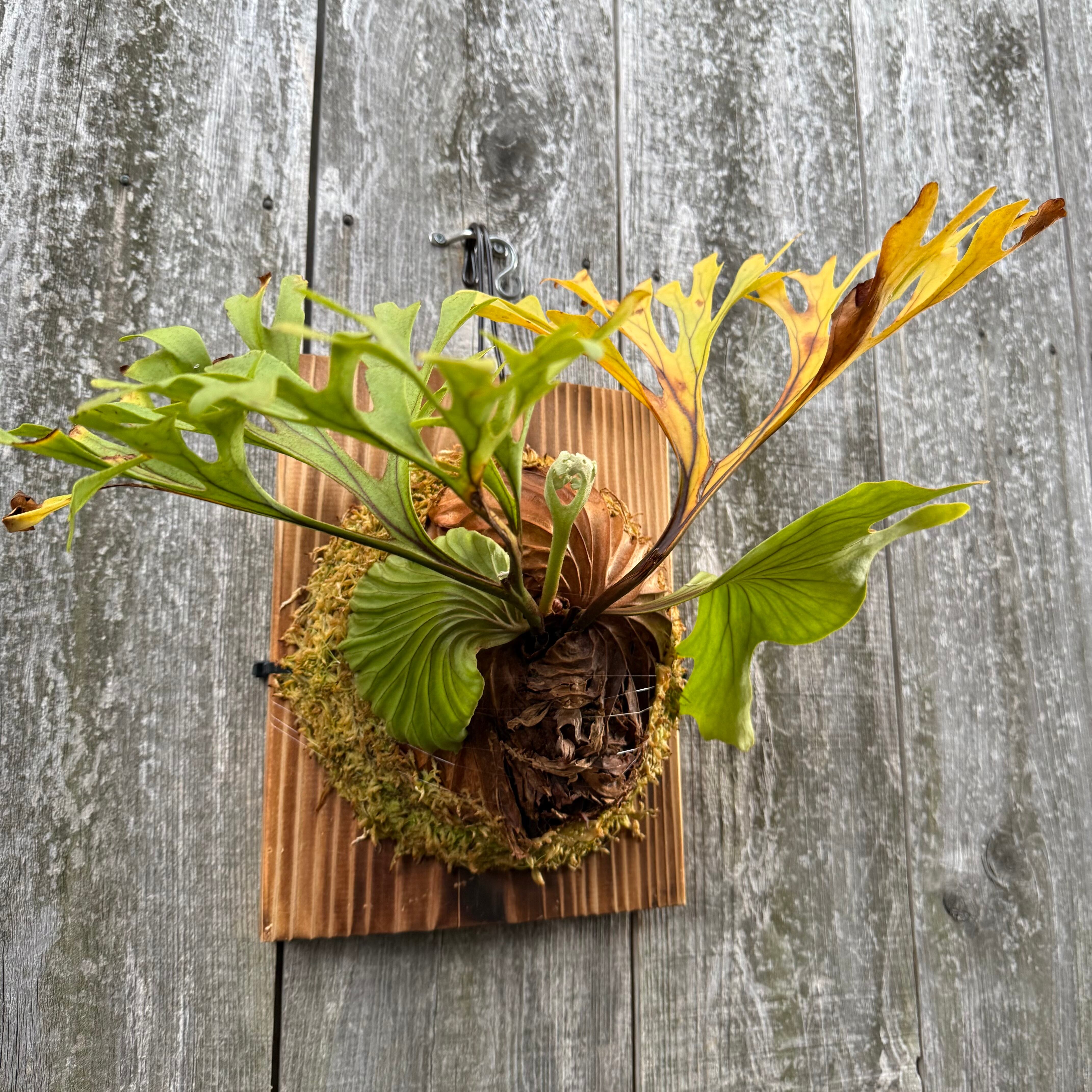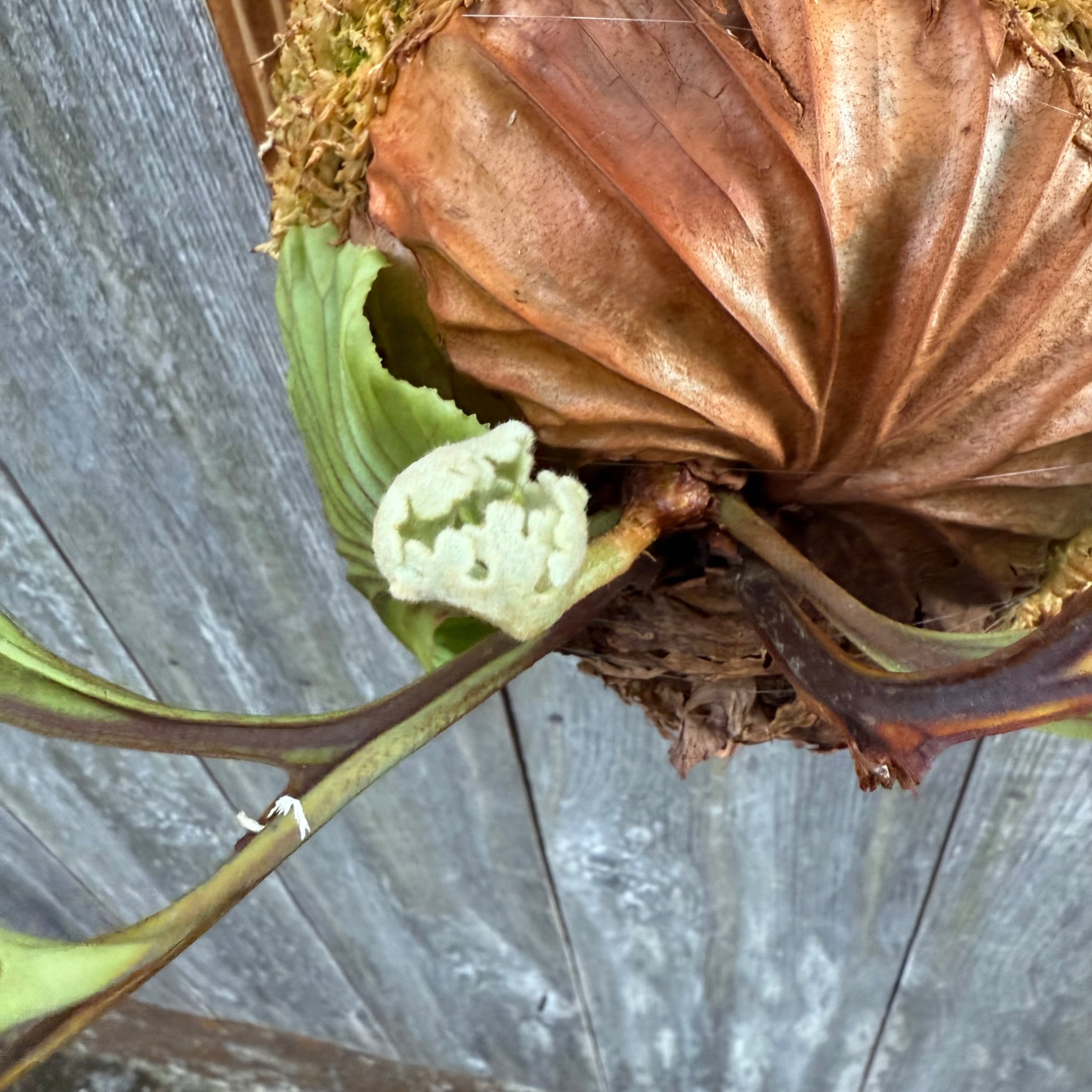 ワイルド株ならではの胞子葉、貯水葉には痛みや傷はありますが、胞子栽培よりも強靭で味があります。成長点からは新しい葉の成長もしっかりとあります。管理しやすい焼板につけております。お部屋のインテリアにいかがでしょうか。