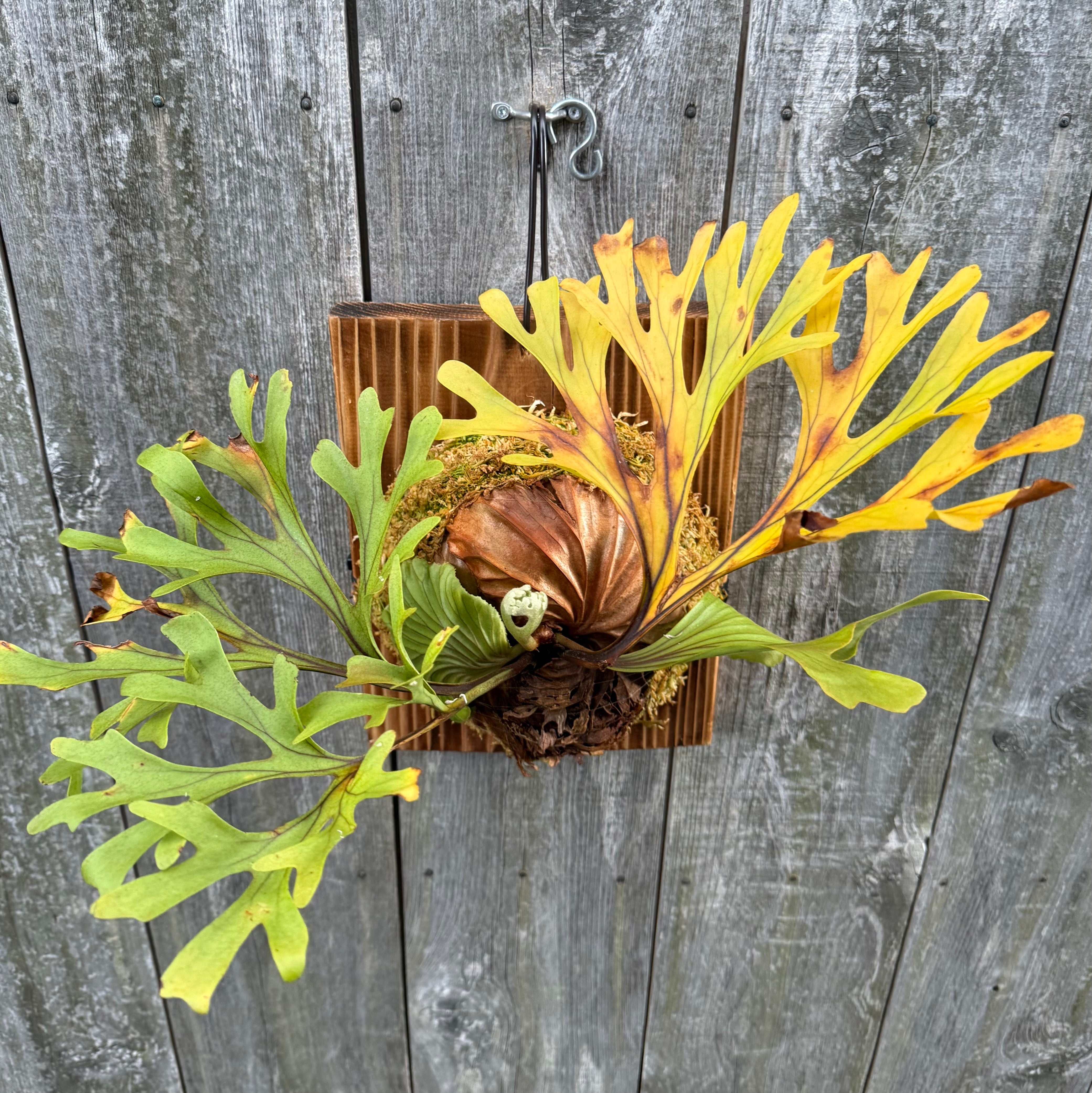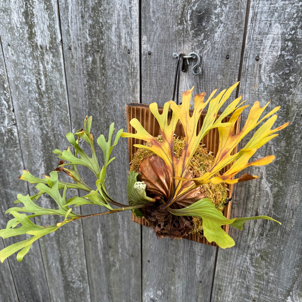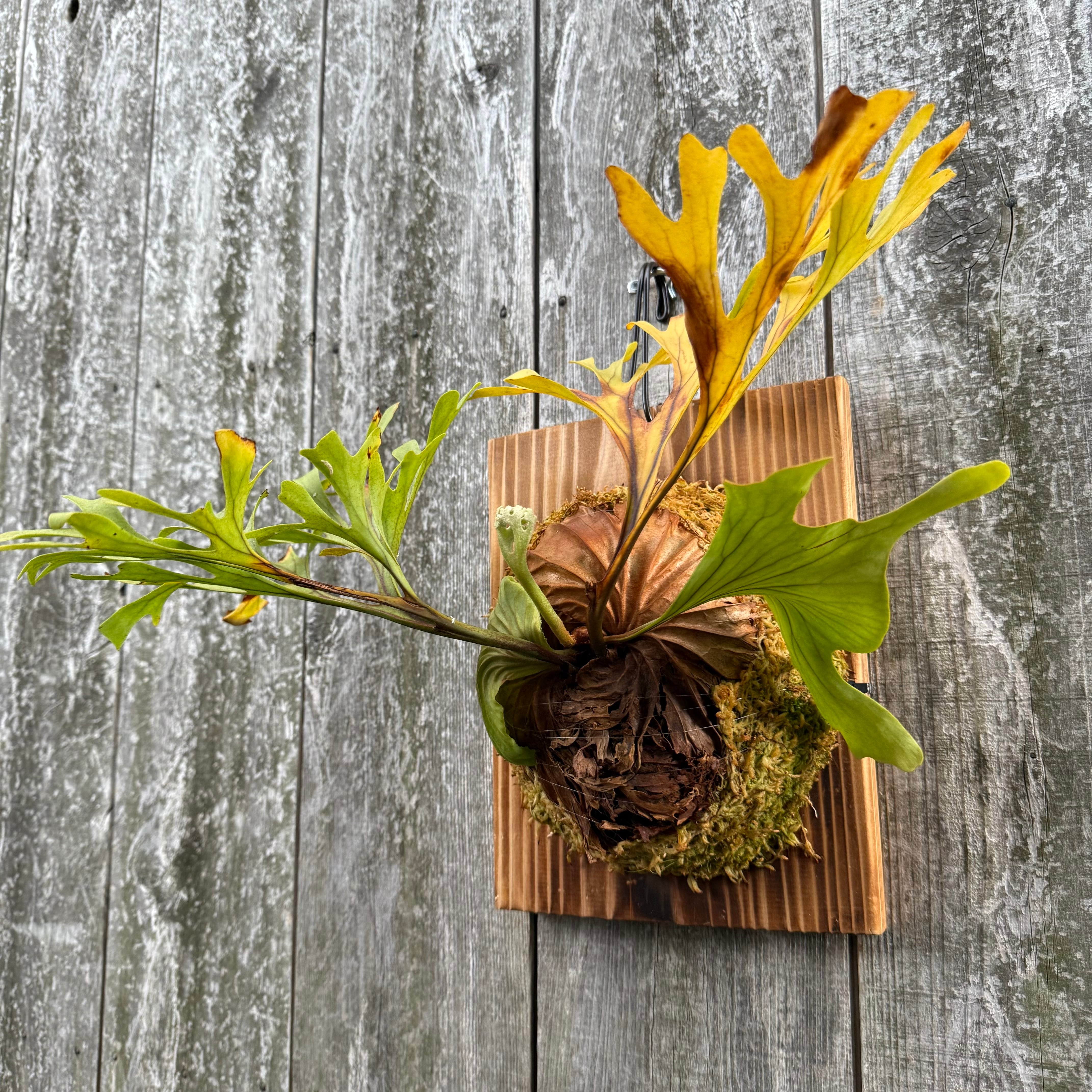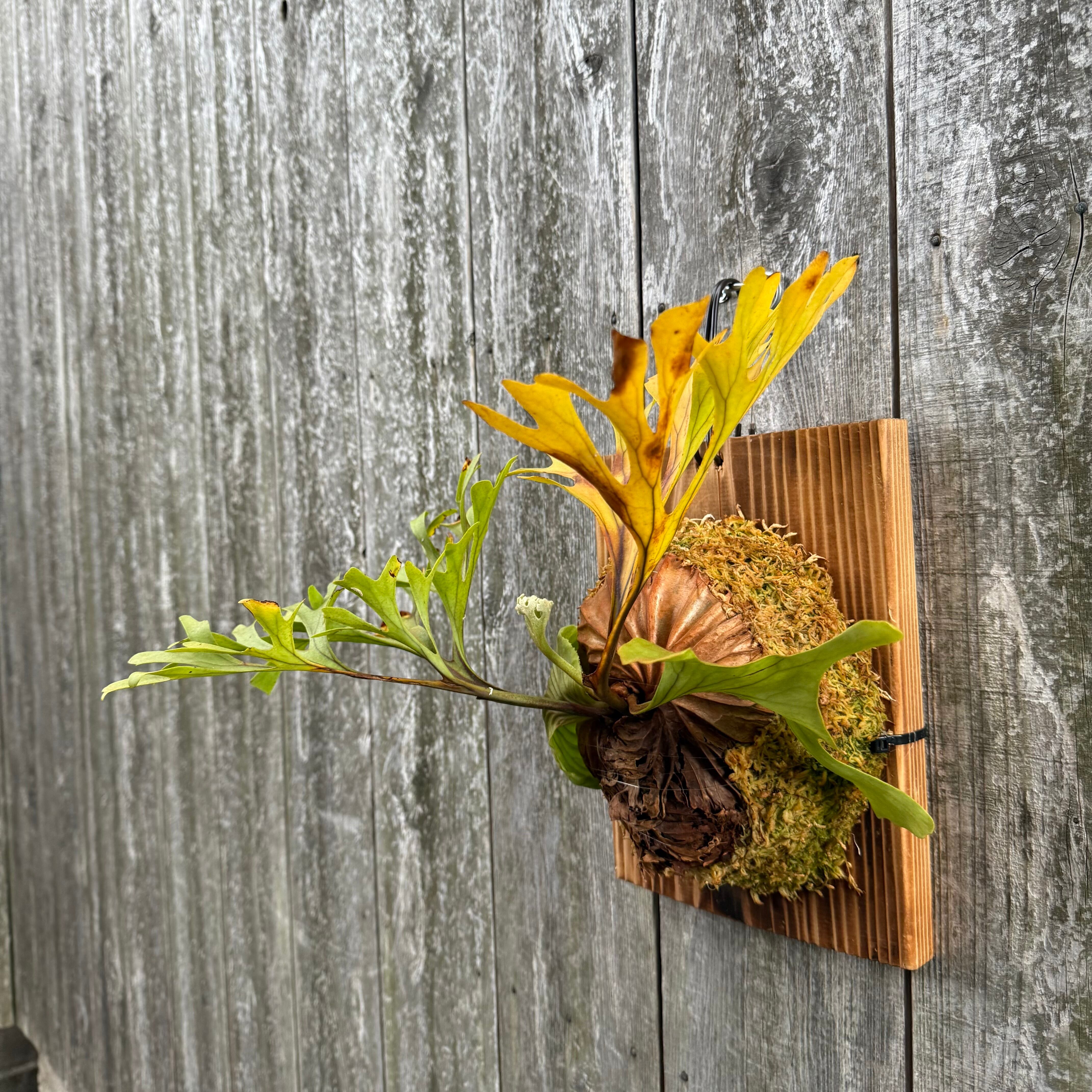 ワイルド株ならではの胞子葉、貯水葉には痛みや傷はありますが、胞子栽培よりも強靭で味があります。成長点からは新しい葉の成長もしっかりとあります。管理しやすい焼板につけております。お部屋のインテリアにいかがでしょうか。