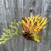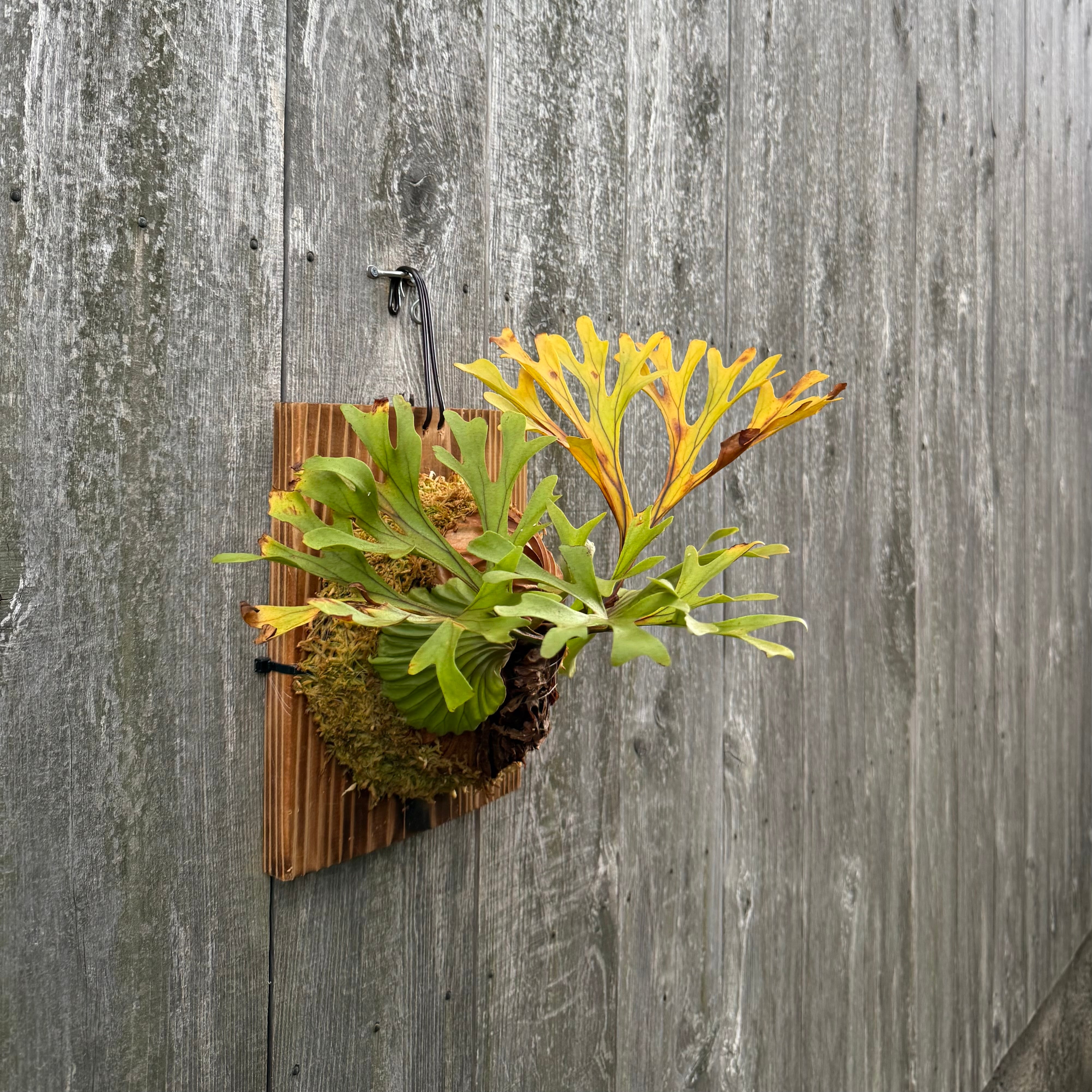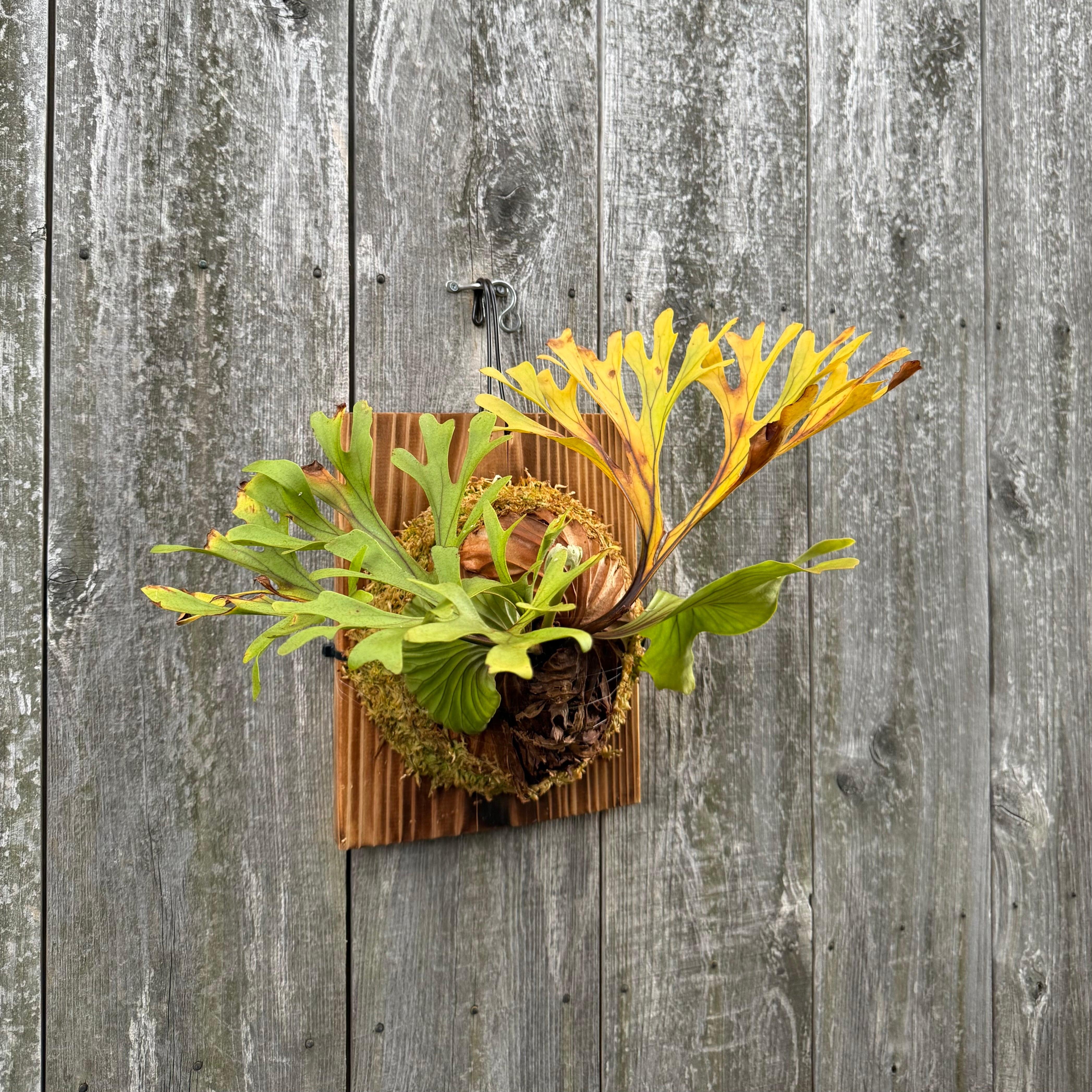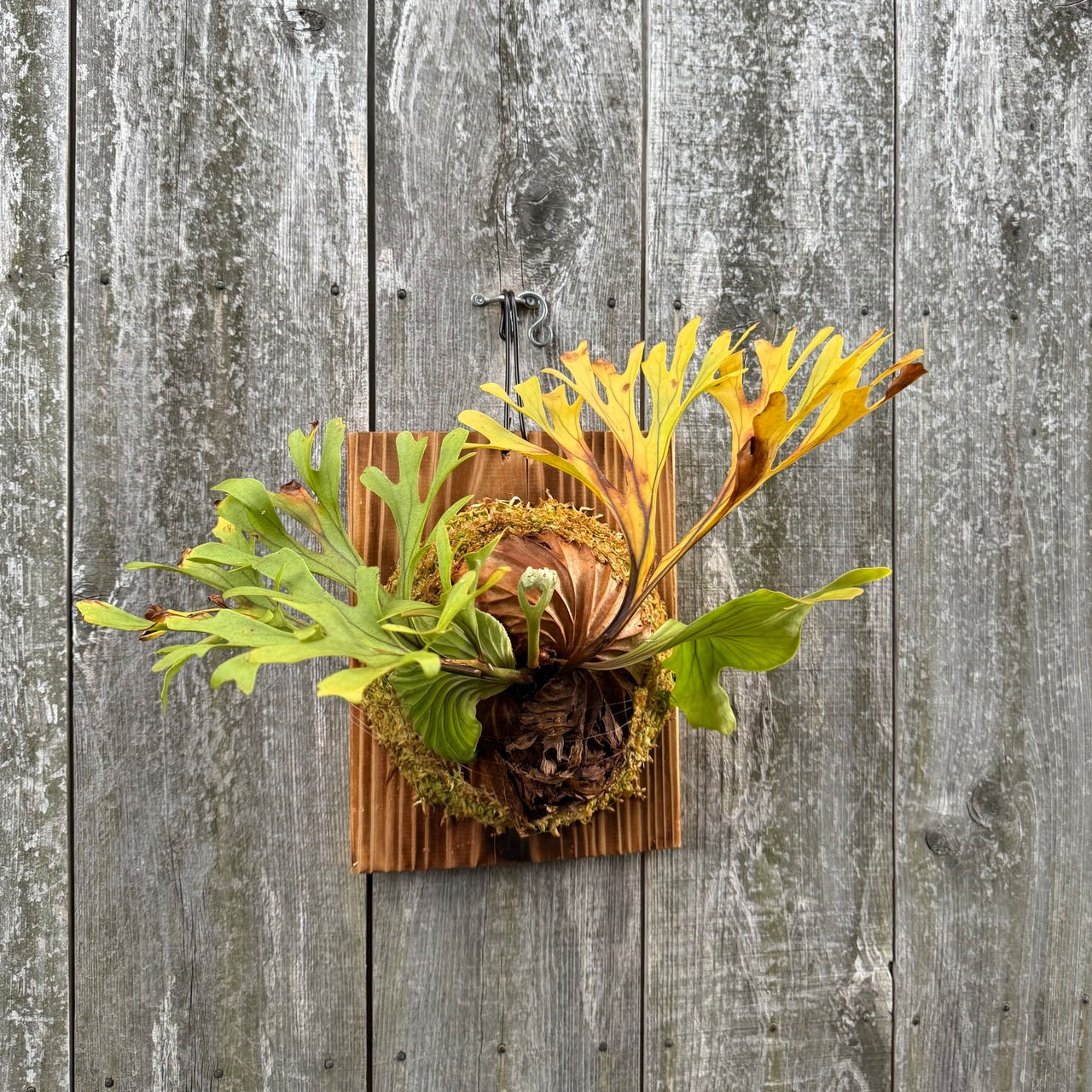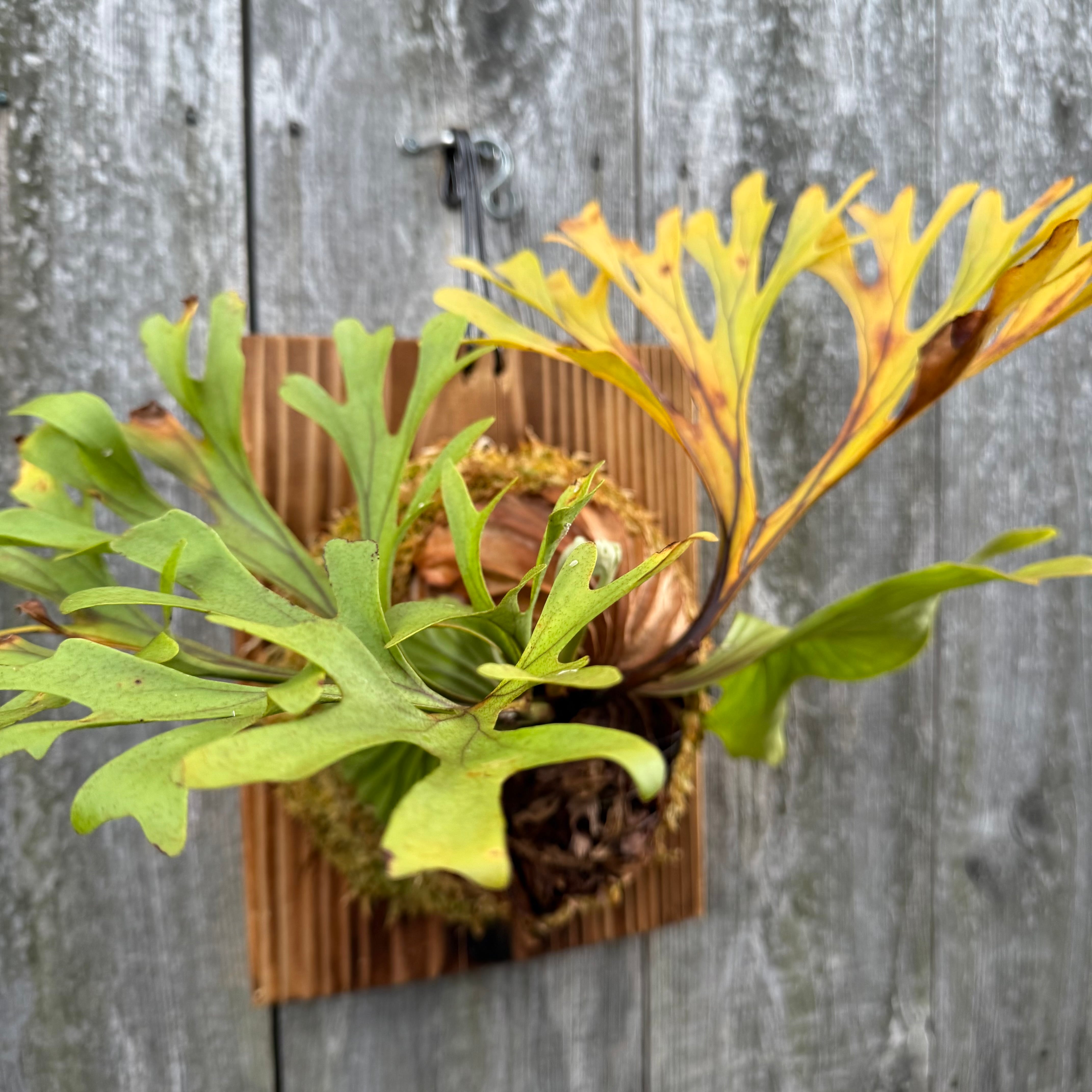 ワイルド株ならではの胞子葉、貯水葉には痛みや傷はありますが、胞子栽培よりも強靭で味があります。成長点からは新しい葉の成長もしっかりとあります。管理しやすい焼板につけております。お部屋のインテリアにいかがでしょうか。