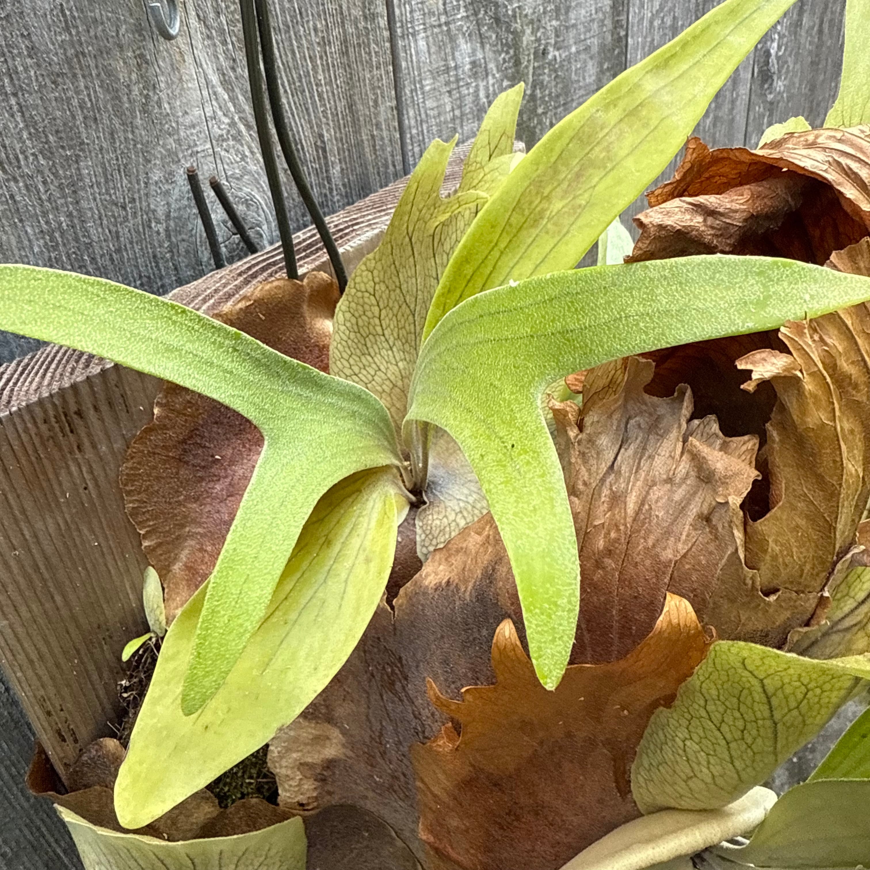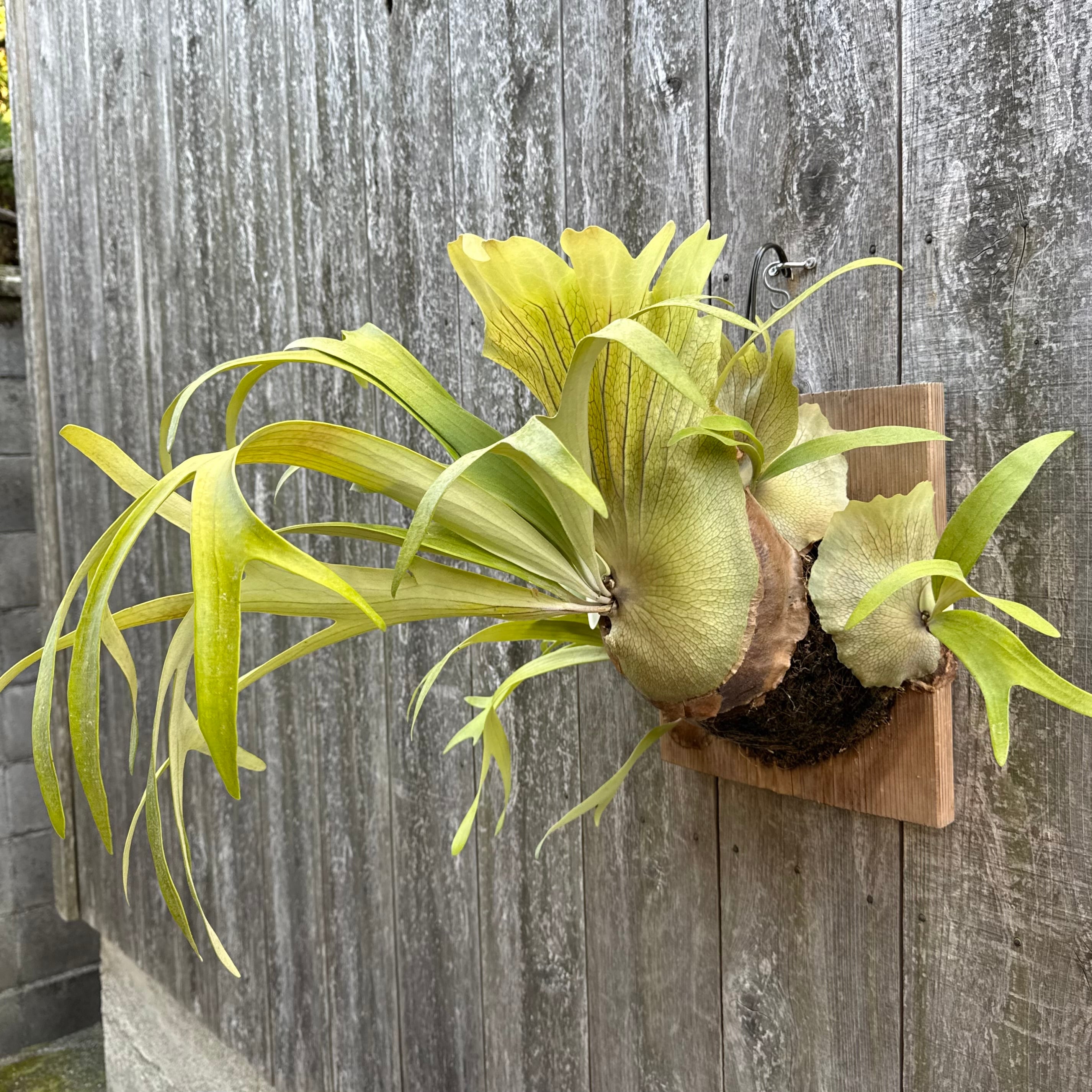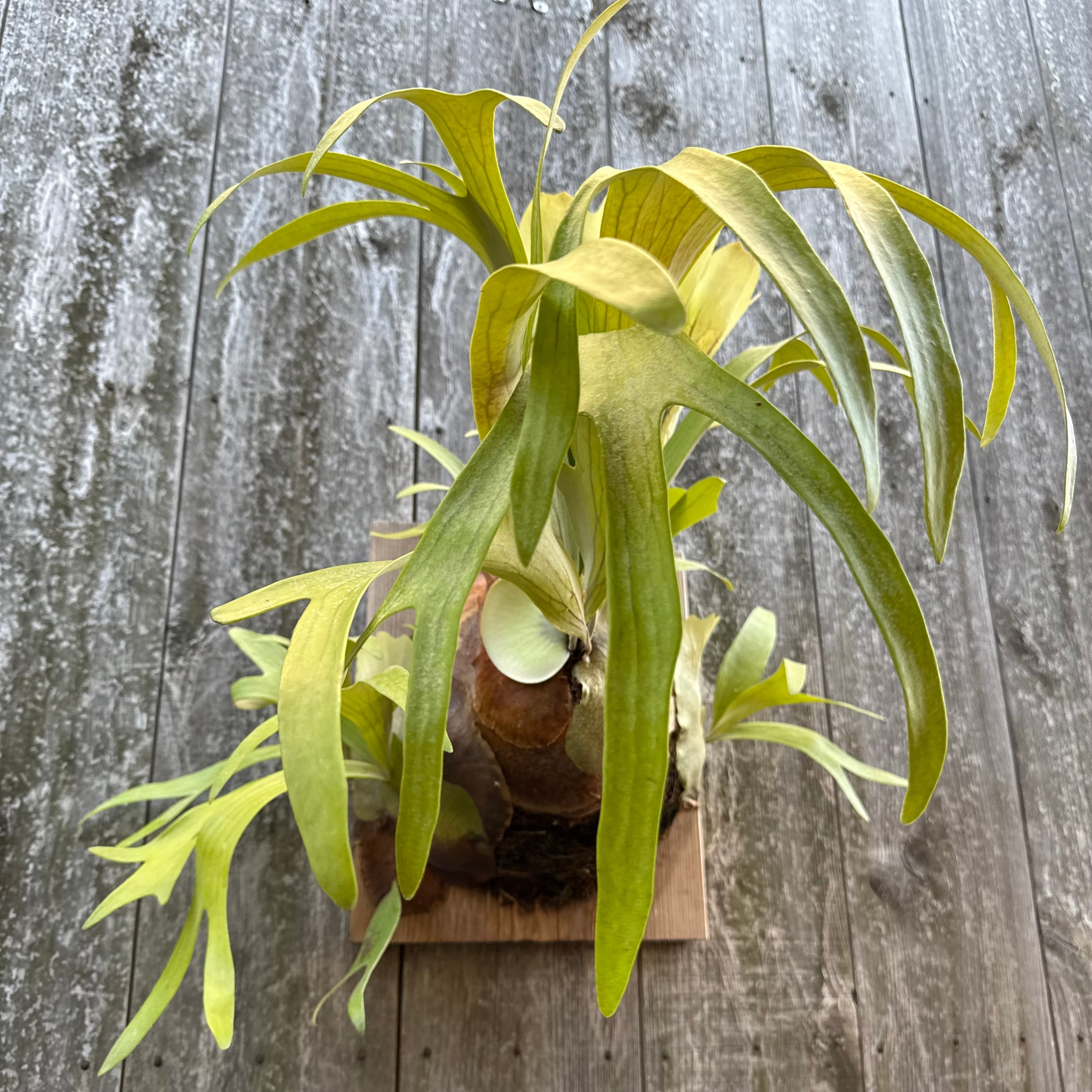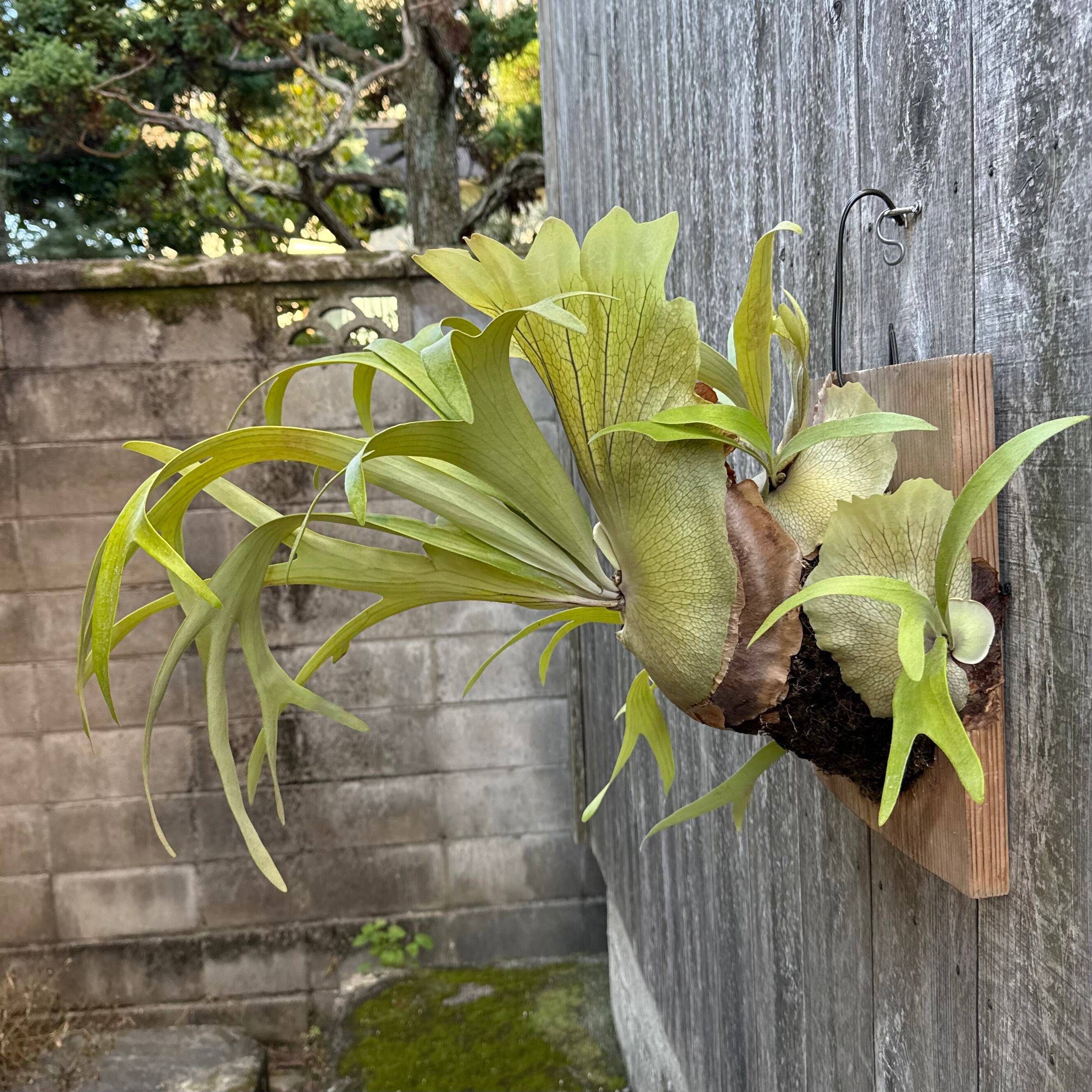 上向きに伸びてから垂れる胞子葉は、非常に優雅で美しく、群生にすると見事です。ワイルドのビフルカツムのハイブリッド品種とされ、日本ではかなり希少な品種になります。CK Pavilion から仕入れた株になります。
