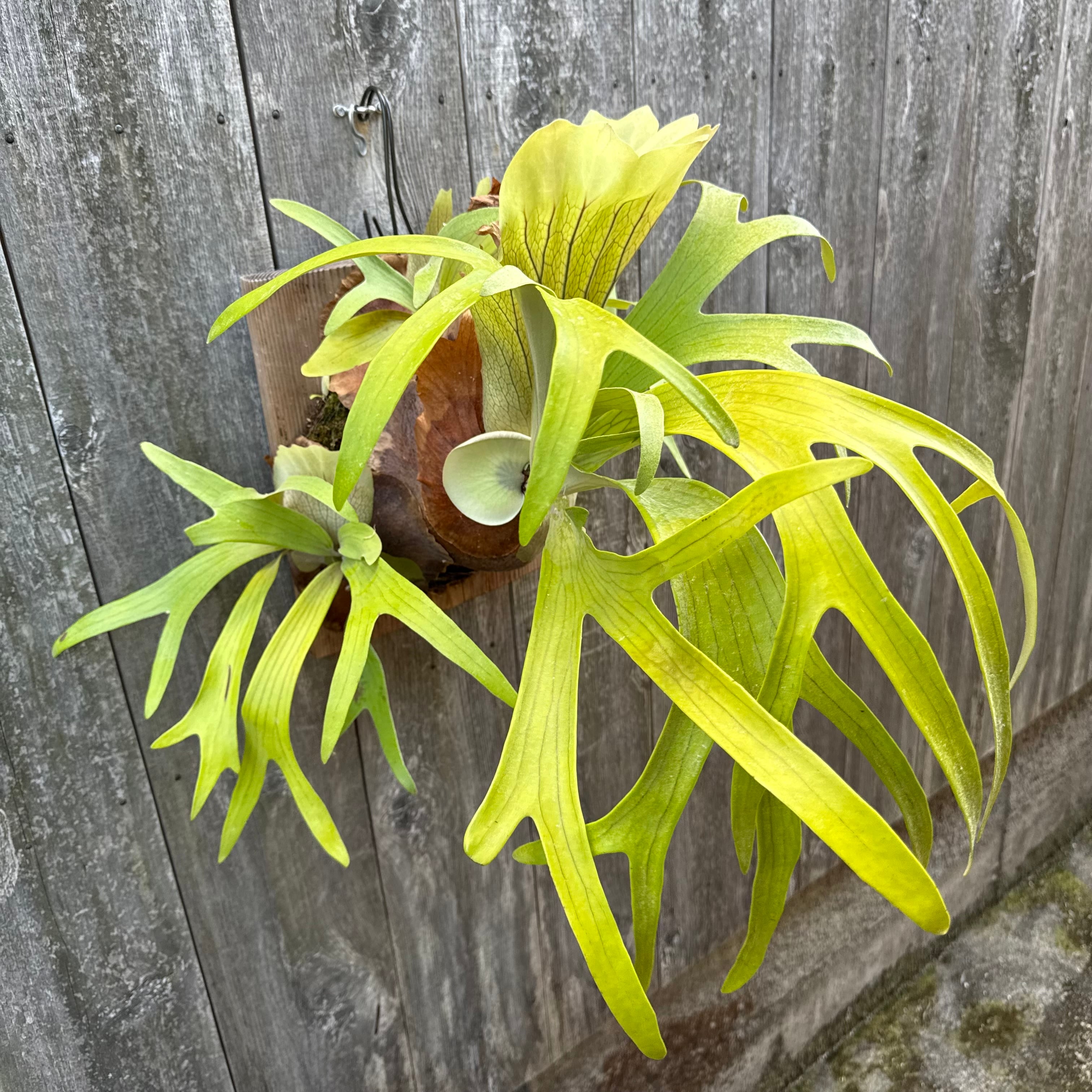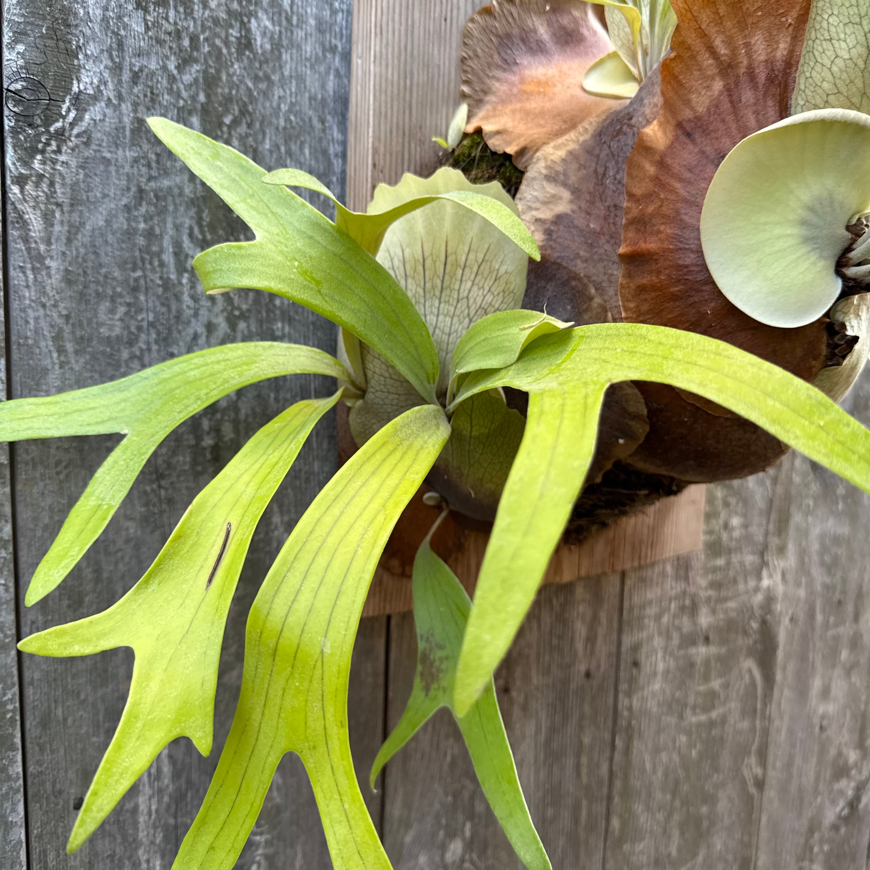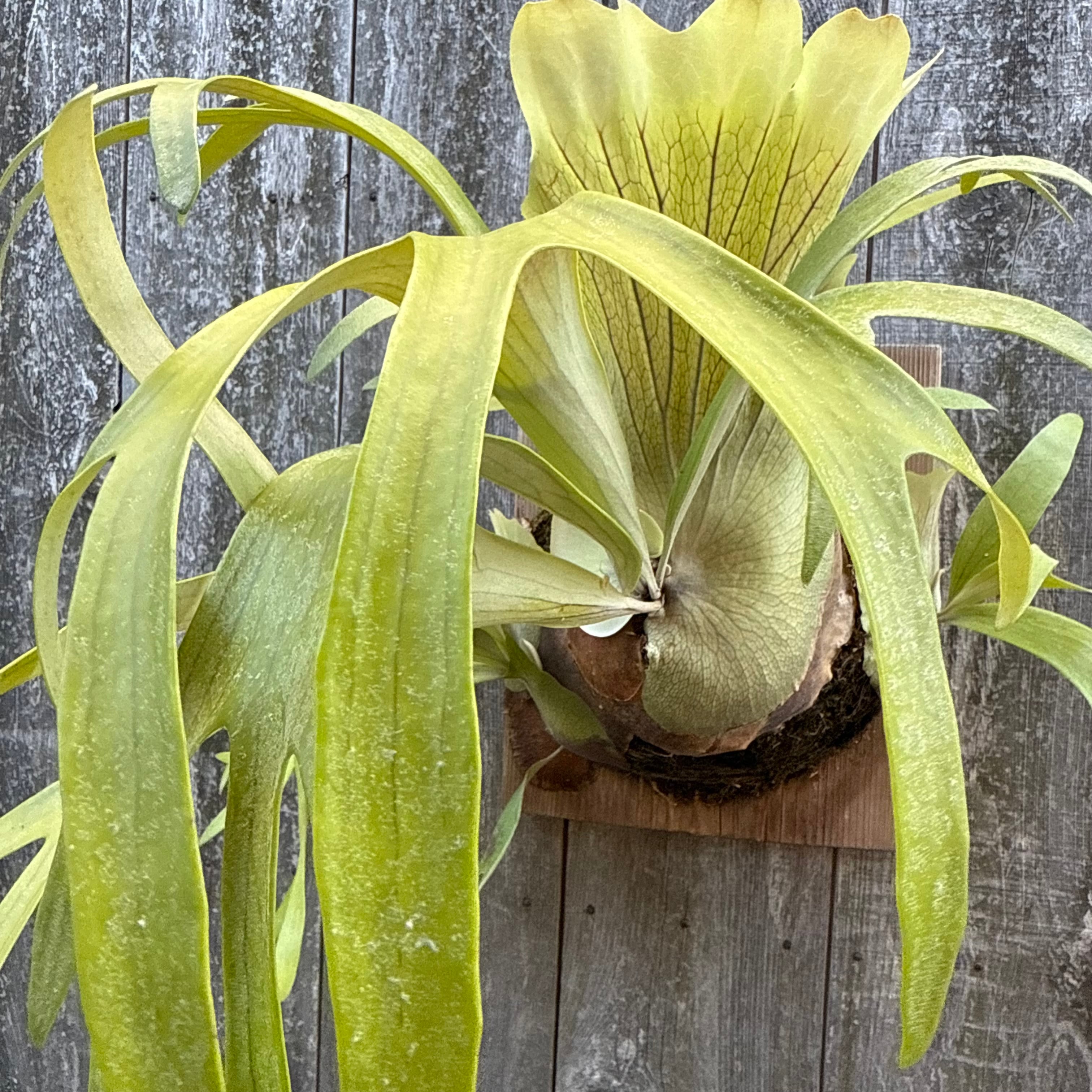上向きに伸びてから垂れる胞子葉は、非常に優雅で美しく、群生にすると見事です。ワイルドのビフルカツムのハイブリッド品種とされ、日本ではかなり希少な品種になります。CK Pavilion から仕入れた株になります。