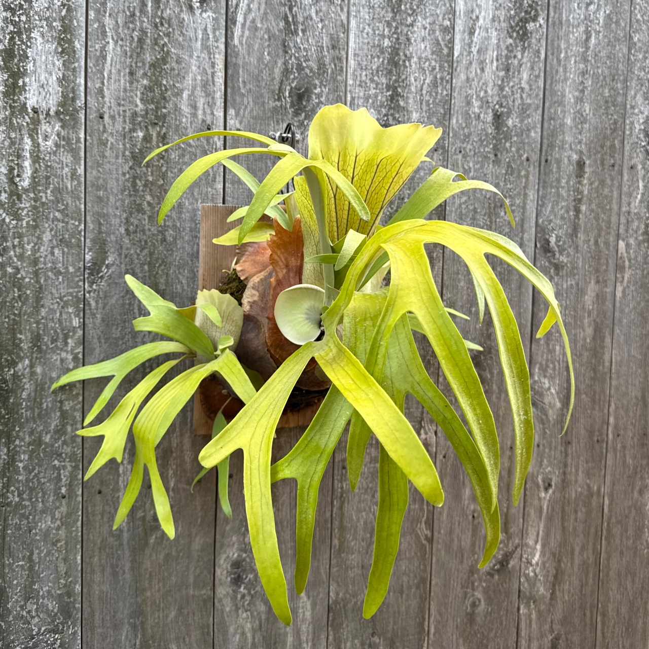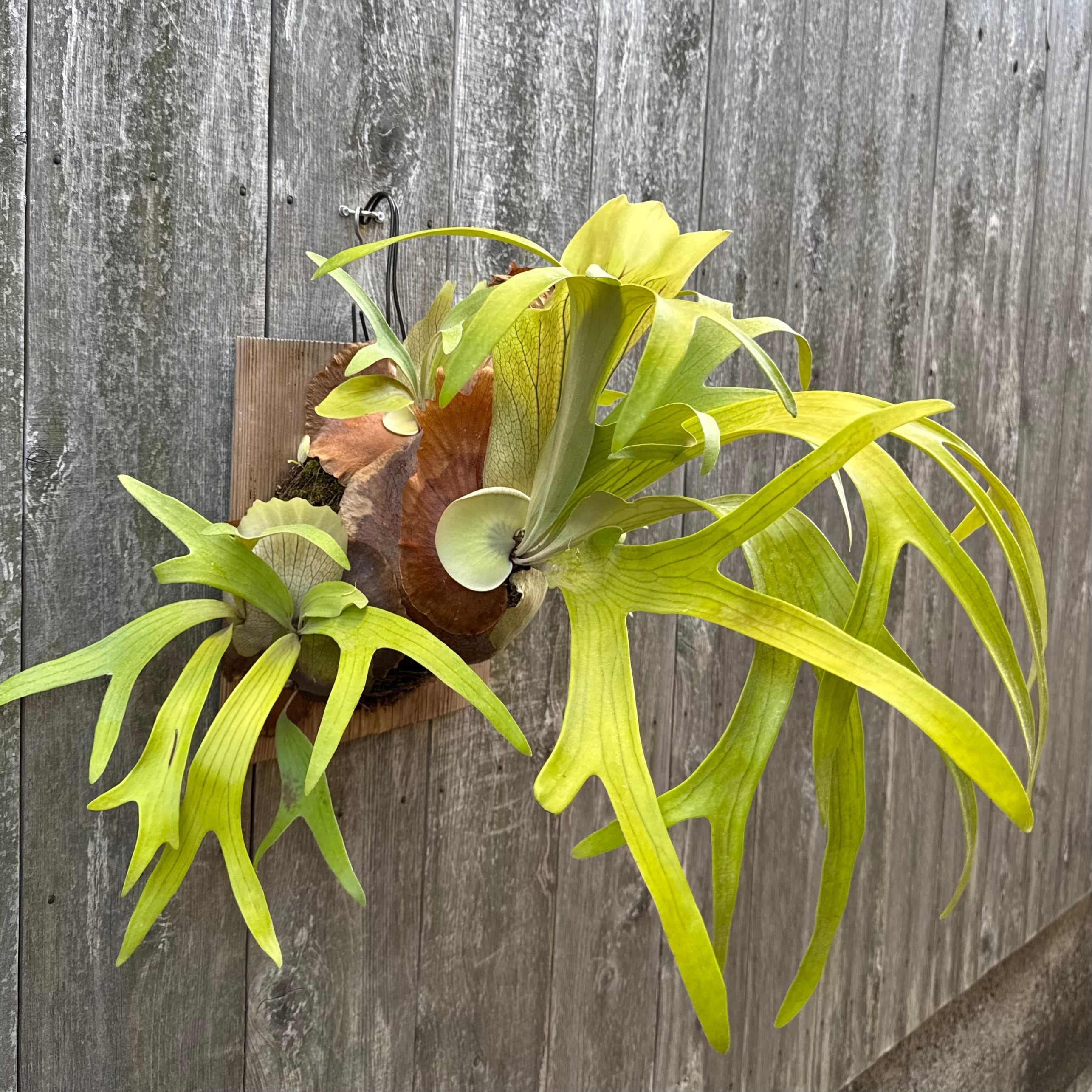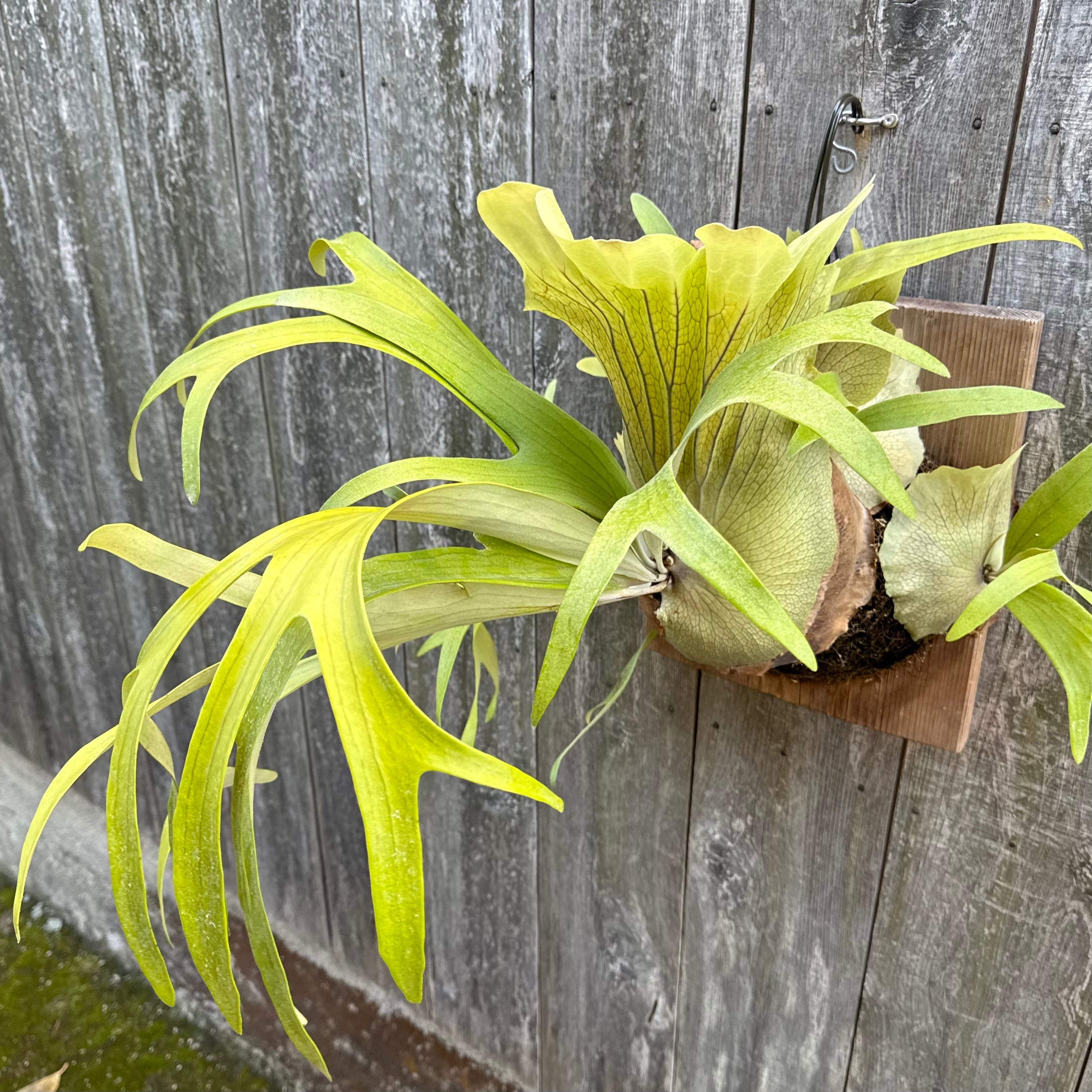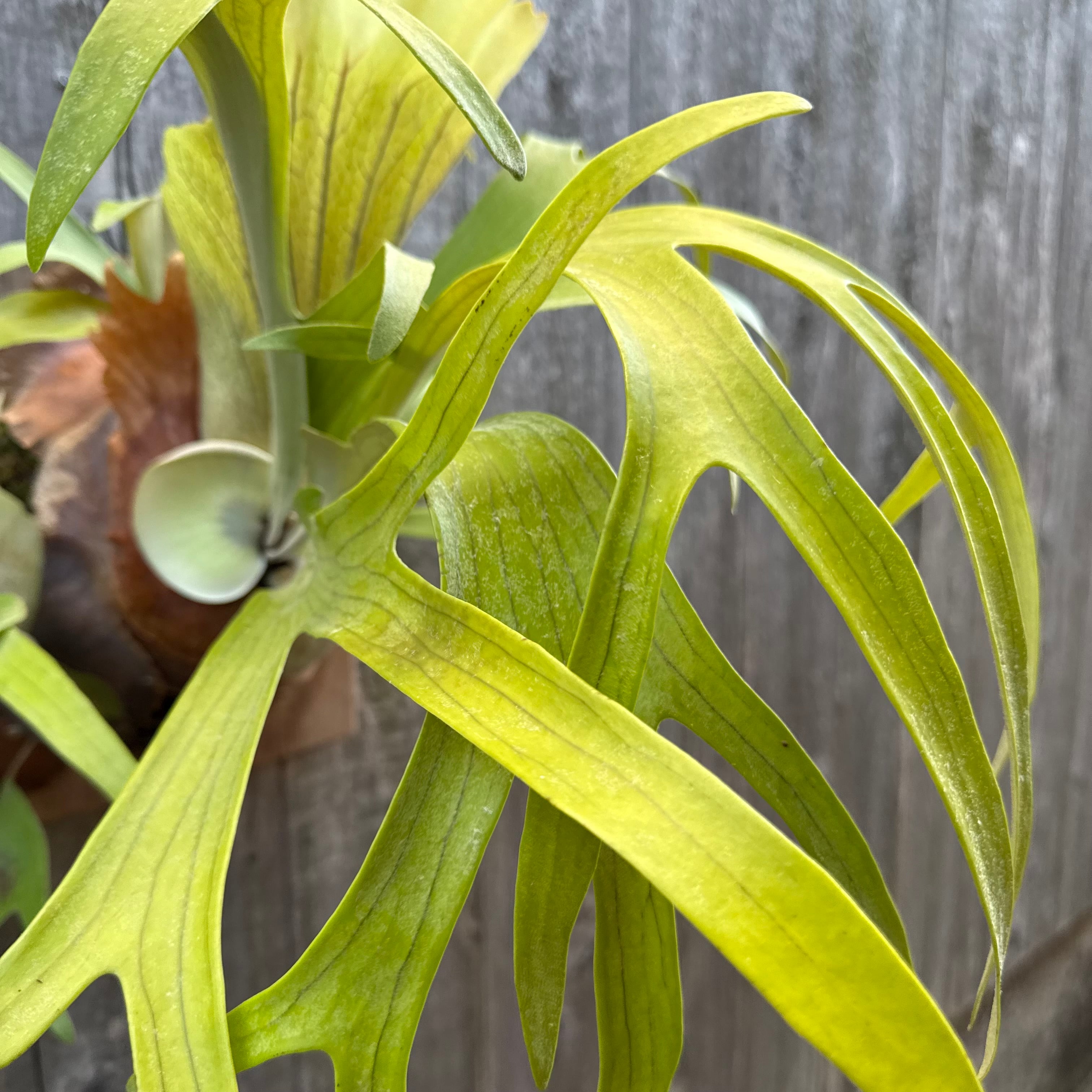上向きに伸びてから垂れる胞子葉は、非常に優雅で美しく、群生にすると見事です。ワイルドのビフルカツムのハイブリッド品種とされ、日本ではかなり希少な品種になります。CK Pavilion から仕入れた株になります。
