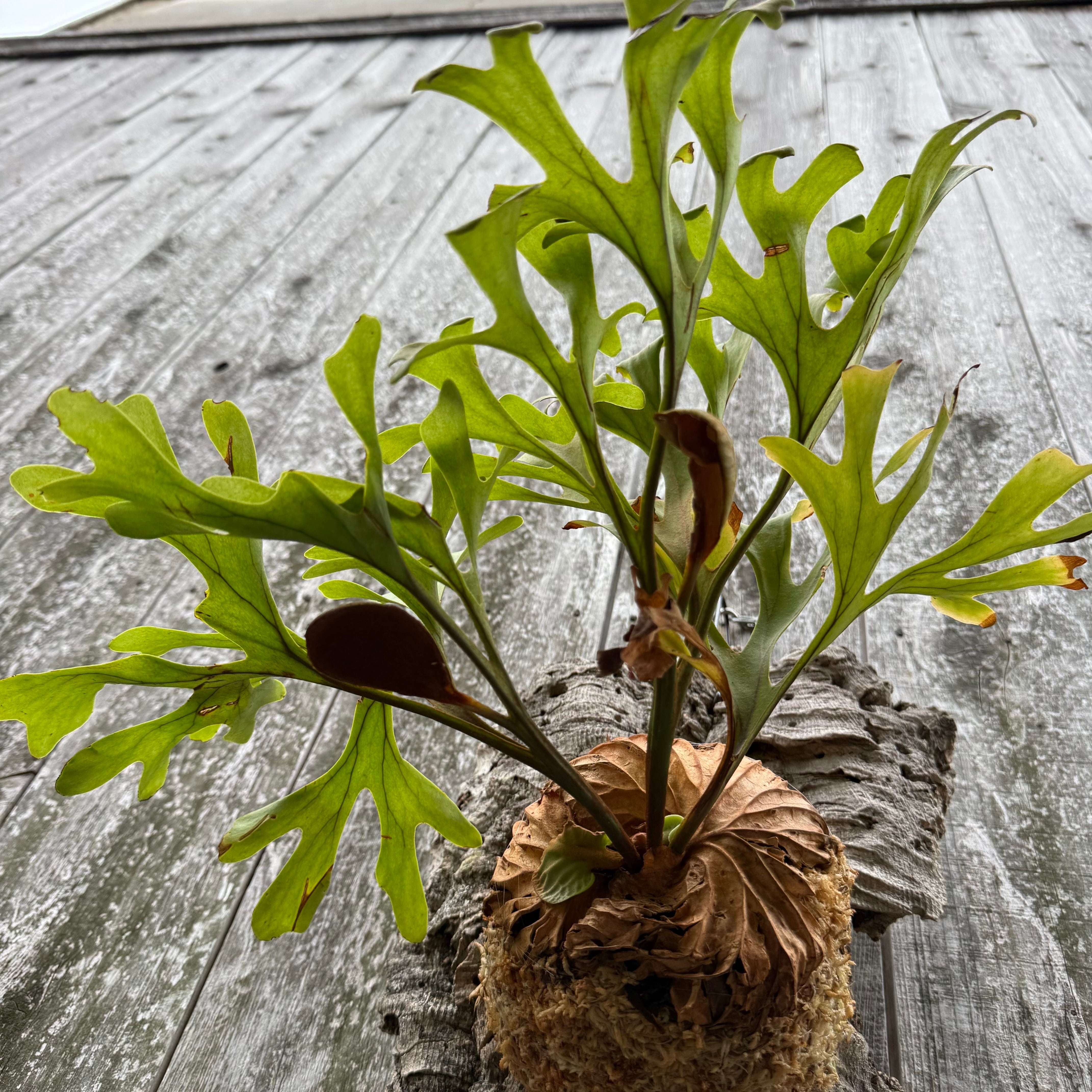 胞子葉、貯水葉には野生種ならではの痛みや傷はありますが、胞子栽培よりも強靭で味があります。成長点からは新しい葉の成長もあります。