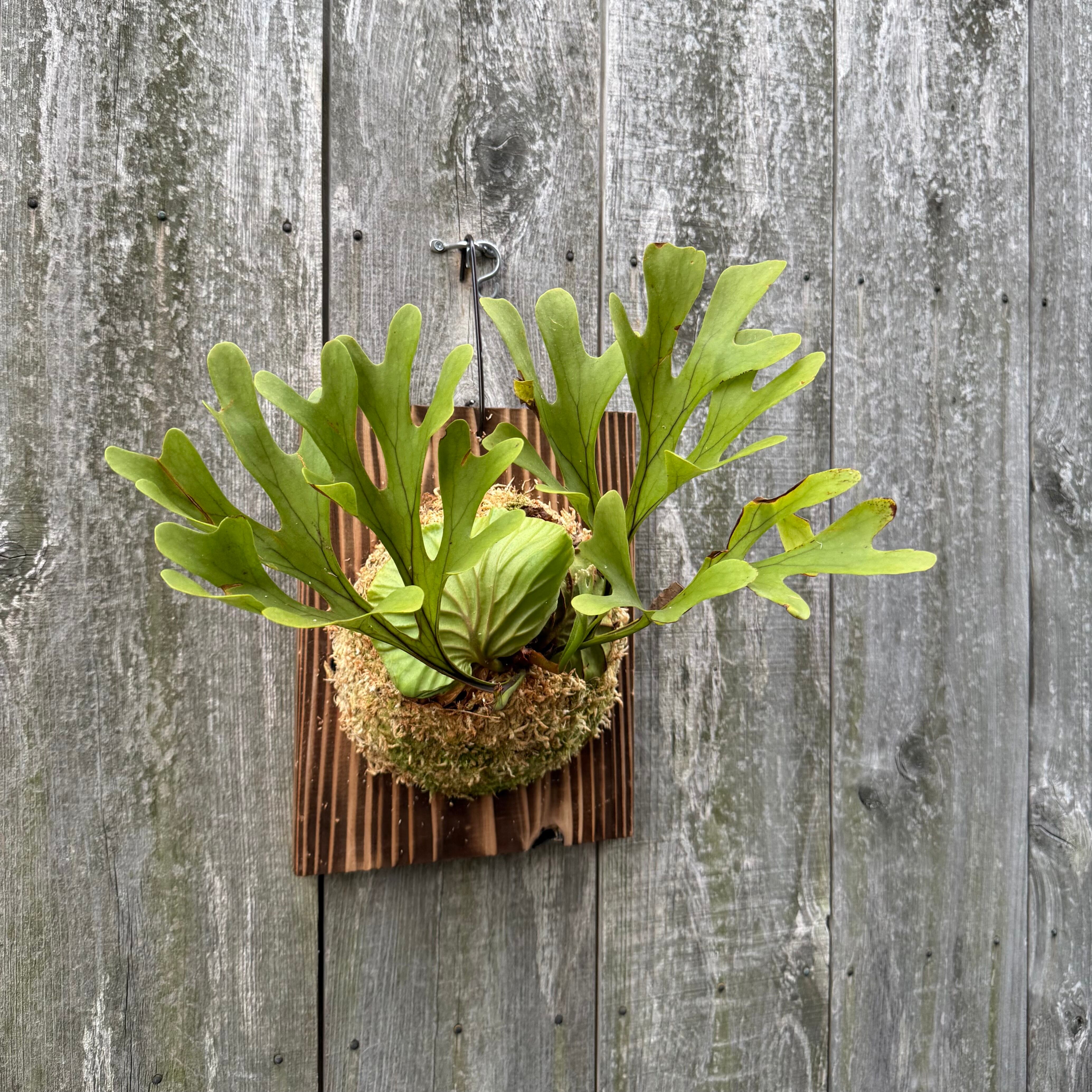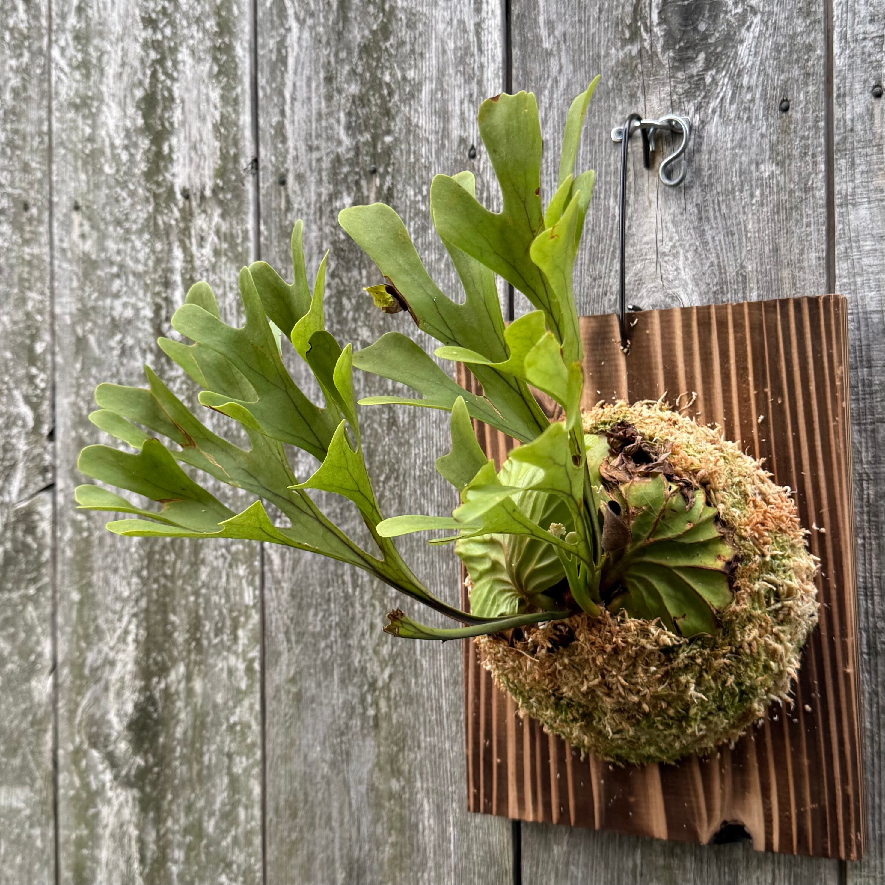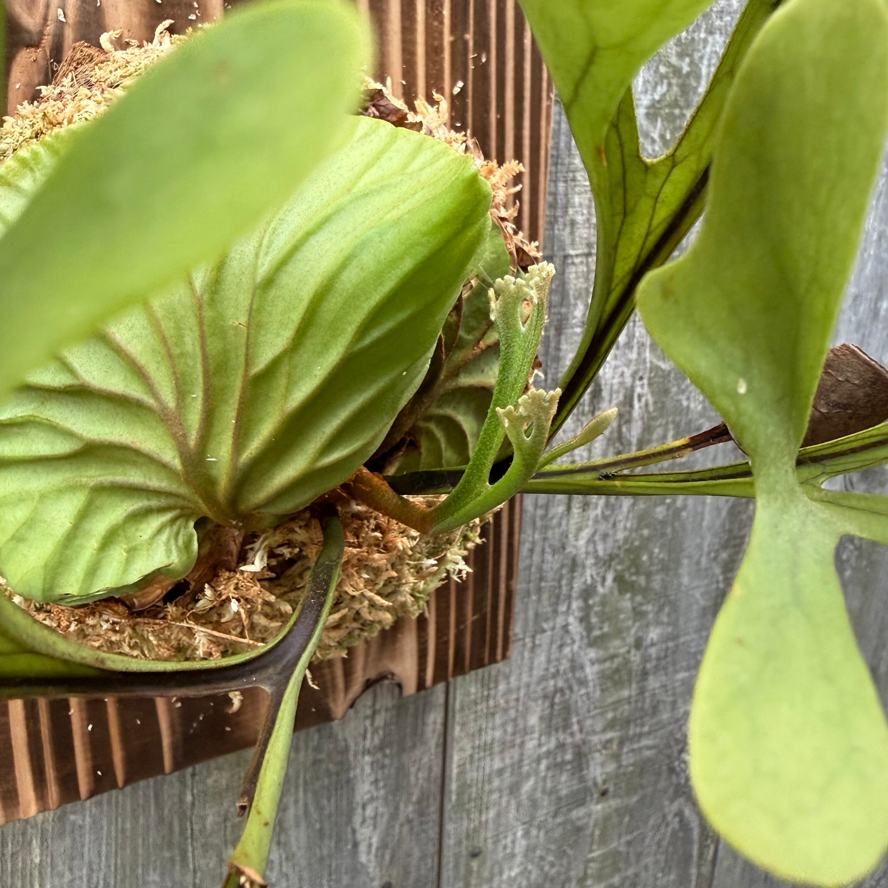 ワイルド株ならではの胞子葉、貯水葉には痛みや傷はありますが、胞子栽培よりも強靭で味があります。成長点からは新しい葉の成長もしっかりとあります。管理しやすい焼板につけております。お部屋のインテリアにいかがでしょうか。