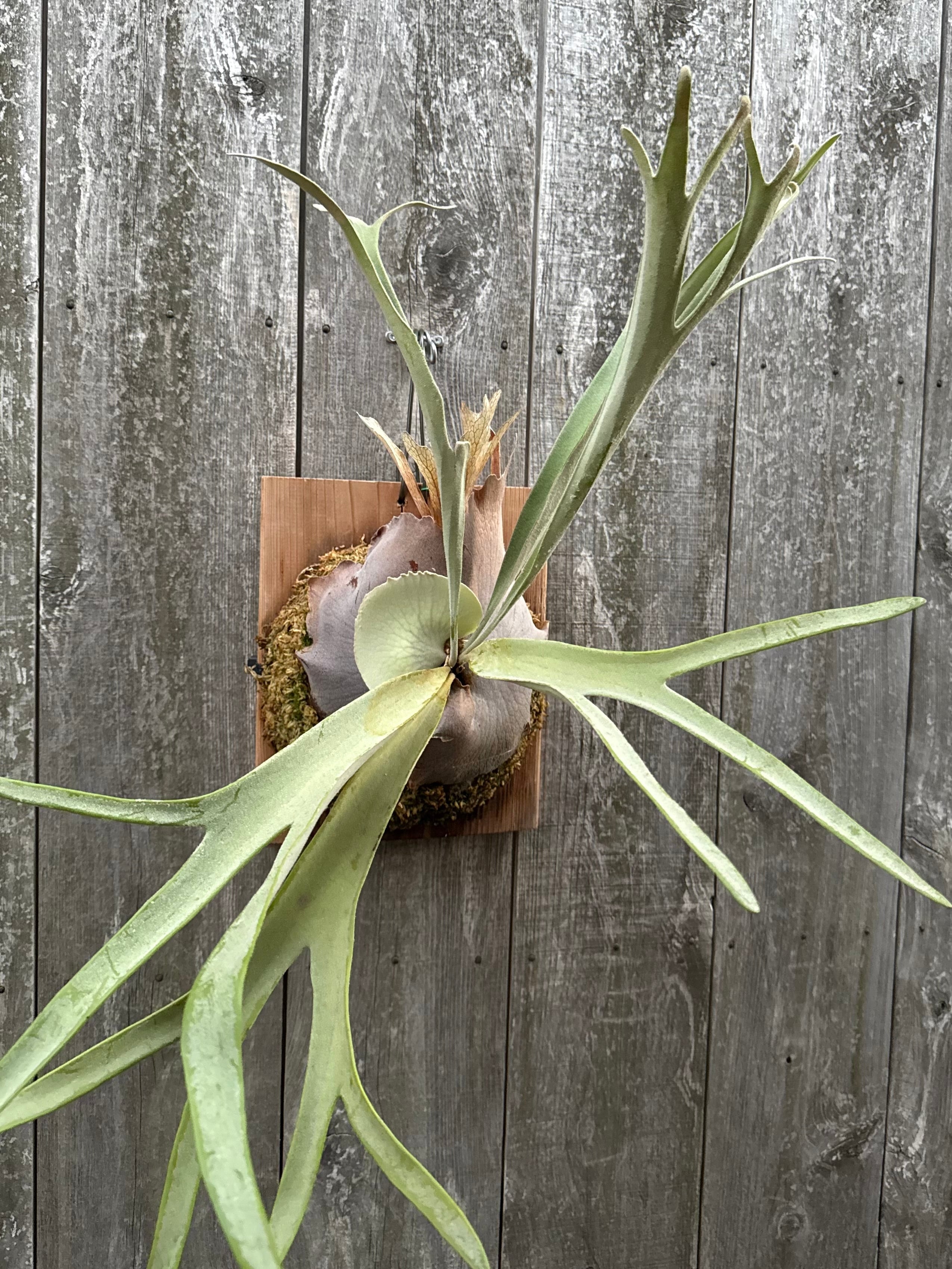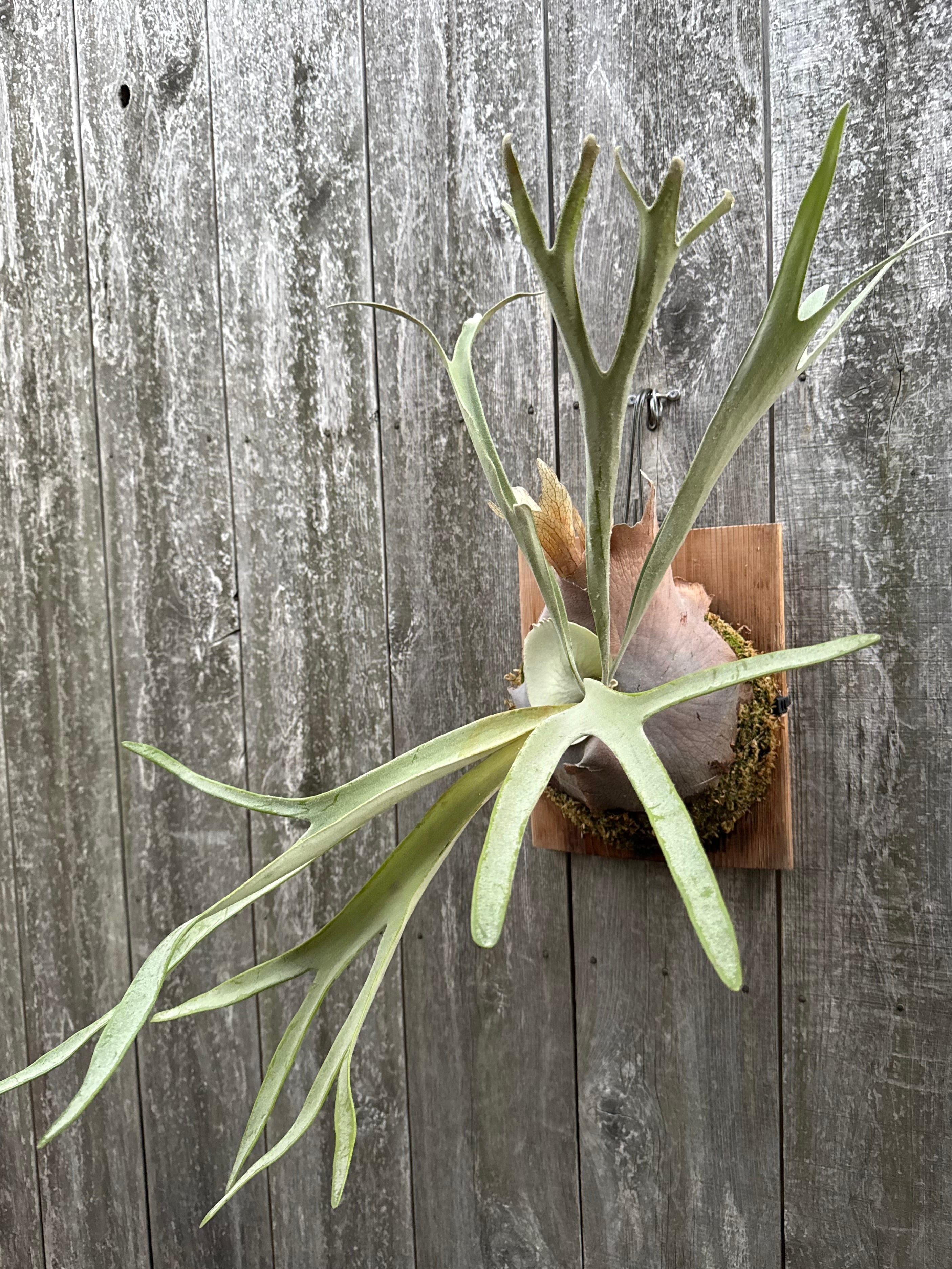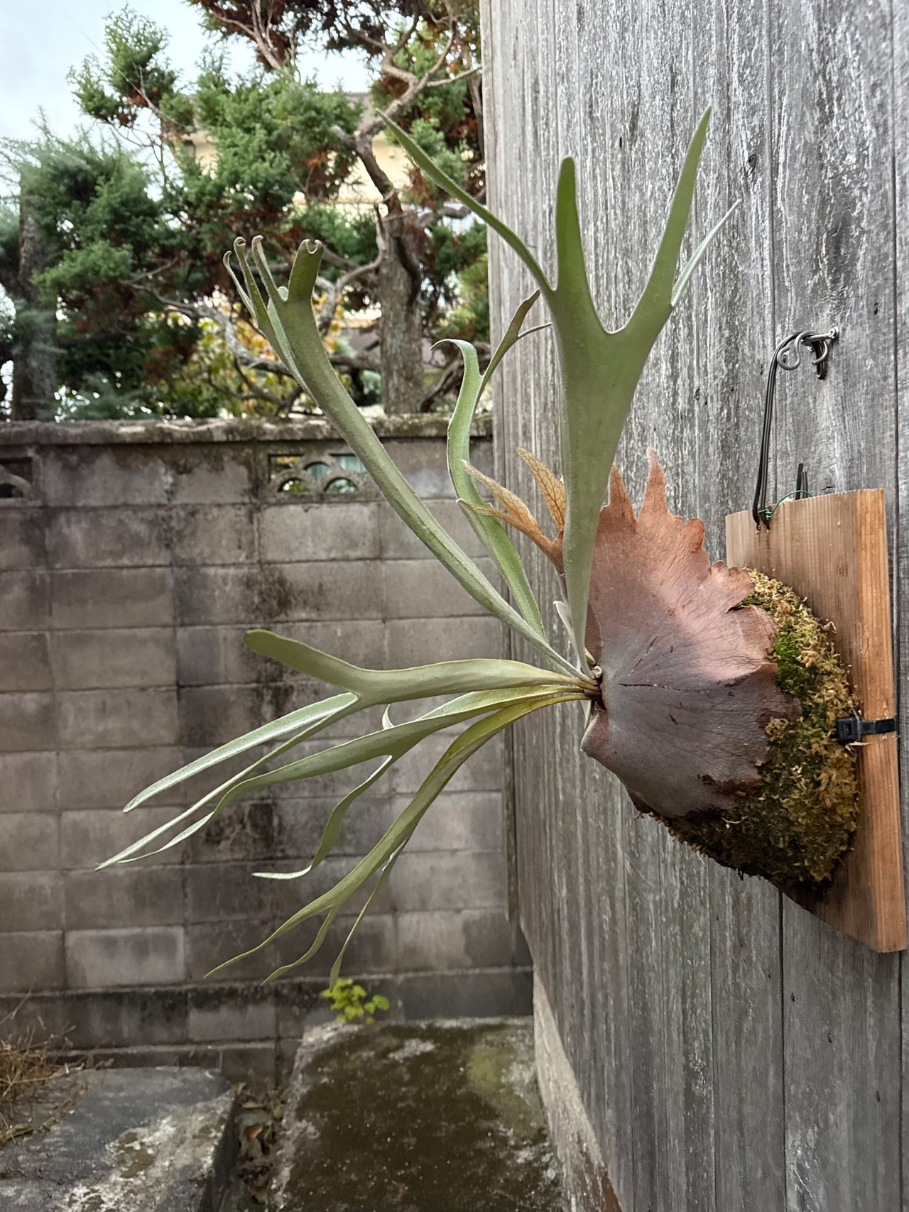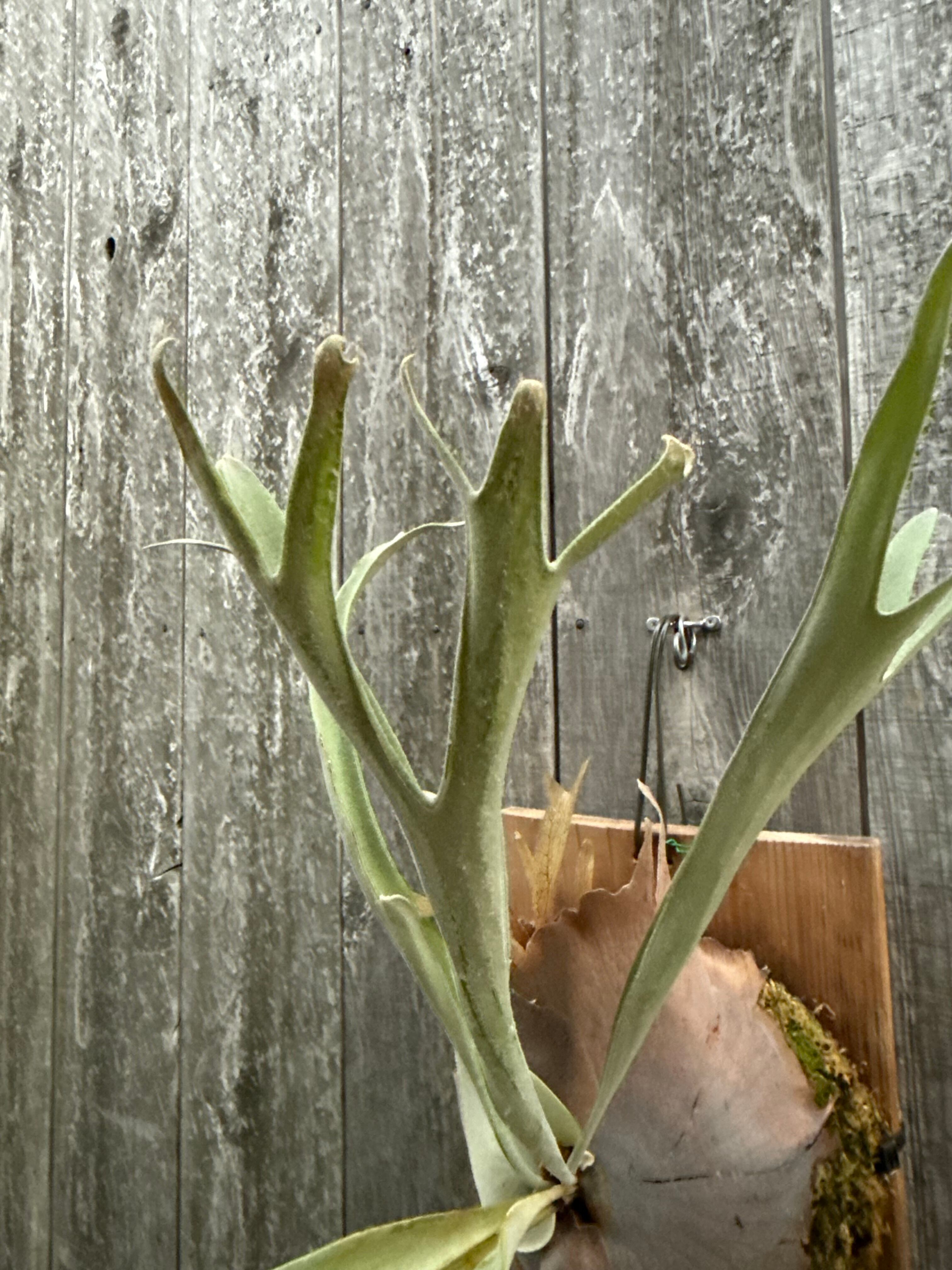 チェンマイの山間部でビカクシダを育てているビカクシダの趣味家からの株です。個性的で美しい胞子葉が特徴的なベイチーになります。