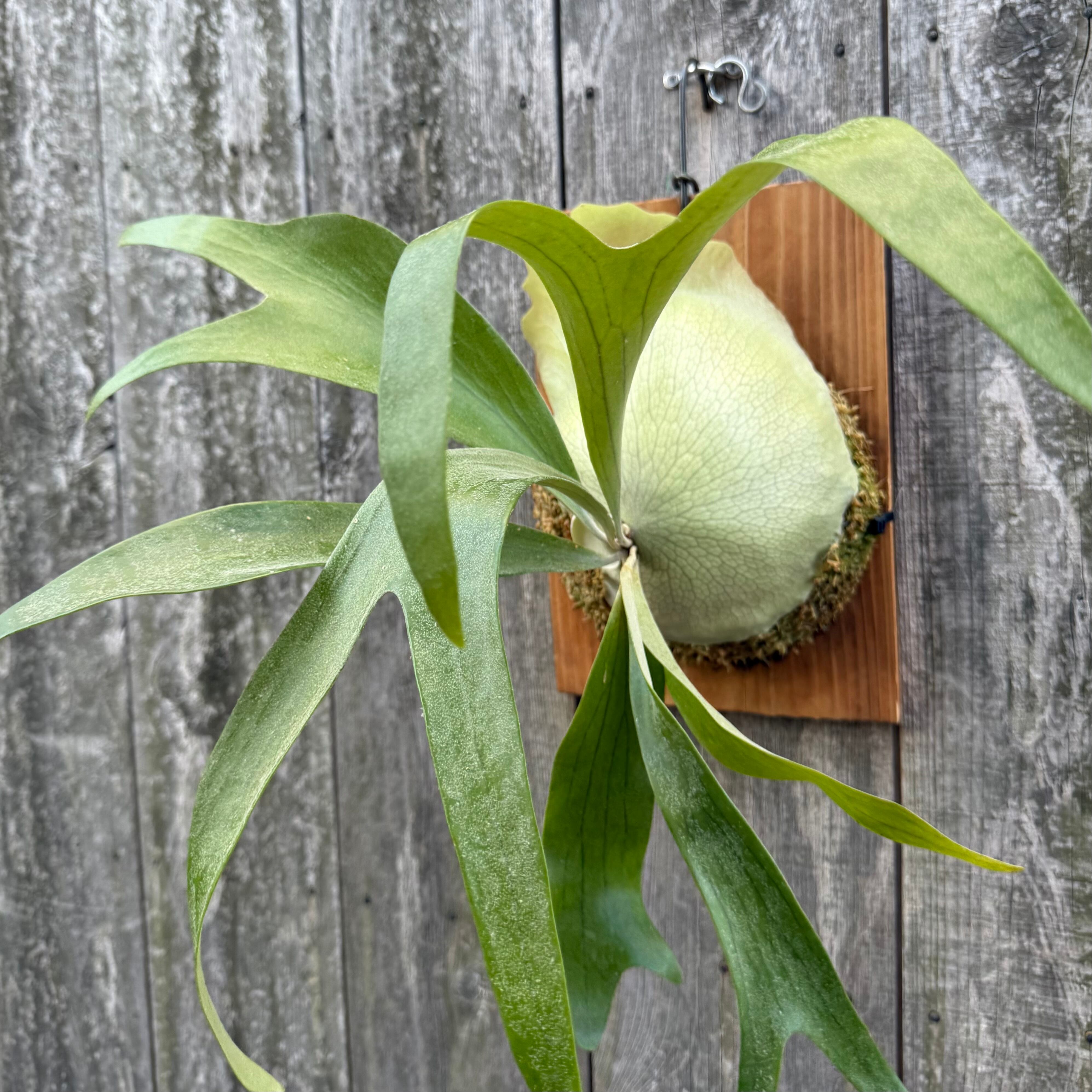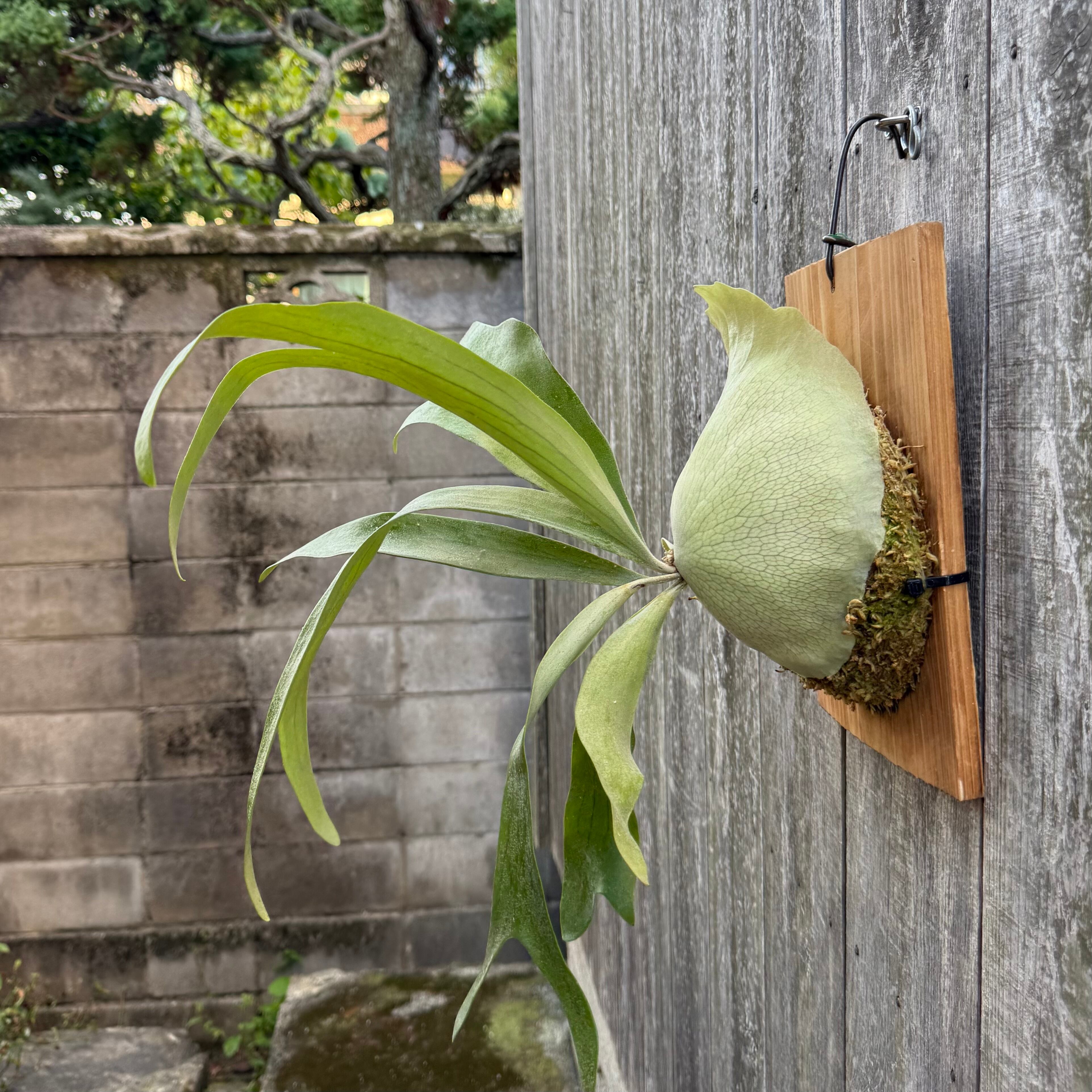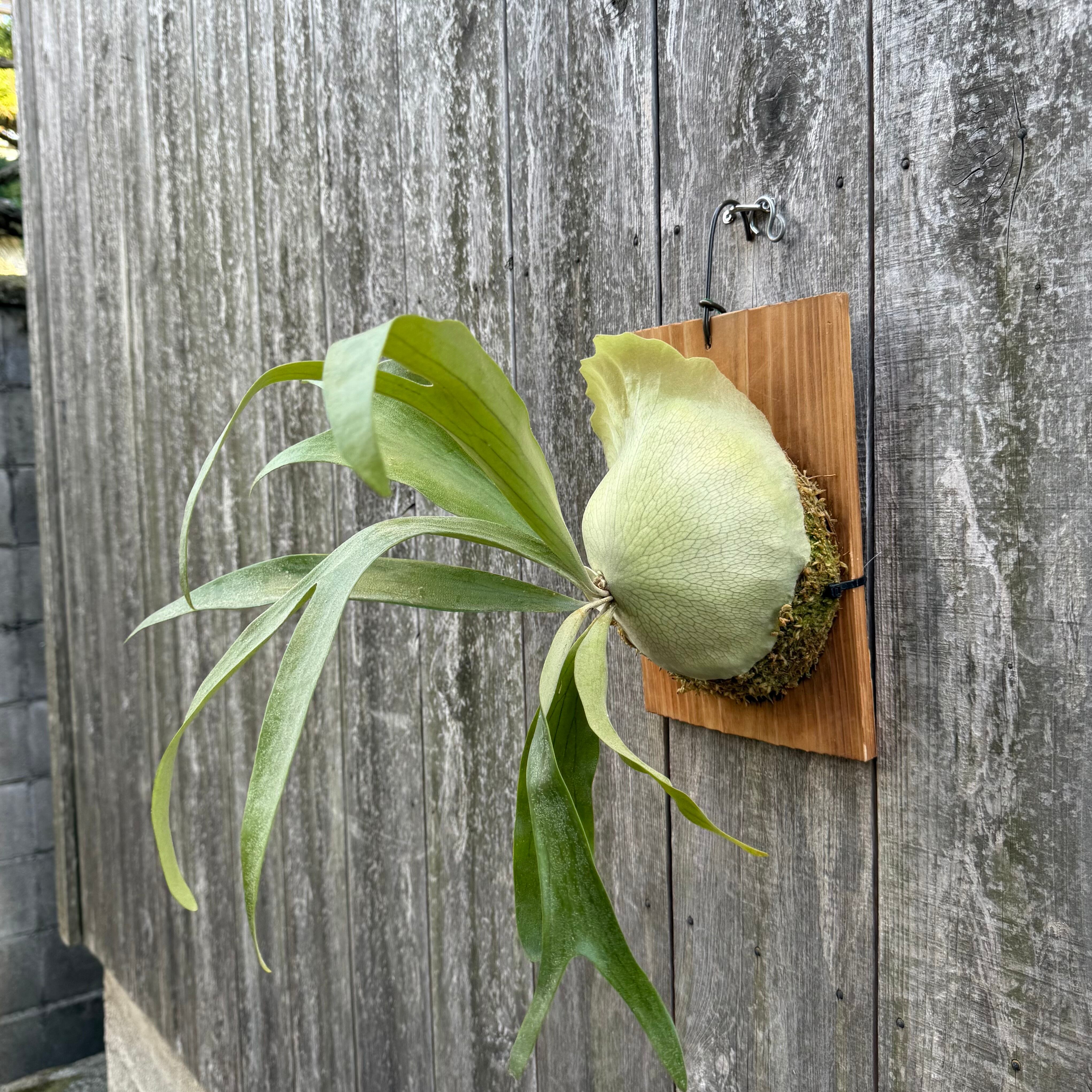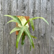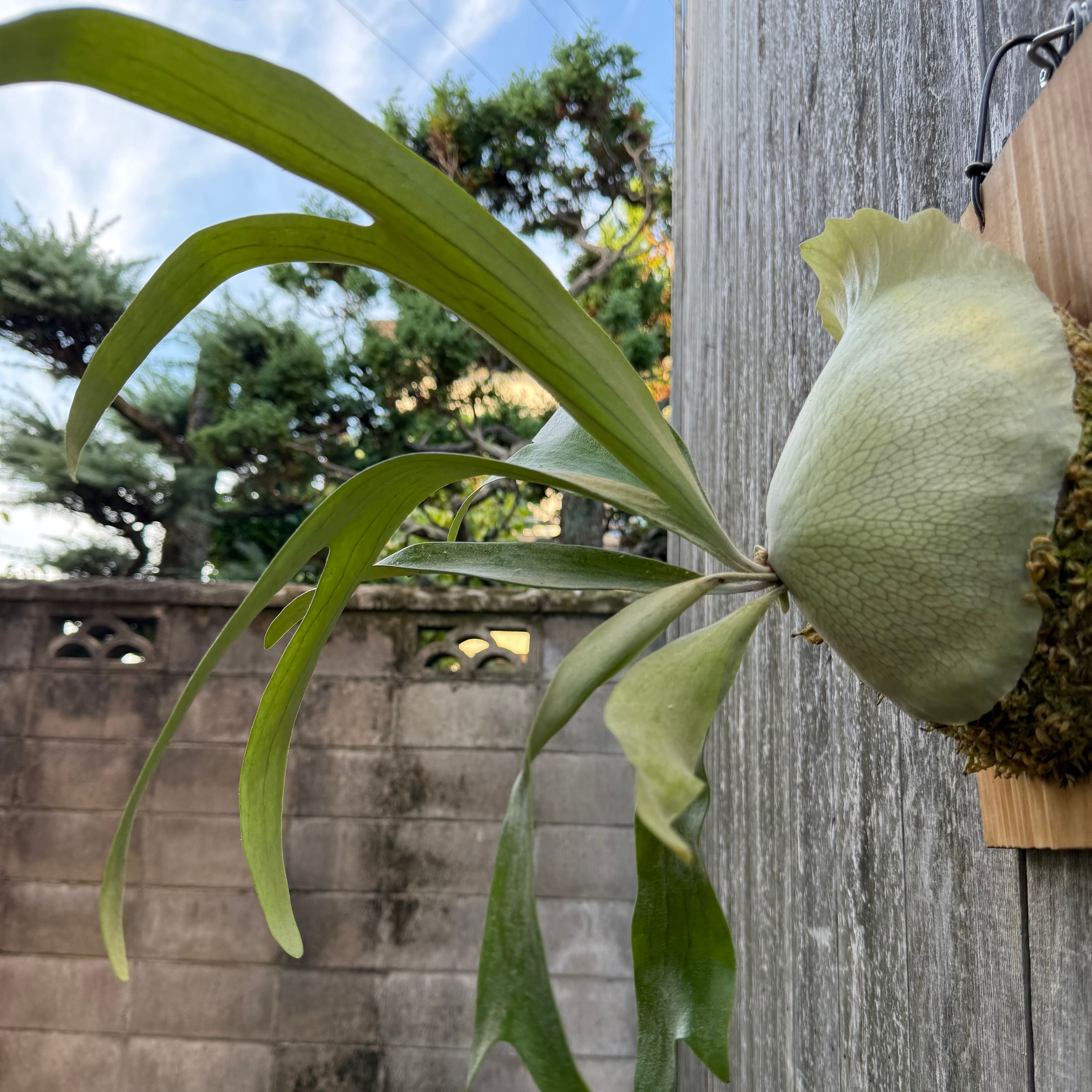 上向に伸びてから垂れる胞子葉は、優雅で美しい姿に成長します。ワイルドのビフルカツムのハイブリッド品種とされ、日本ではかなり希少な品種になります。CK Pavilion から仕入れた株からの子株となります。